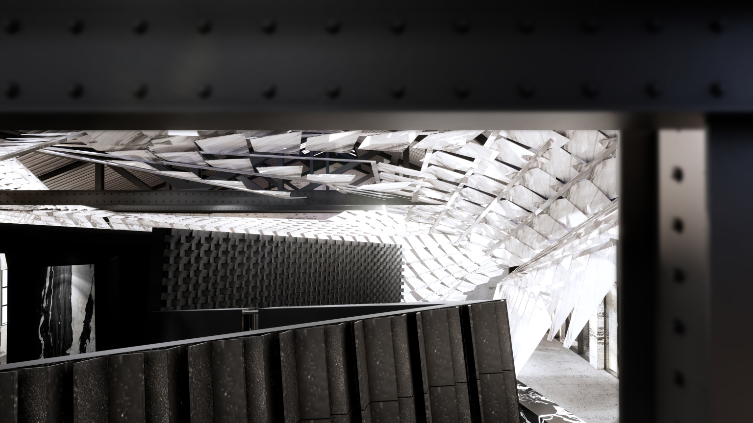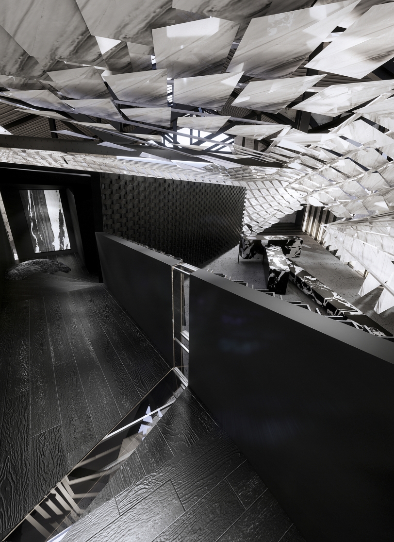 Visitors are greeted by distinct small buildings that showcase diverse stone materials and construction techniques. The entrance features a suspended translucent curtain crafted from white thin sintered stone slate. Inside, a black stone-clad sanctuary leads to a curved staircase enveloped in golden stone slates. A metallic VIP chamber with an intricately tiled wooden interior awaits, evoking the sensation of navigating through a diverse metropolis.