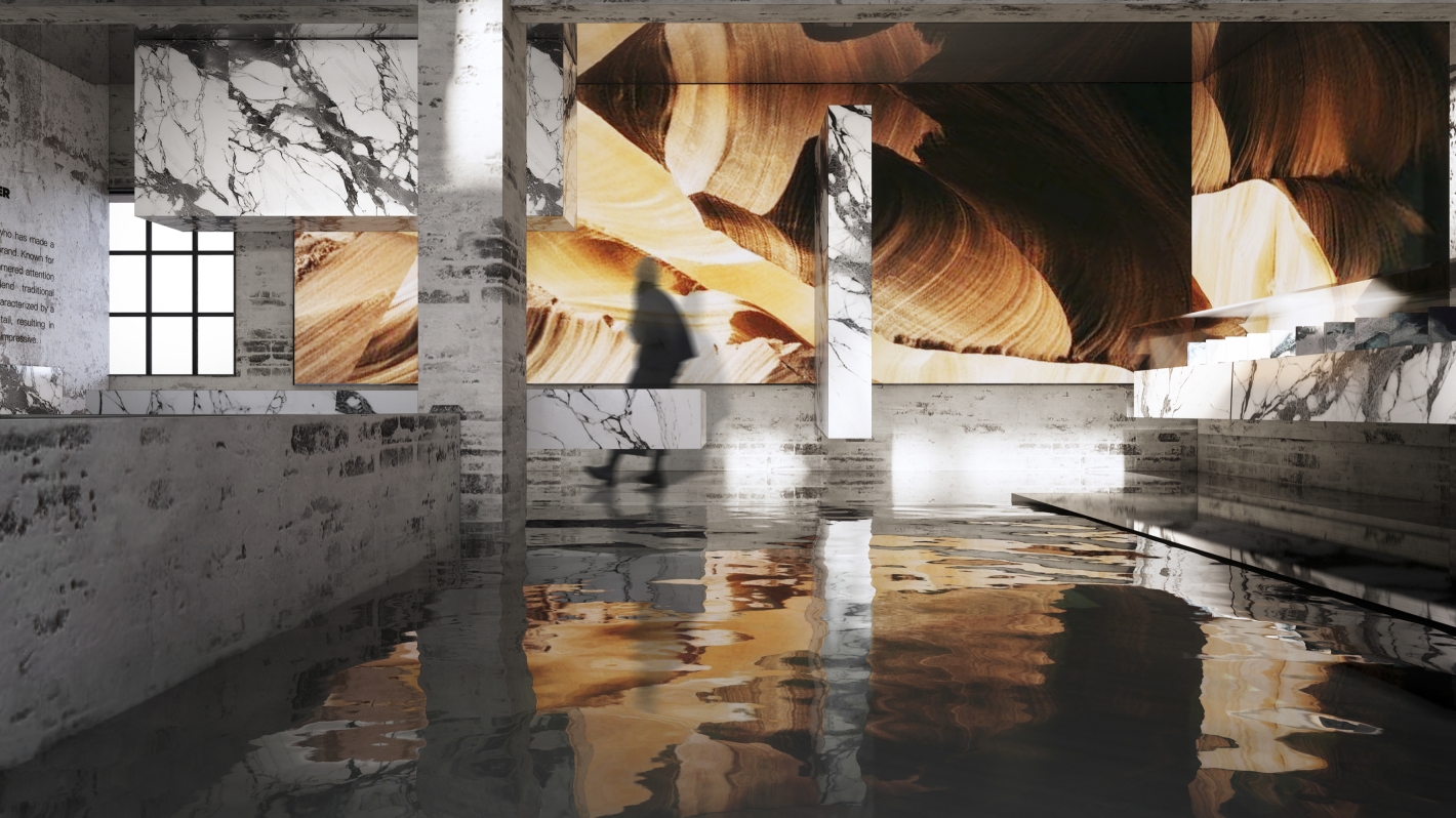 Further exploration reveals a showroom without boundaries, where stone volumes seemingly float, mirrored ceilings reflect, and LED screens depict the story behind each material. Towards the end of the journey, visitors encounter stone sculpture serves as a bar counter, allowing visitors to convene and discuss incorporating these materials into their own spaces.