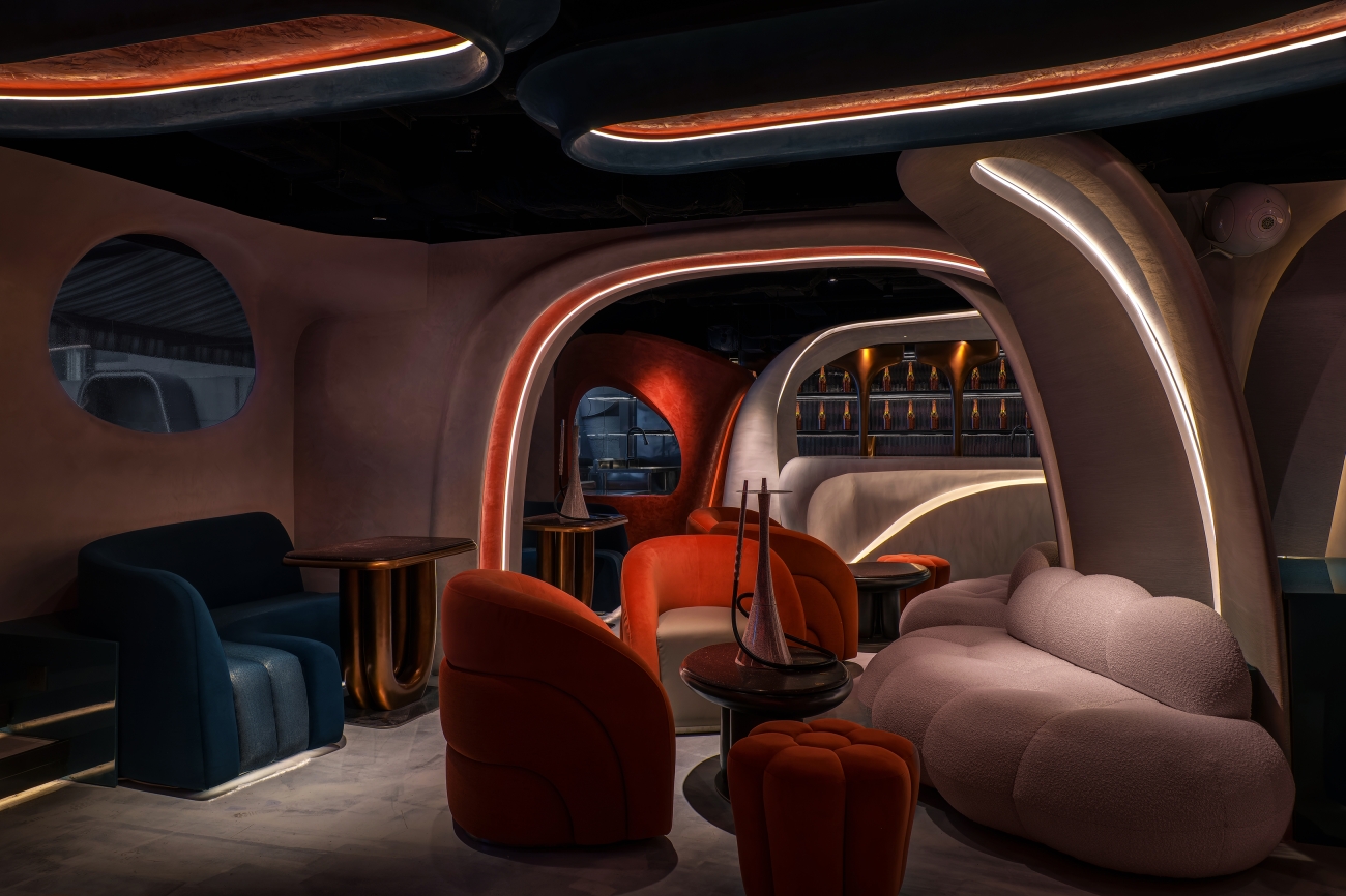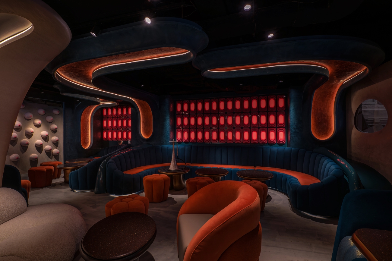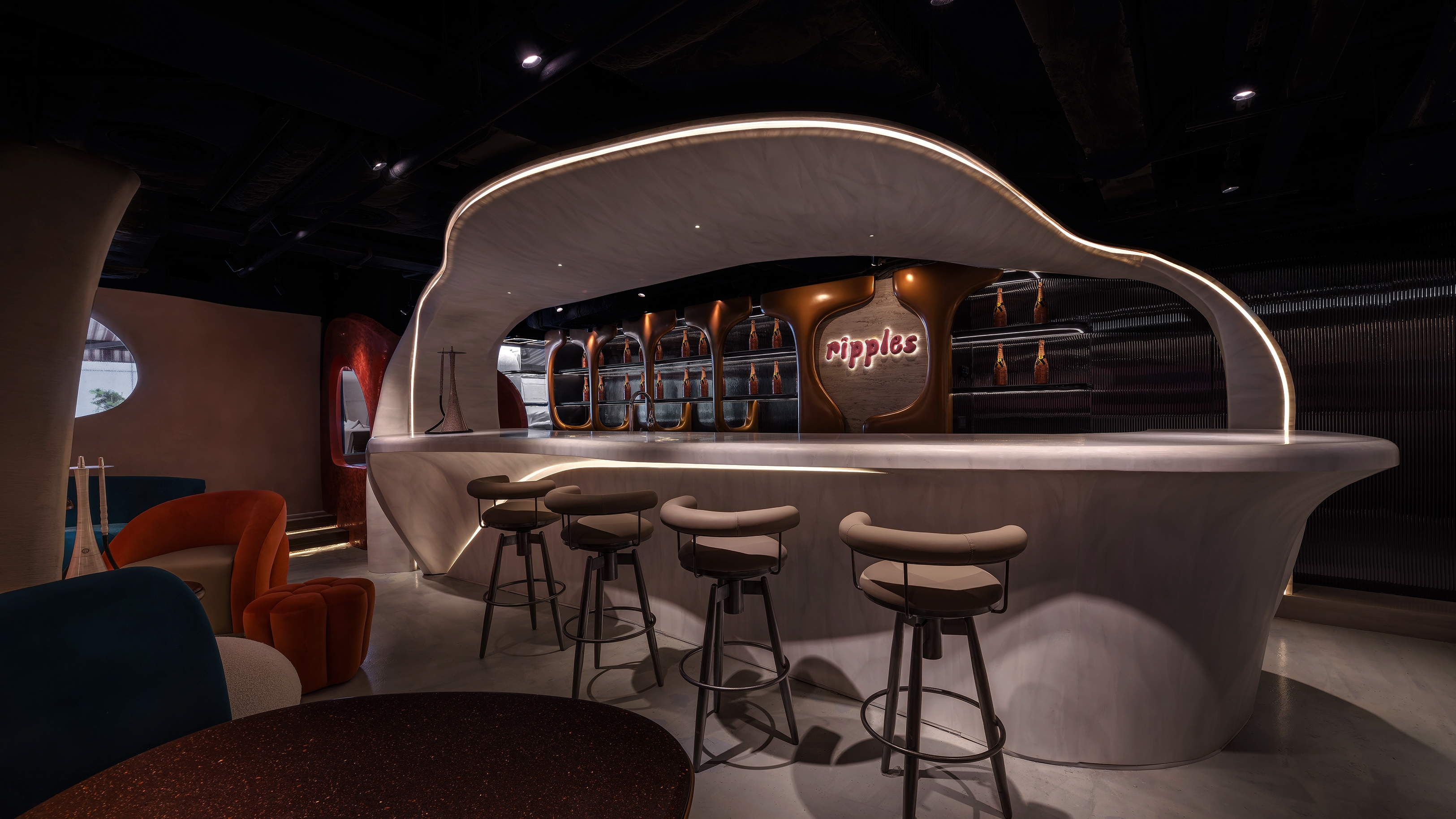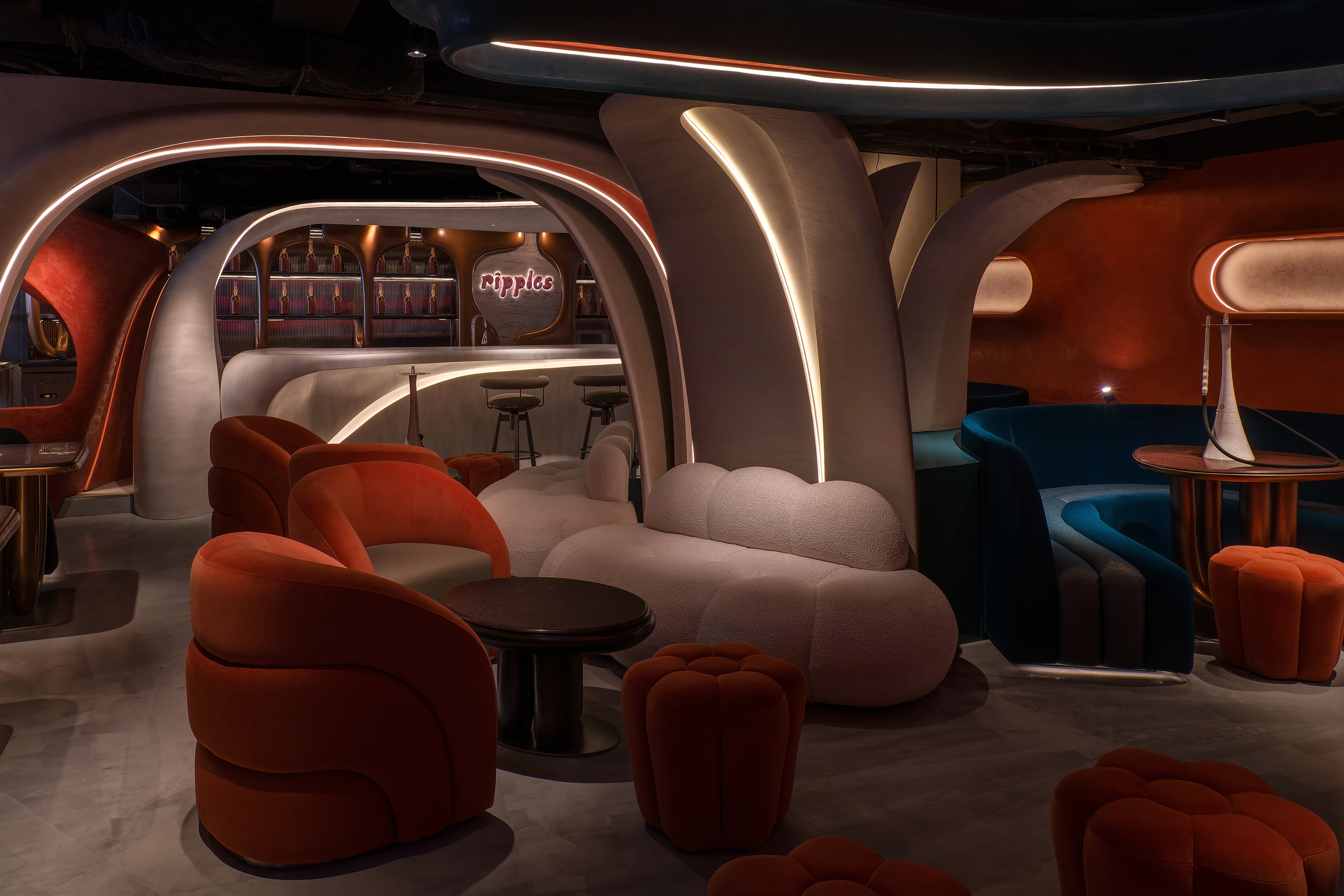The objective of the Ripples project is to create a beachside sunset environment for patrons to unwind in the middle of the bustling city of Hong Kong. The design concept incorporates wave-like curvilinear forms and bold colours. By incorporating these fluid curves, the design adds visual connectivity, while capturing attention with the loud immersive contrast of colours. The interior space is enhanced through the integration of a state-of-the-art lighting control system and RGB LED matrix feature wall, intensifying the ambiance and mood of the space.
