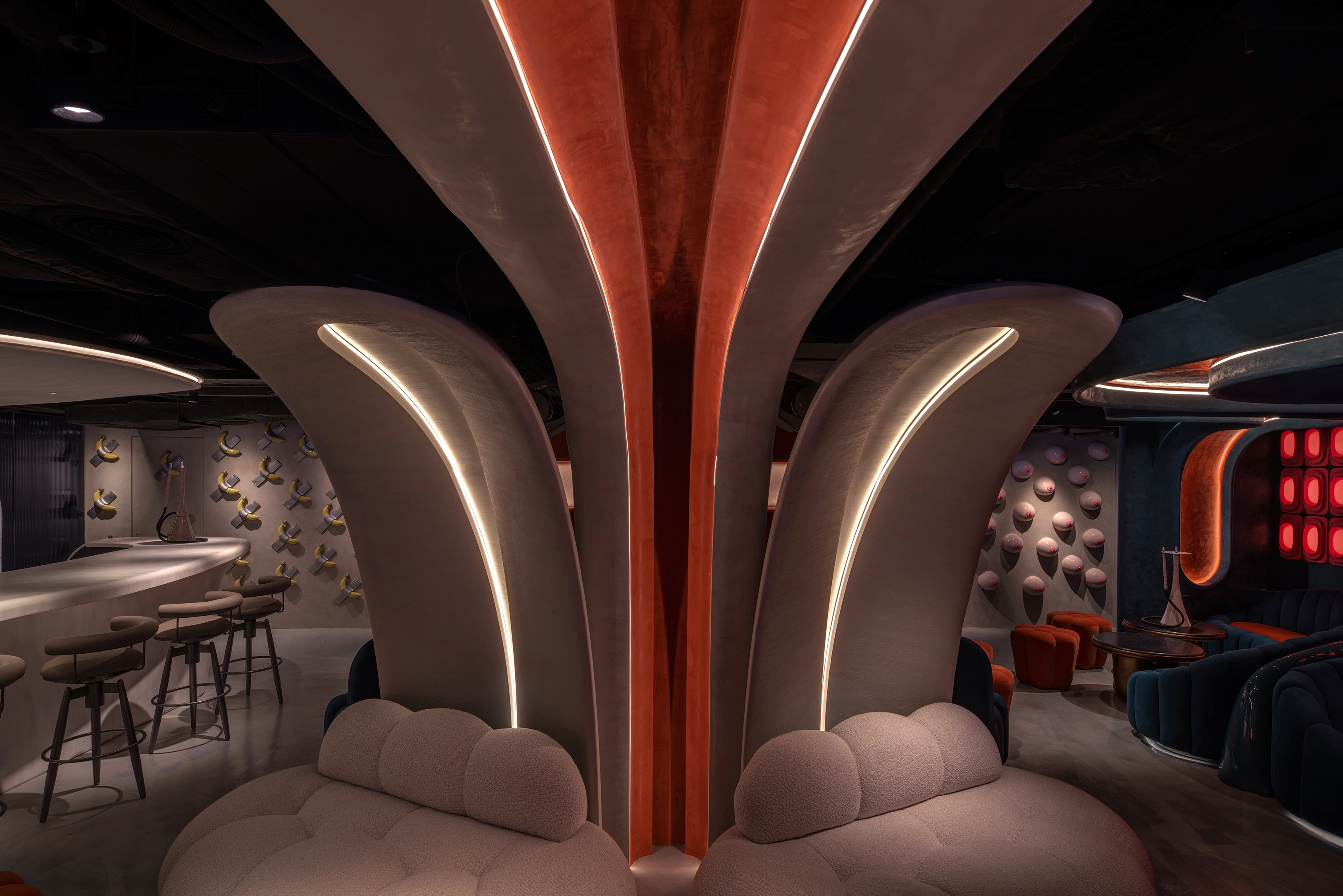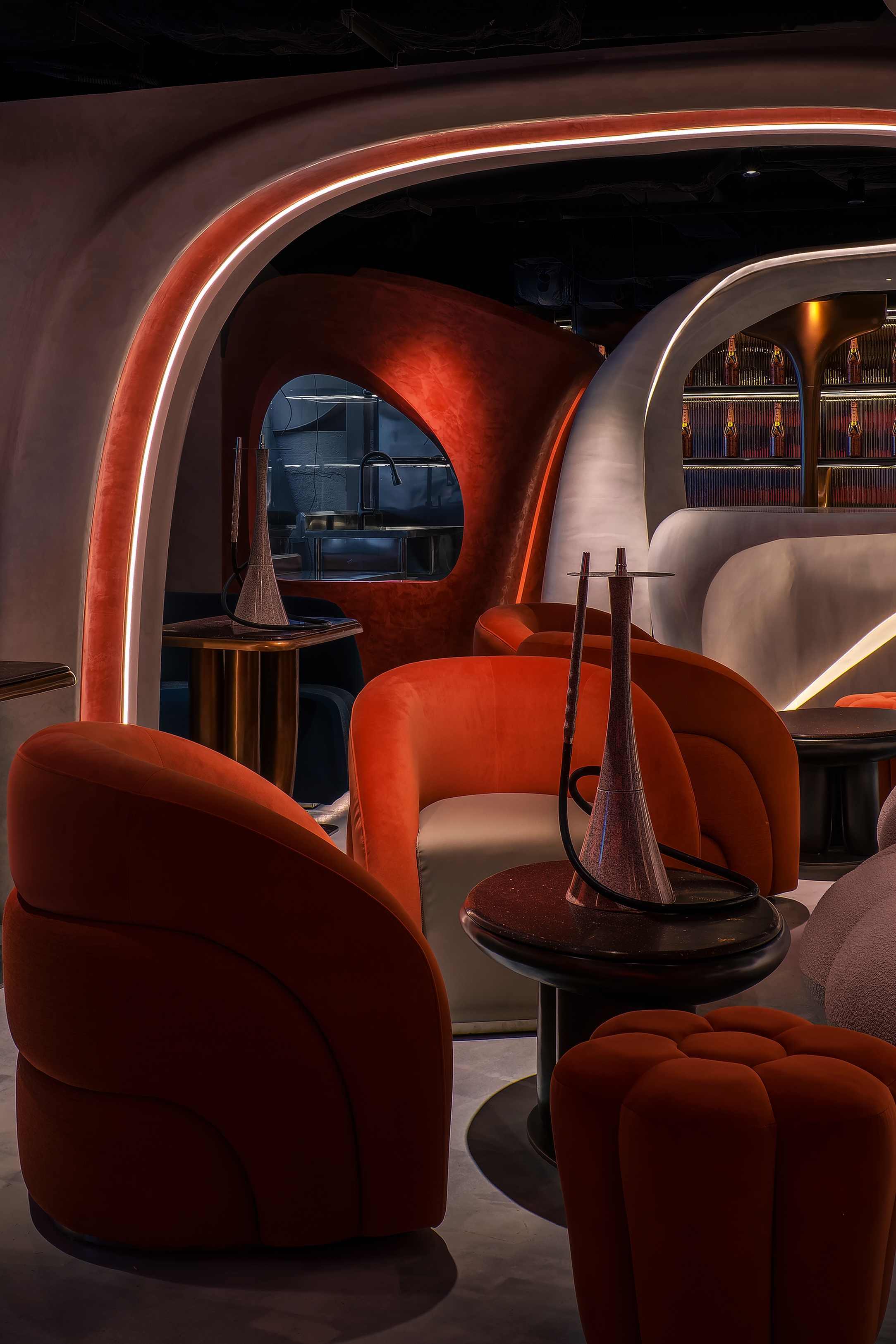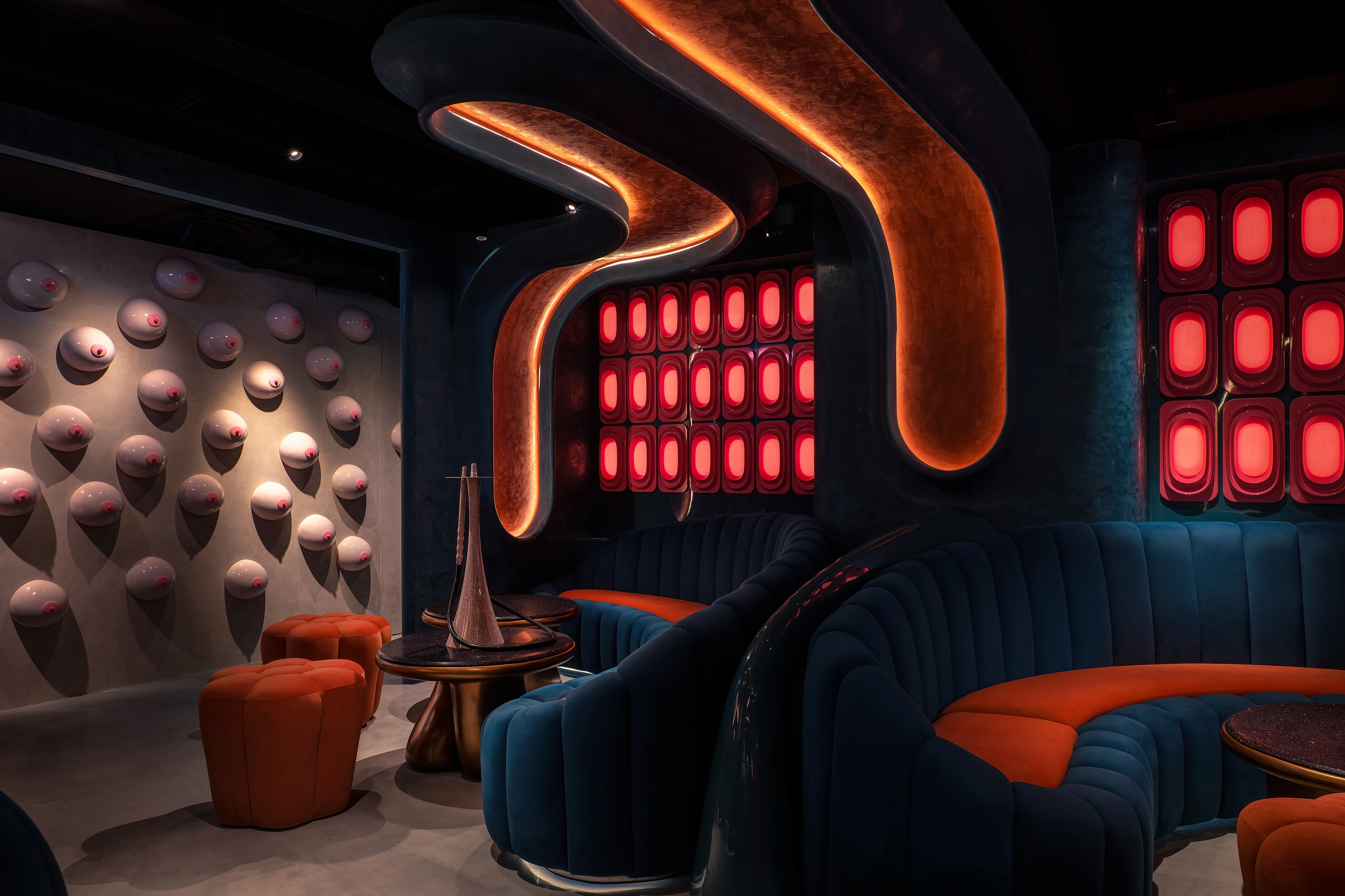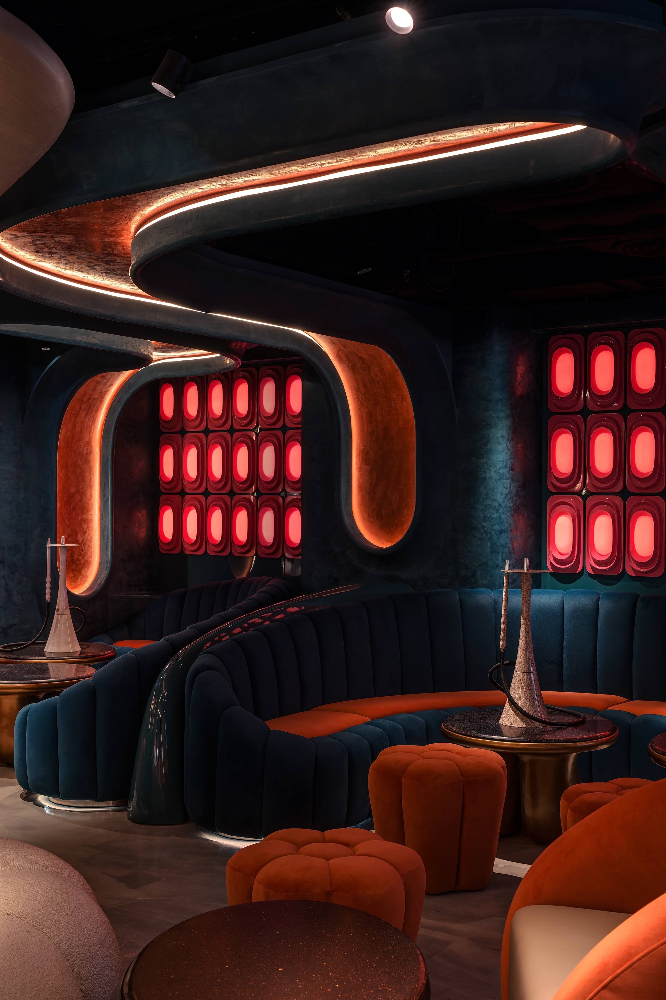 The objective of the Ripples project is to create a beachside sunset environment for patrons to unwind in the middle of the bustling city of Hong Kong. The design concept incorporates wave-like curvilinear forms and bold colours. By incorporating these fluid curves, the design adds visual connectivity, while capturing attention with the loud immersive contrast of colours. The interior space is enhanced through the integration of a state-of-the-art lighting control system and RGB LED matrix feature wall, intensifying the ambiance and mood of the space.