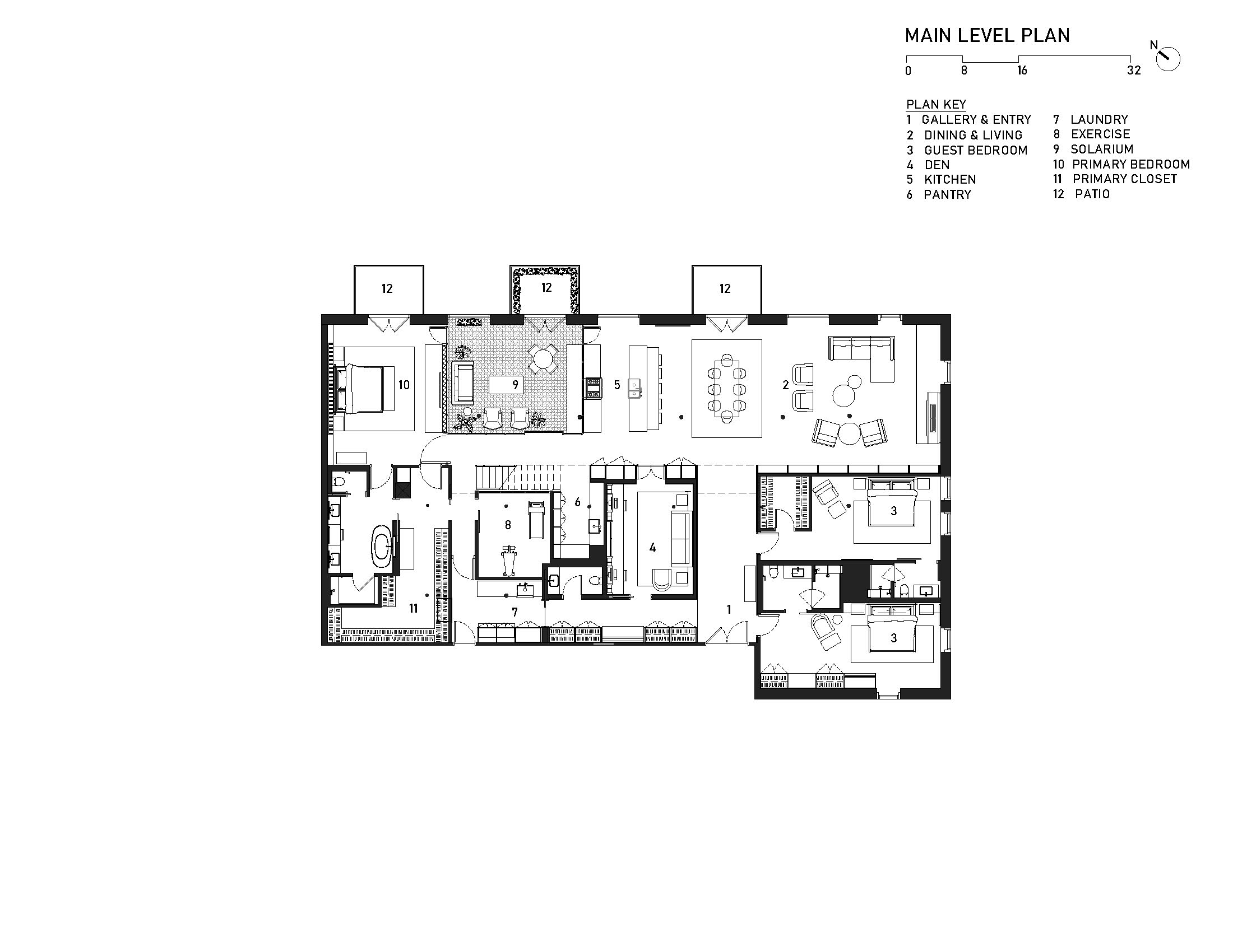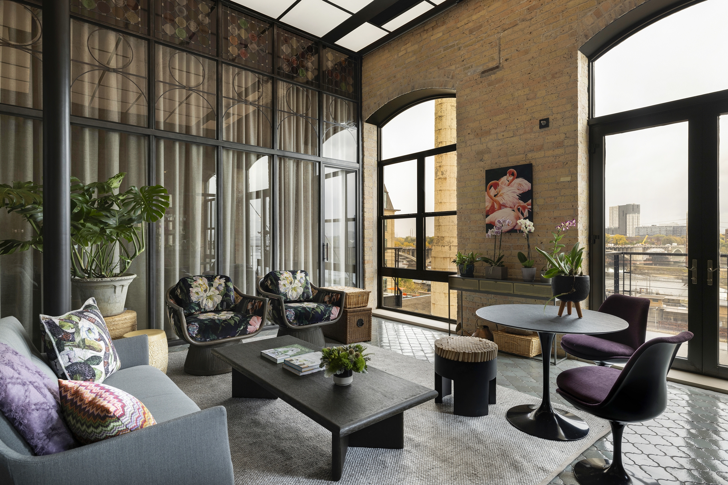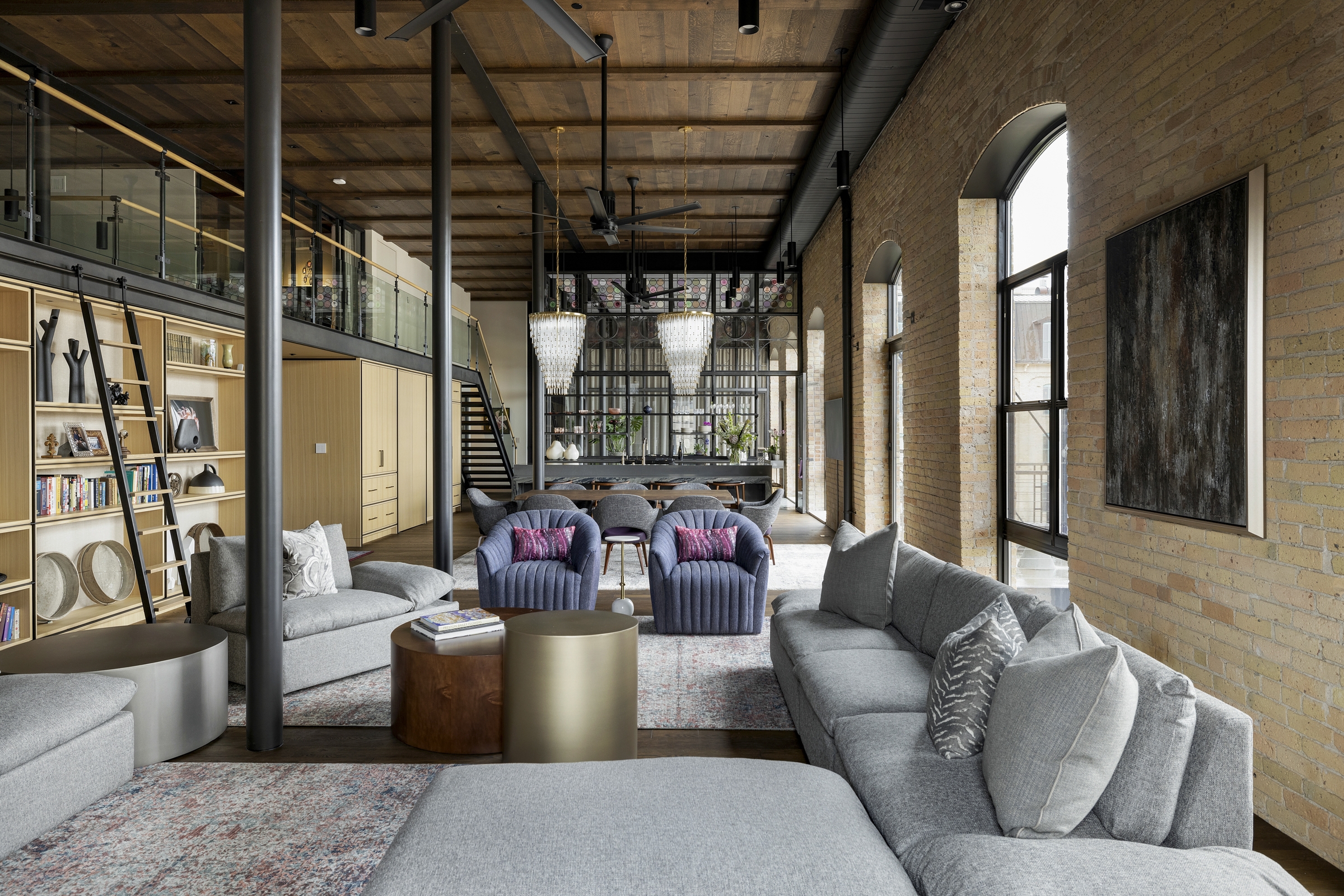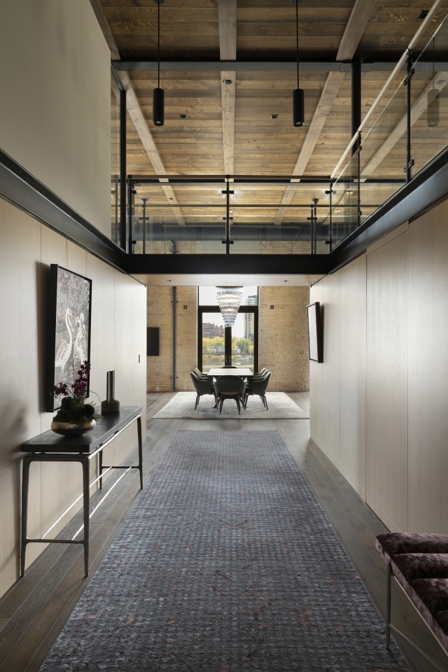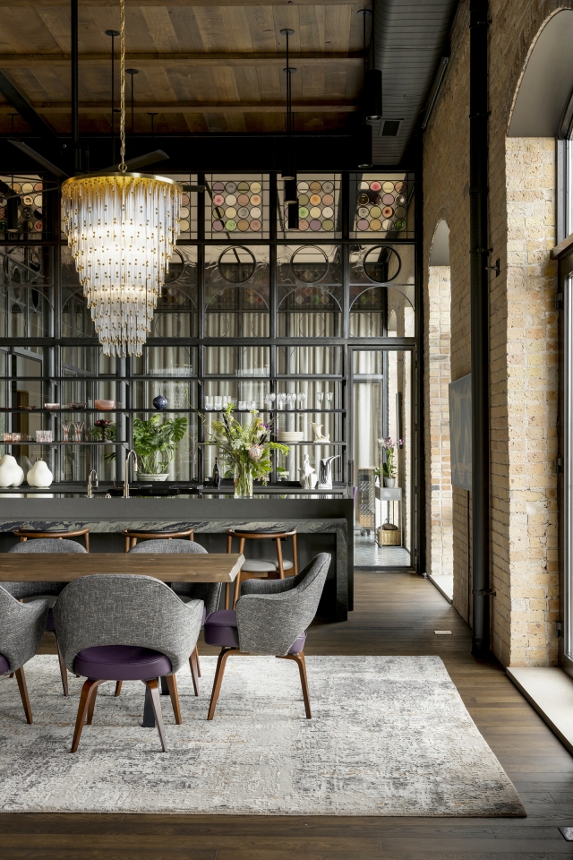 This unique 470 sq. meter residence was transformed from a raw industrial shell, once a historic flour mill, into an elegant and artful home overlooking the Mississippi River. The owner, moving from a suburban home to the heart of the city, sought a design that would not only showcase their large art collection but also provide a nod to their former residence in the United Kingdom. Central to the layout is a dramatic solarium, inspired by the iconic Crystal Palace of the Great Exhibition of 1851. Constructed from custom steel and adorned with hand-crafted colored rondels, the solarium evokes the feel of a patio—a cherished feature of the owner's UK home.