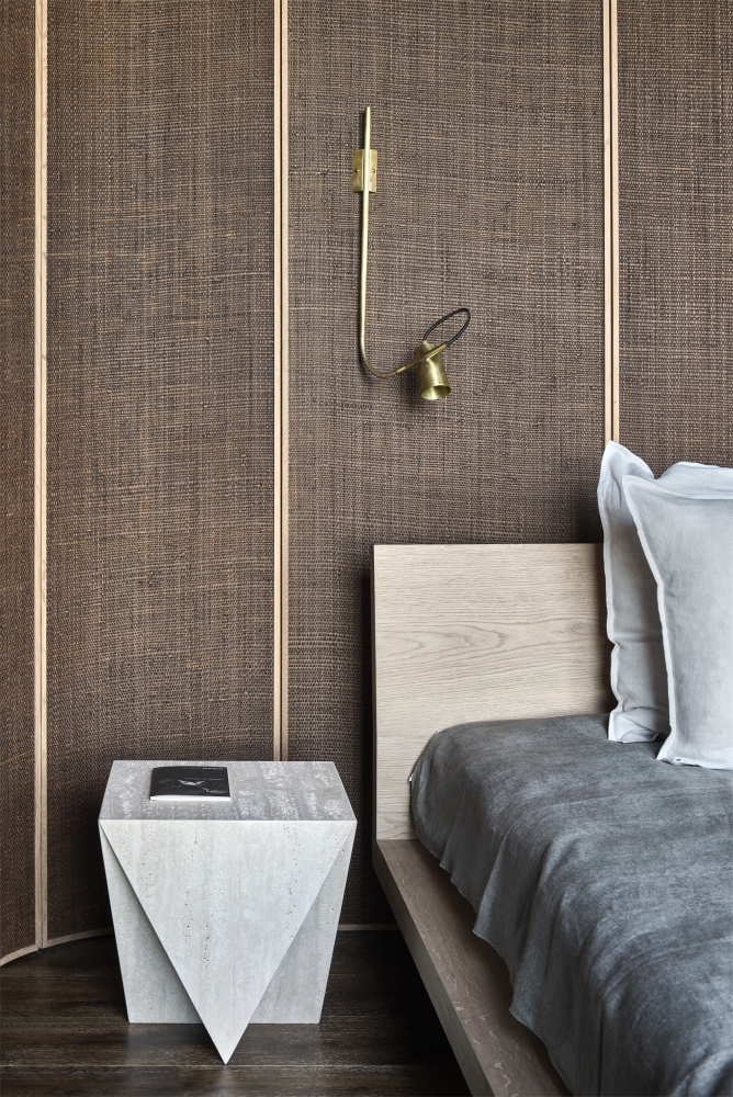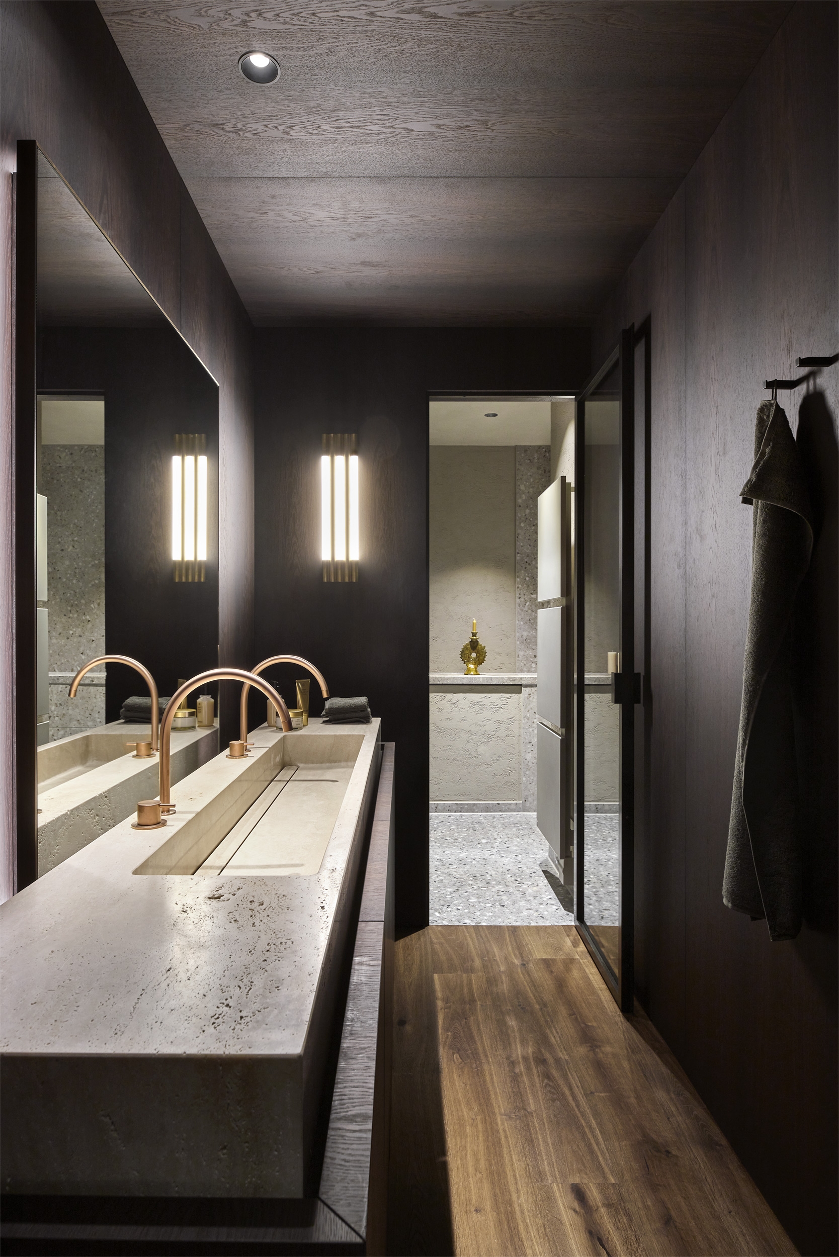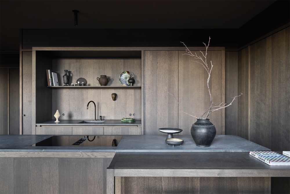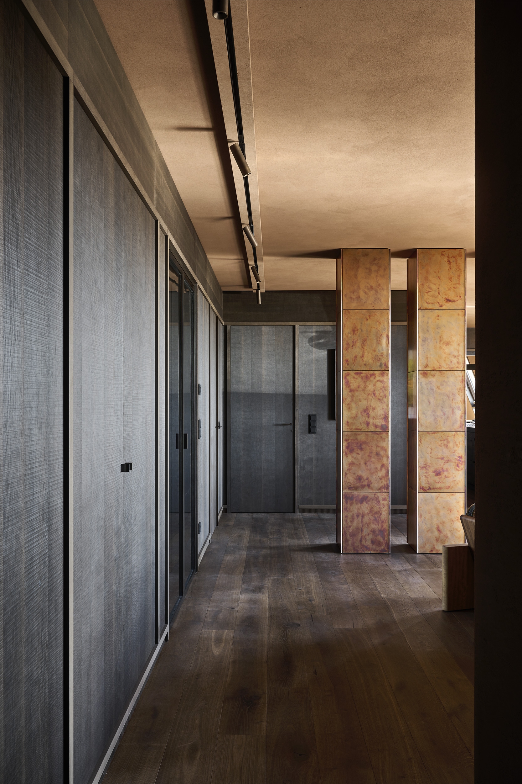 For a residential building in Munich designed by Ben Van Berkel, the editorial team of AD together with the project developers of Bauwerk selected ten of the leading interior design offices to design ten penthouses in different sizes according to their ideas. We designed and completely furnished this 168sqm apartment. A play of contrasts already laid out in the spatial layout and balanced in the harmony of form, color and material. Warmly surrounded by a wall paneling in dark wood, which separates the public part- living area with its open kitchen - from the privately used rooms - master suite with open bathroom and a study. The design pays particular attention to the staging of different surfaces, which playfully disrupt the pristine nature of the new building juxtaposing patina with smoothness, roughness with with sleekness - plaster against wood, patinated brass against natural stone. Organic liveliness and formal rigor merge in an entirely holistic concept that also includes almost all furnishings with specially designed and executed manufactured furniture and light objects. Timeless, consistent, and highly functional, yet also infused with an underlying nonchalance.