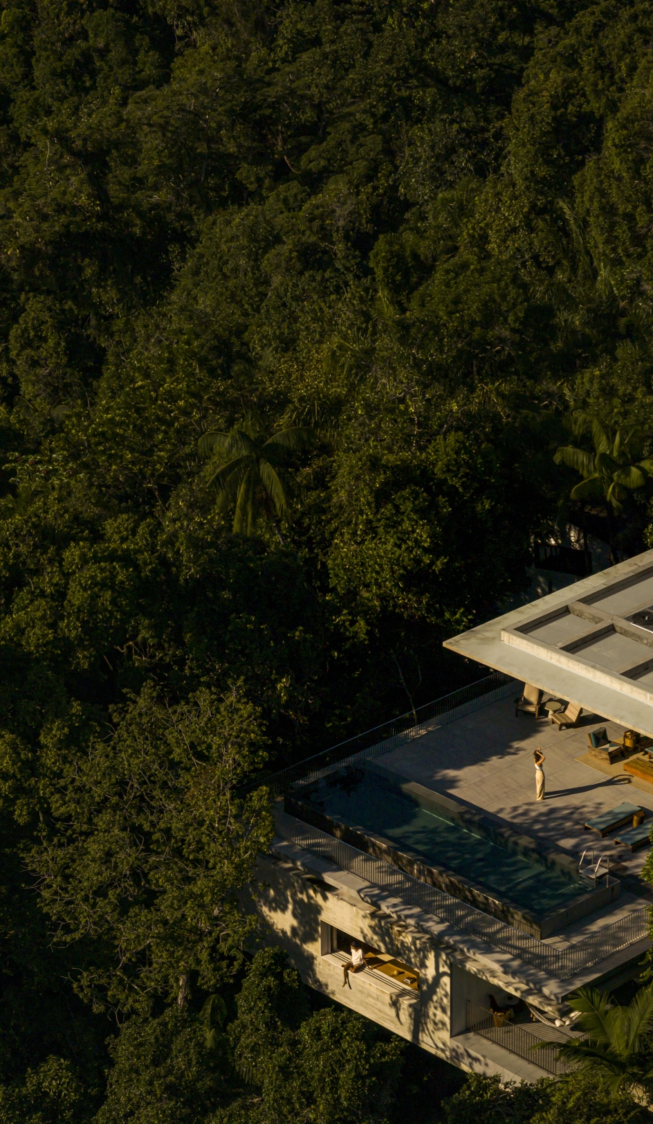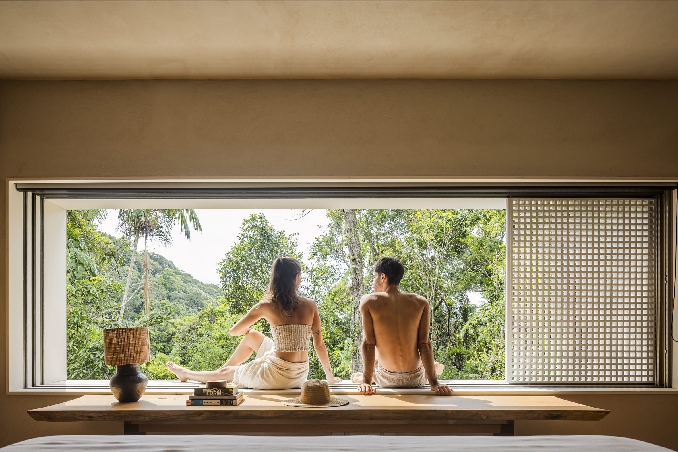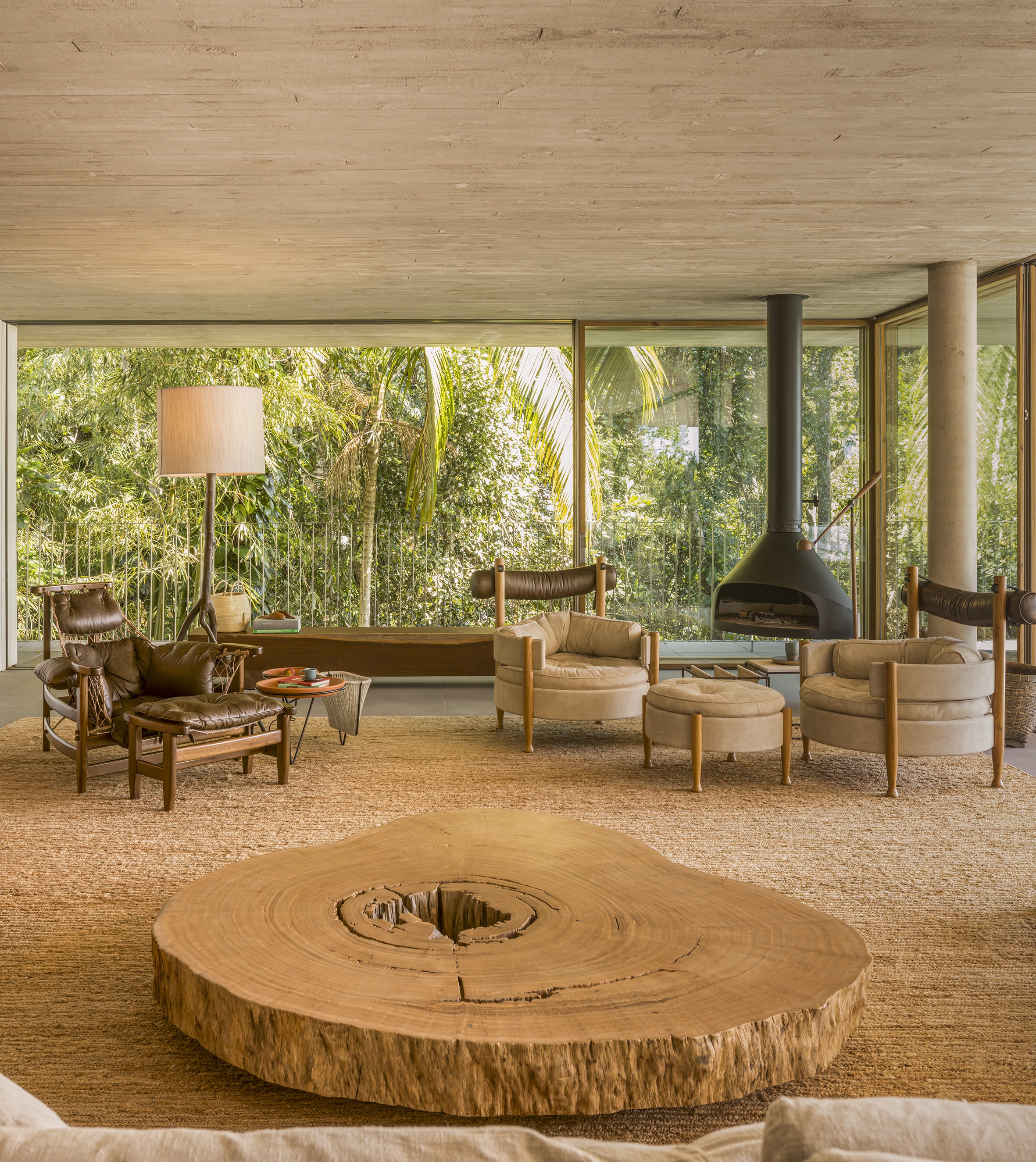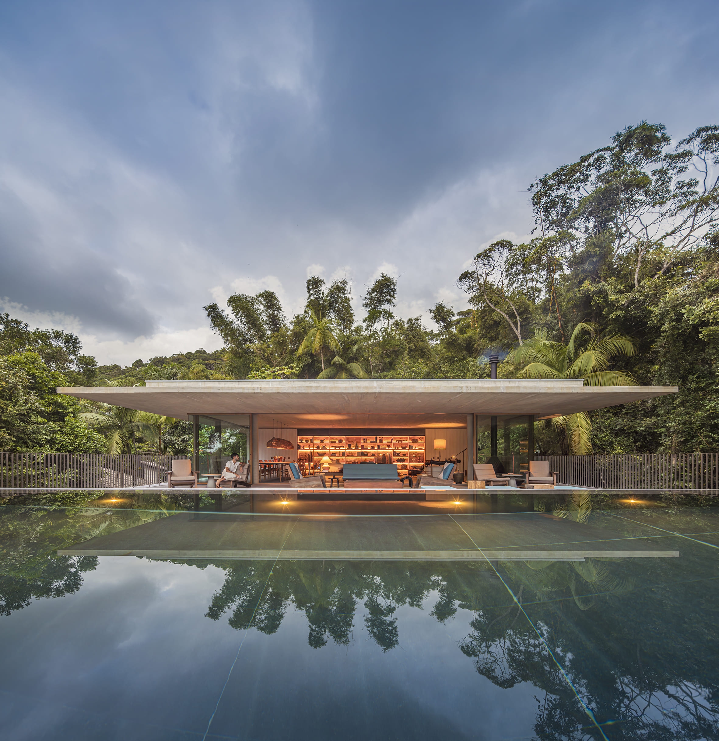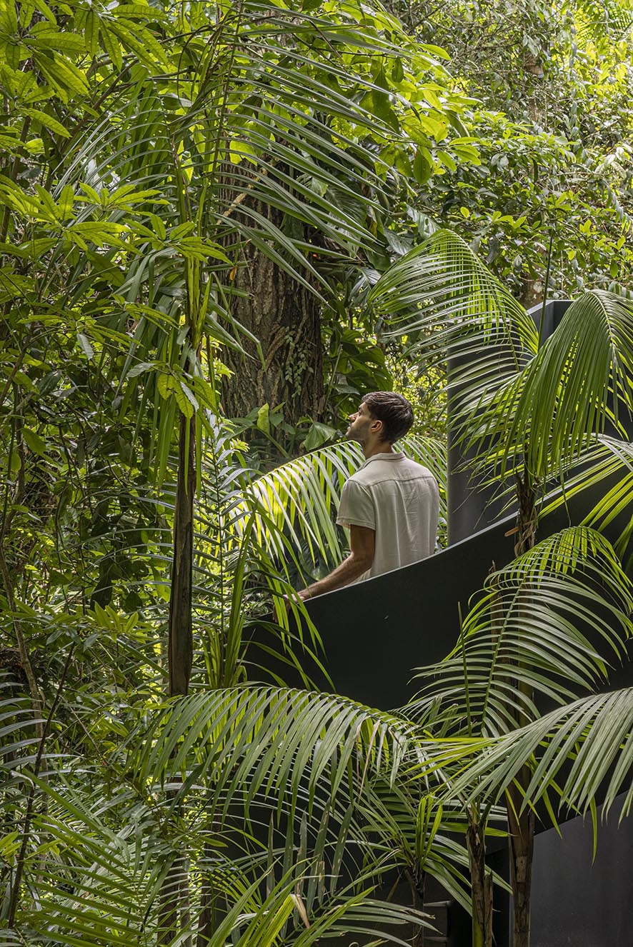 Above the prism, an elevated platform that overlooks the canopies. A very light structure, inside the limits of the platform, covers the living area enclosed by sliding glass panels. The transition between inside and outside spaces is extremely subtle, creating a constant and intense feeling of immersion at the Atlantic Forest.