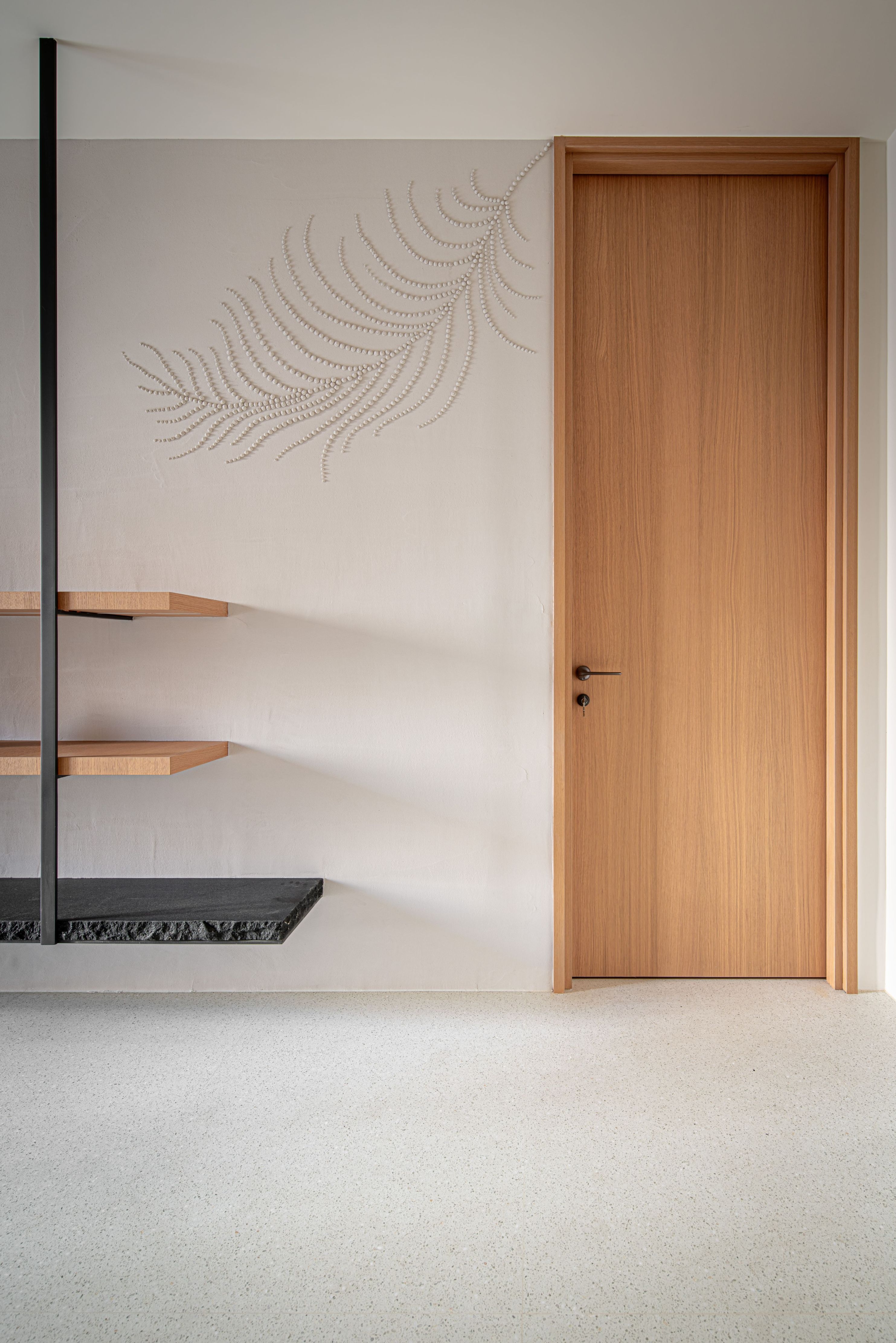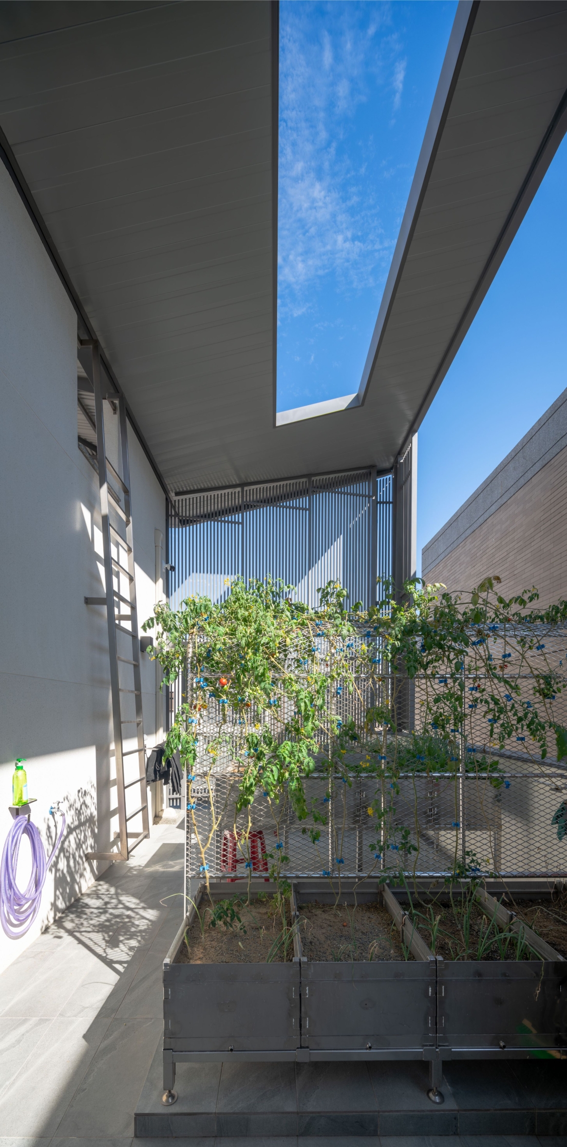 The design perfectly balances privacy and transparency. Most windows face the center of the house, with the atrium and a large terrace providing ample natural light and fresh air. A special route and stairway allow people direct access to the second-floor terrace without entering the main house. This route also accommodates the father's love for boat fishing, allowing easy transport of equipment and catch to storage and the kitchen.