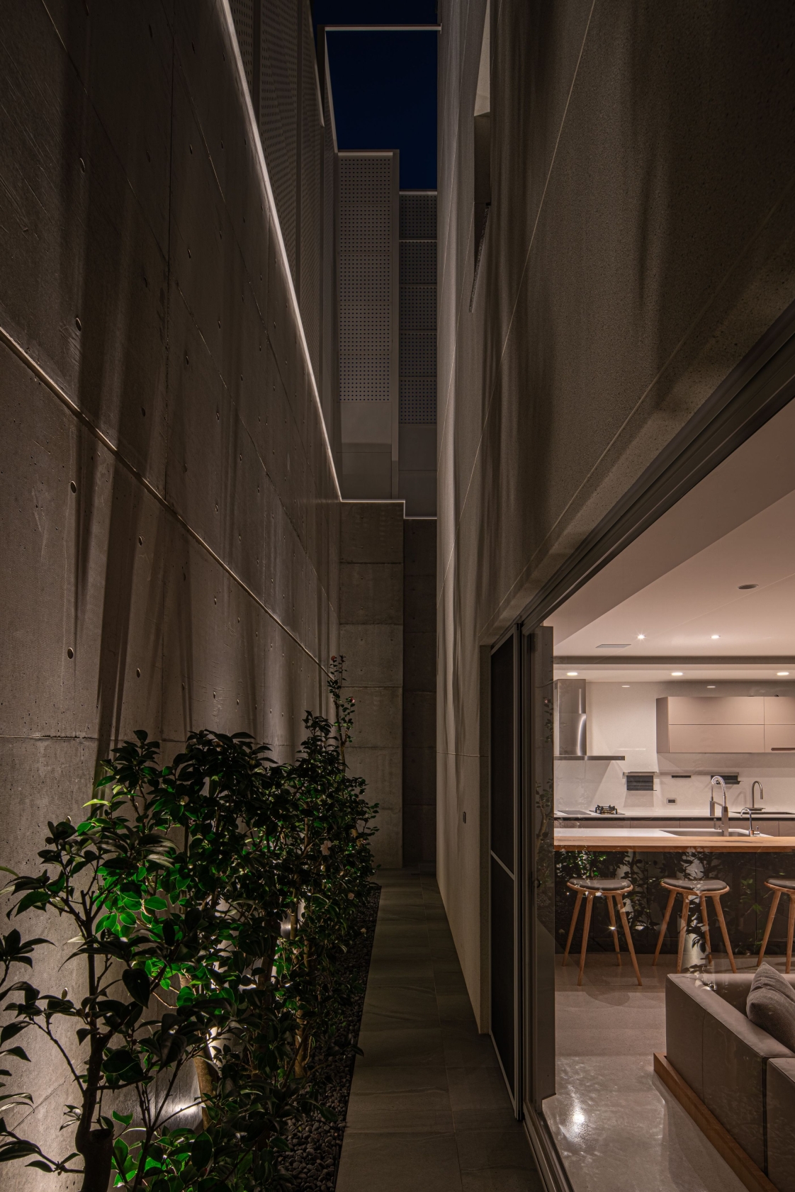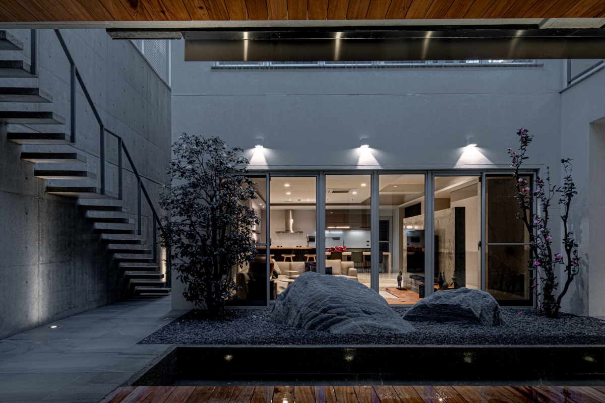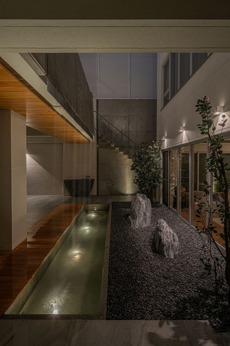 Tsubaki, the Japanese word for camellia, which are grown at the residence. These flowers provide a touch of Zen and emotional support for the homeowners. In the living room, a sunken sofa area enhances openness, allowing unobstructed views of the garden and water curtain from the dining area.