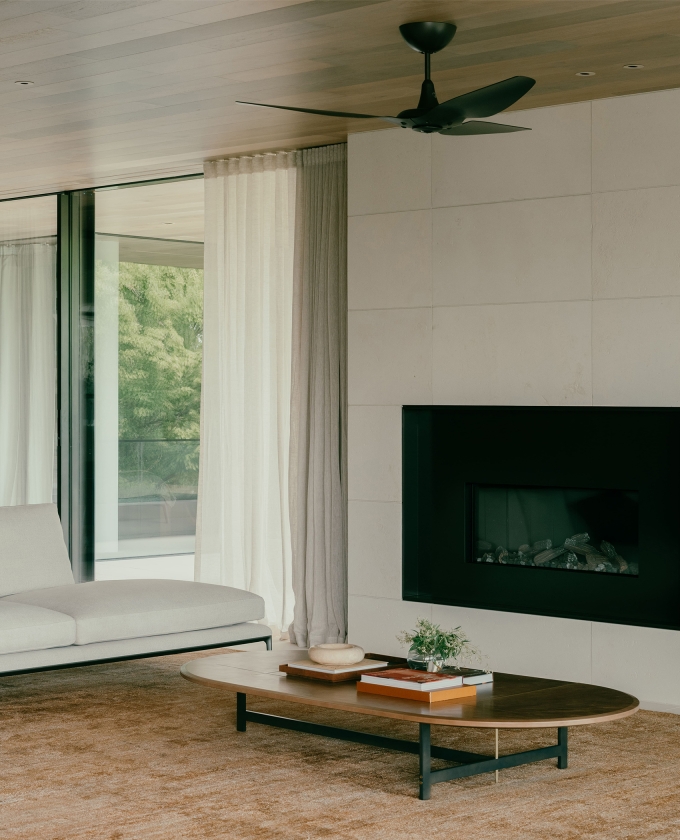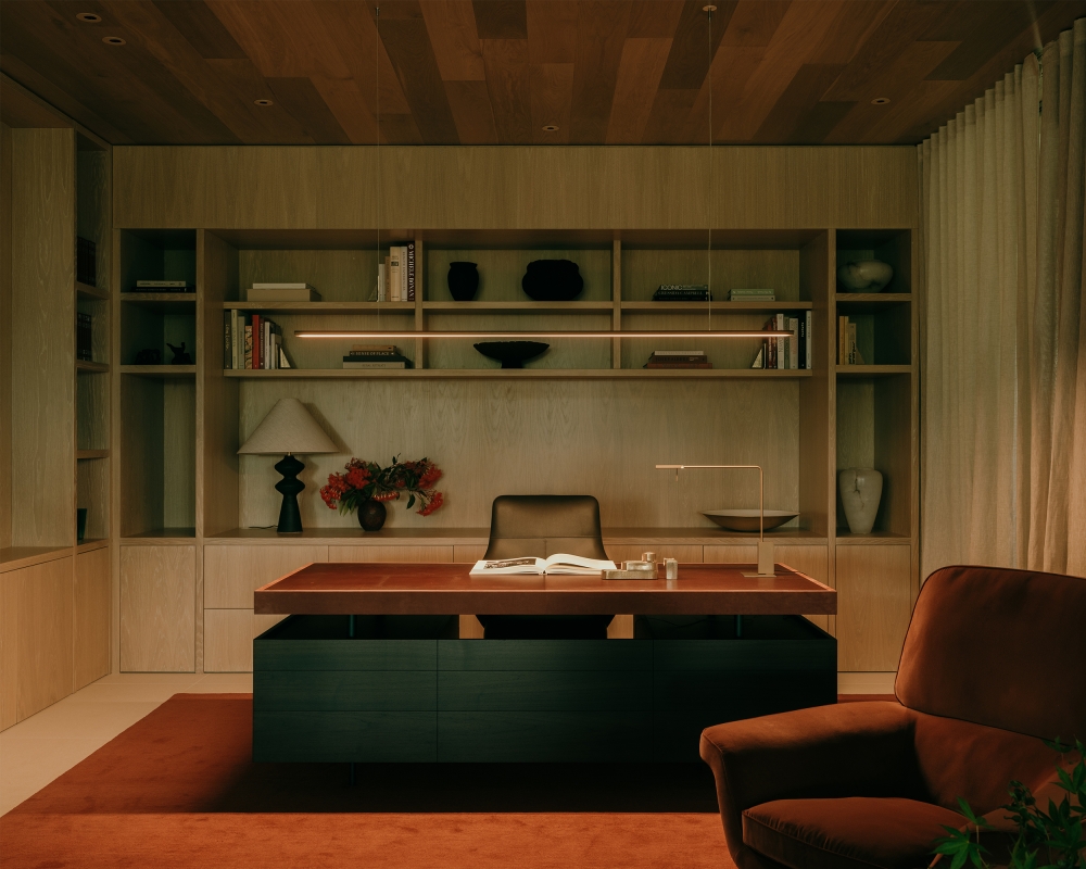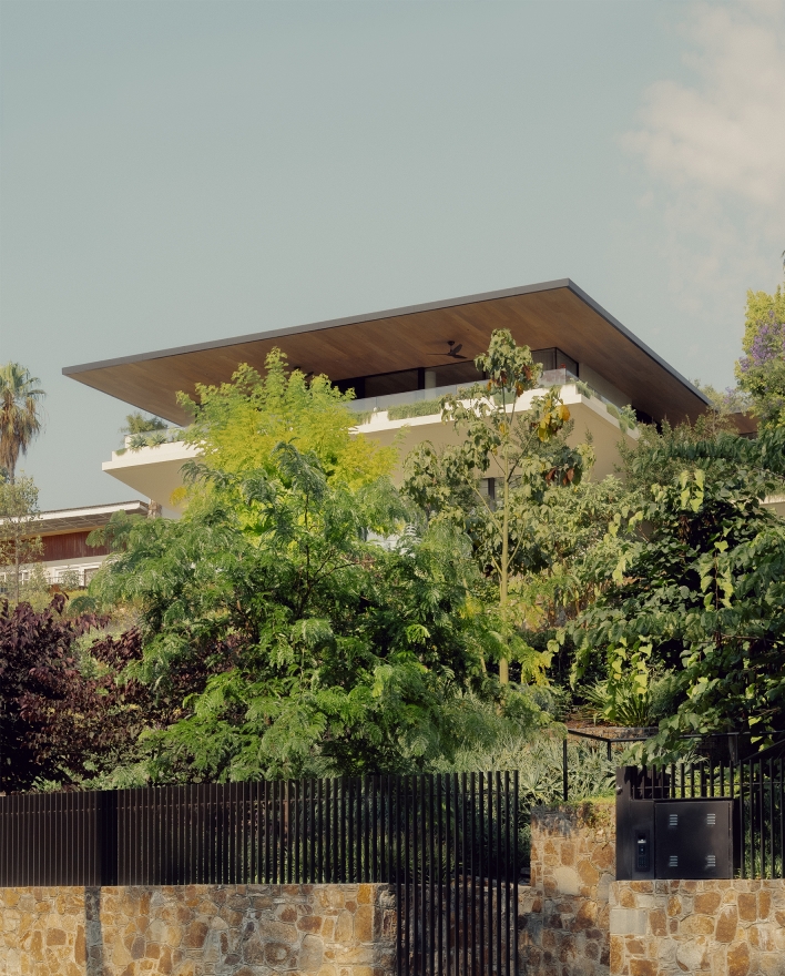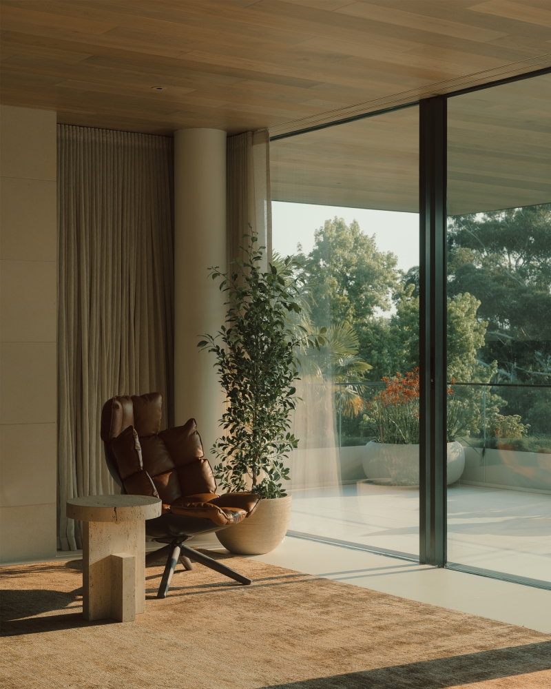 The setting of Hillside Residence among gardens informed the natural palette of materials inside. Warm, timber-lined ceilings cocoon the large open spaces, while a layered approach to textures and colours adds richness and depth.