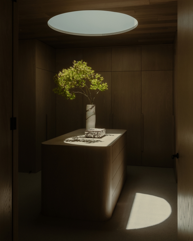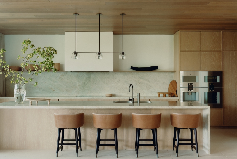 The materials include natural American oak crown cut timber, engineered timber and solid timber. Feature stonework includes onyx in the main ensuite and quartzite to the kitchen benchtop and splashback. Undyed yak wool carpet was selected for bedrooms.