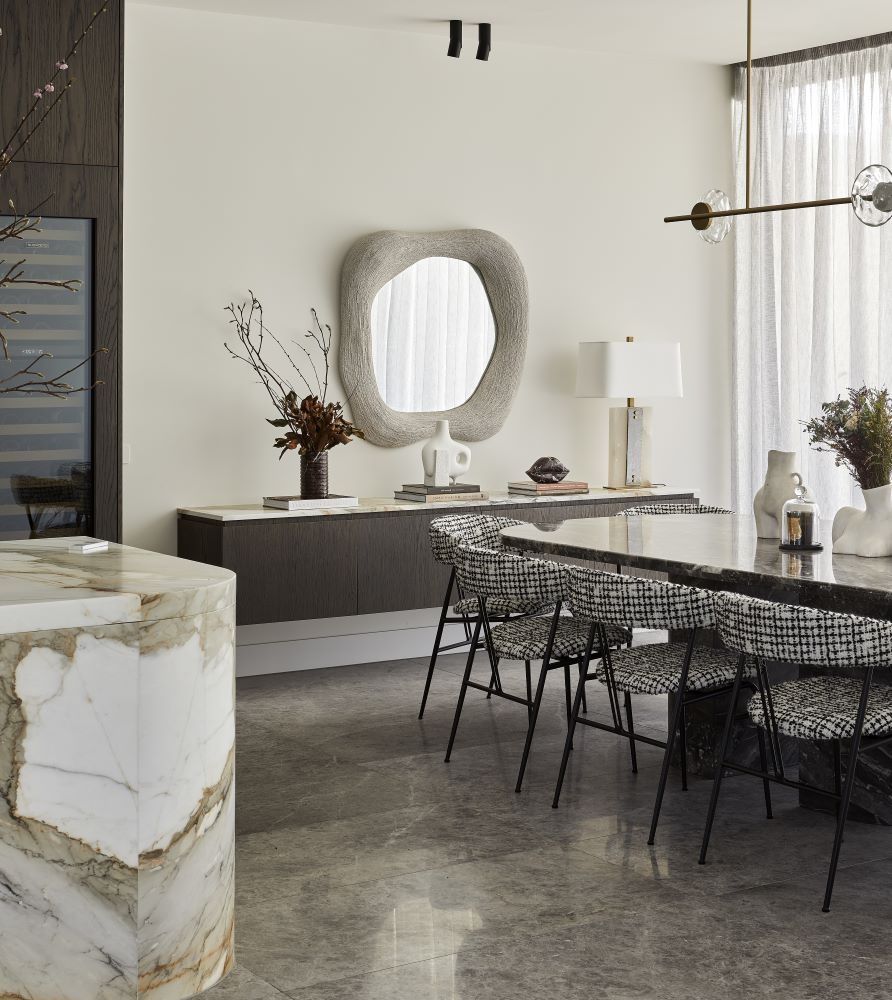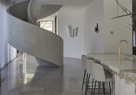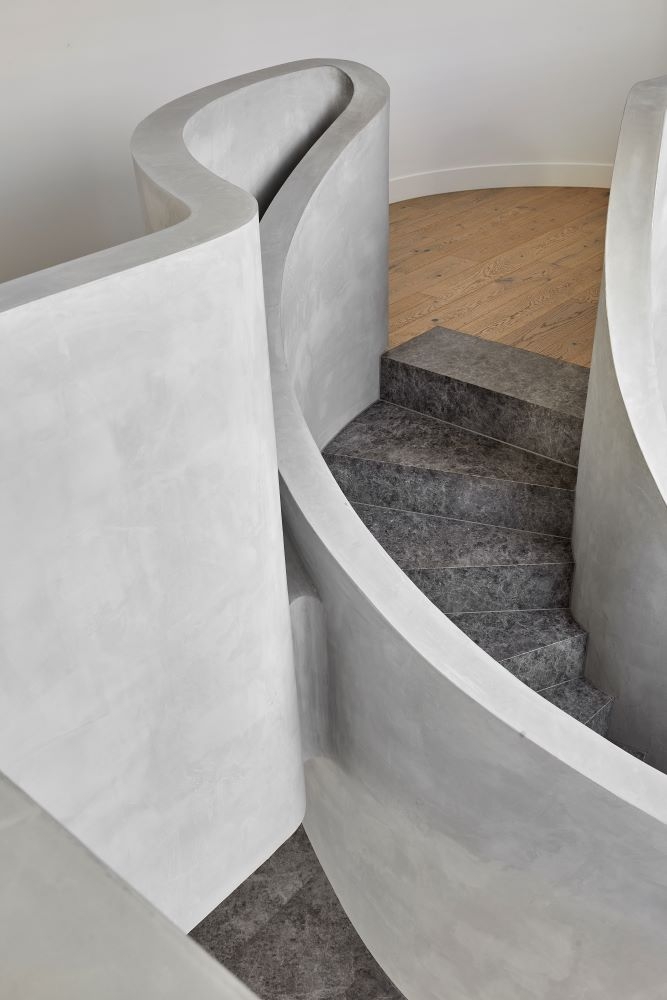 A sculptural central staircase connecting the two levels elevates the living experience with a sense of intrigue yet intentionally defining the surrounding living spaces for a more intimate settings.