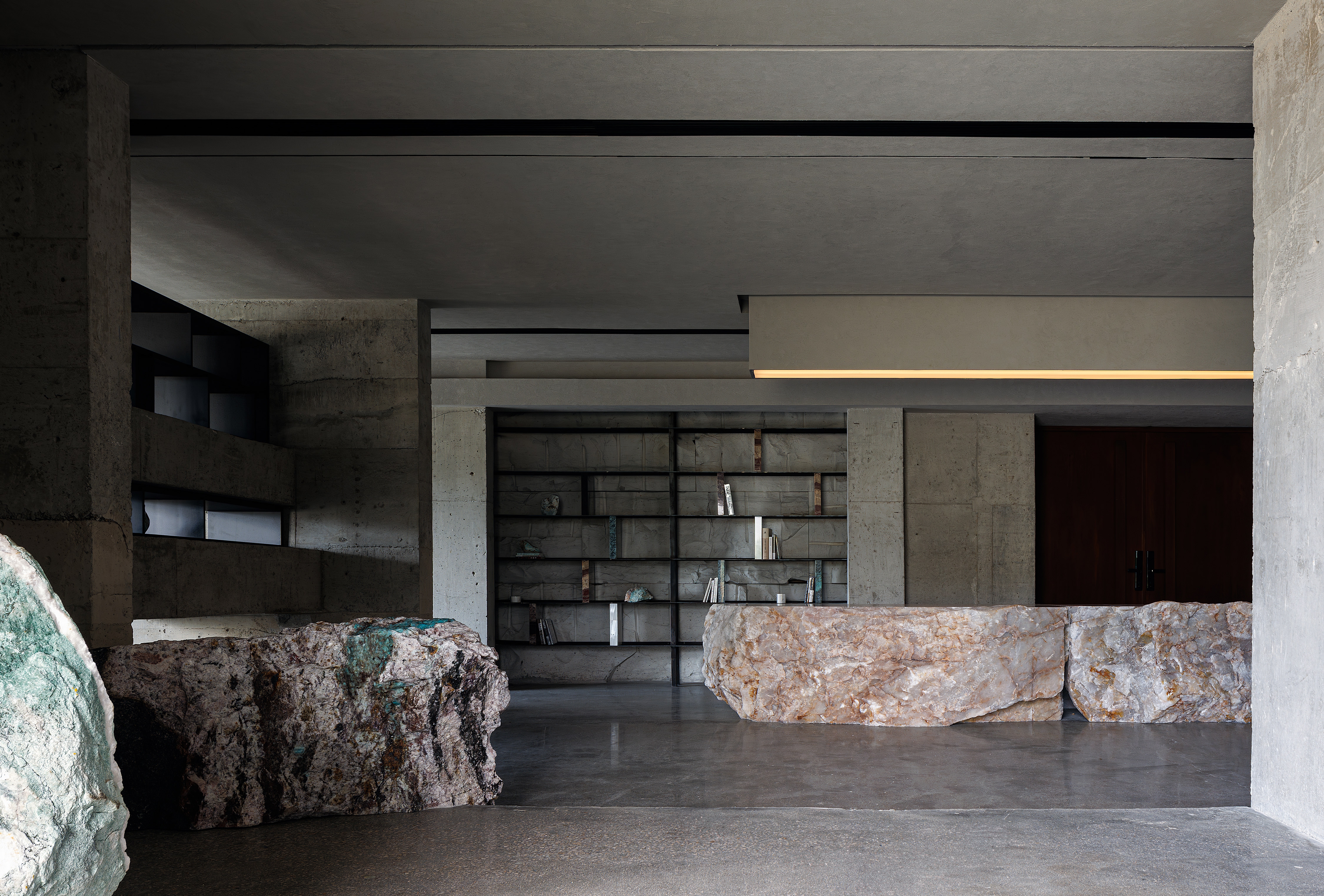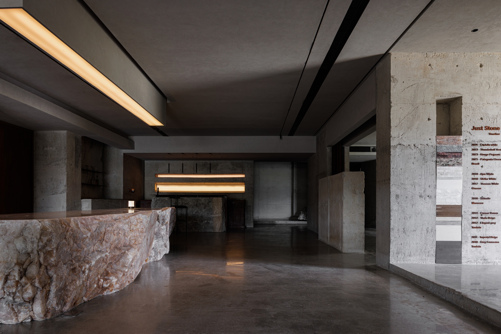 The space uses marble stone and concrete as the sole primary materials, Utilizing the malleability of stone, raw marble blocks are cut into different sizes and proportions, integrating various techniques into architecture and interior spaces to create a space that is purely defined by stone.