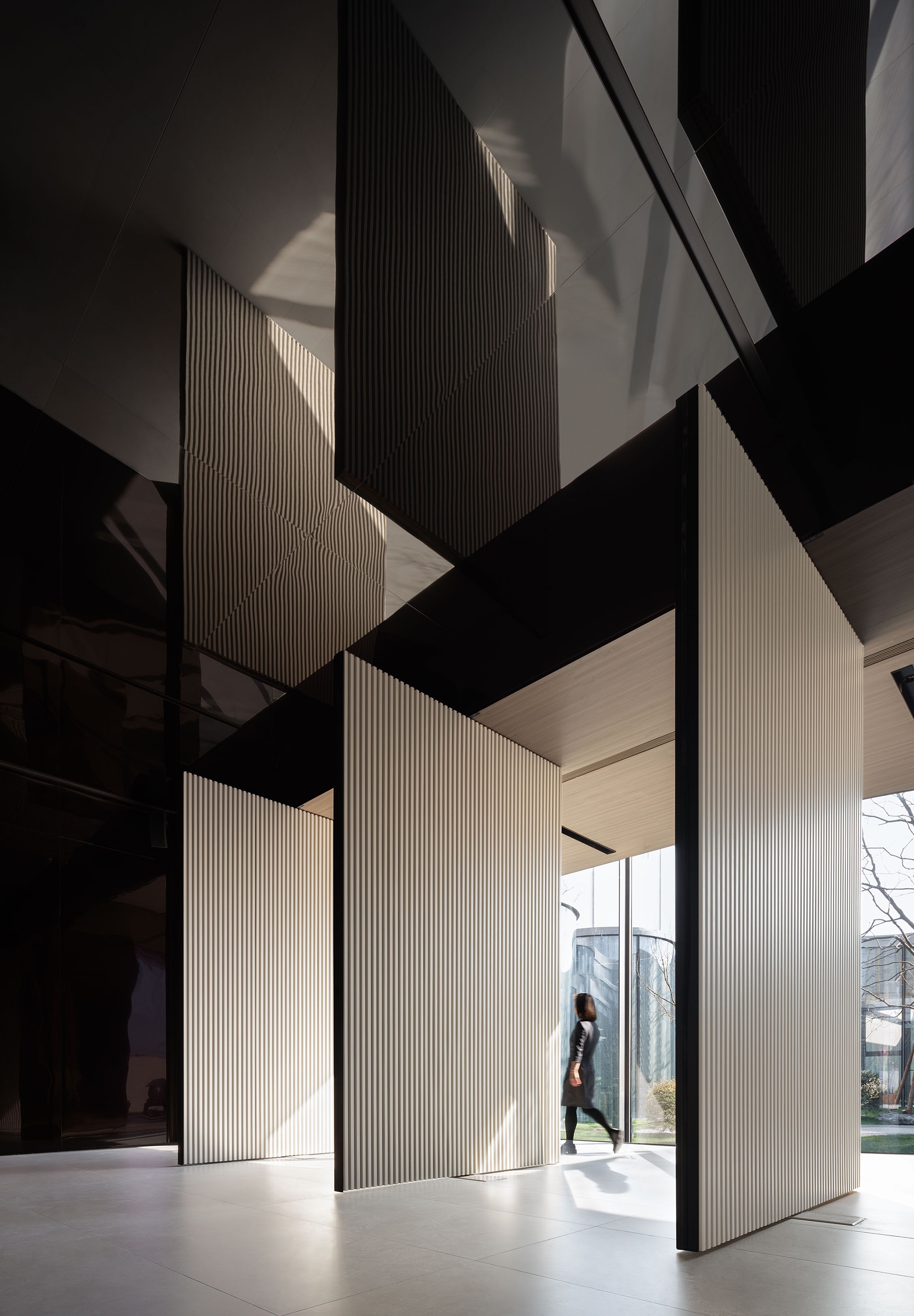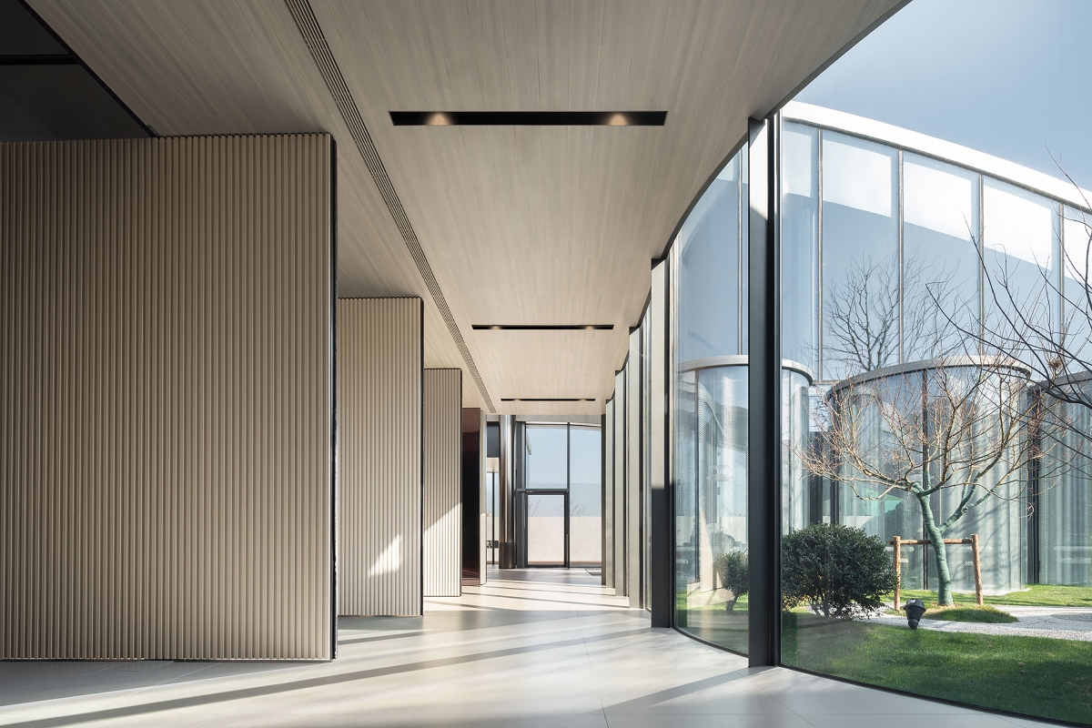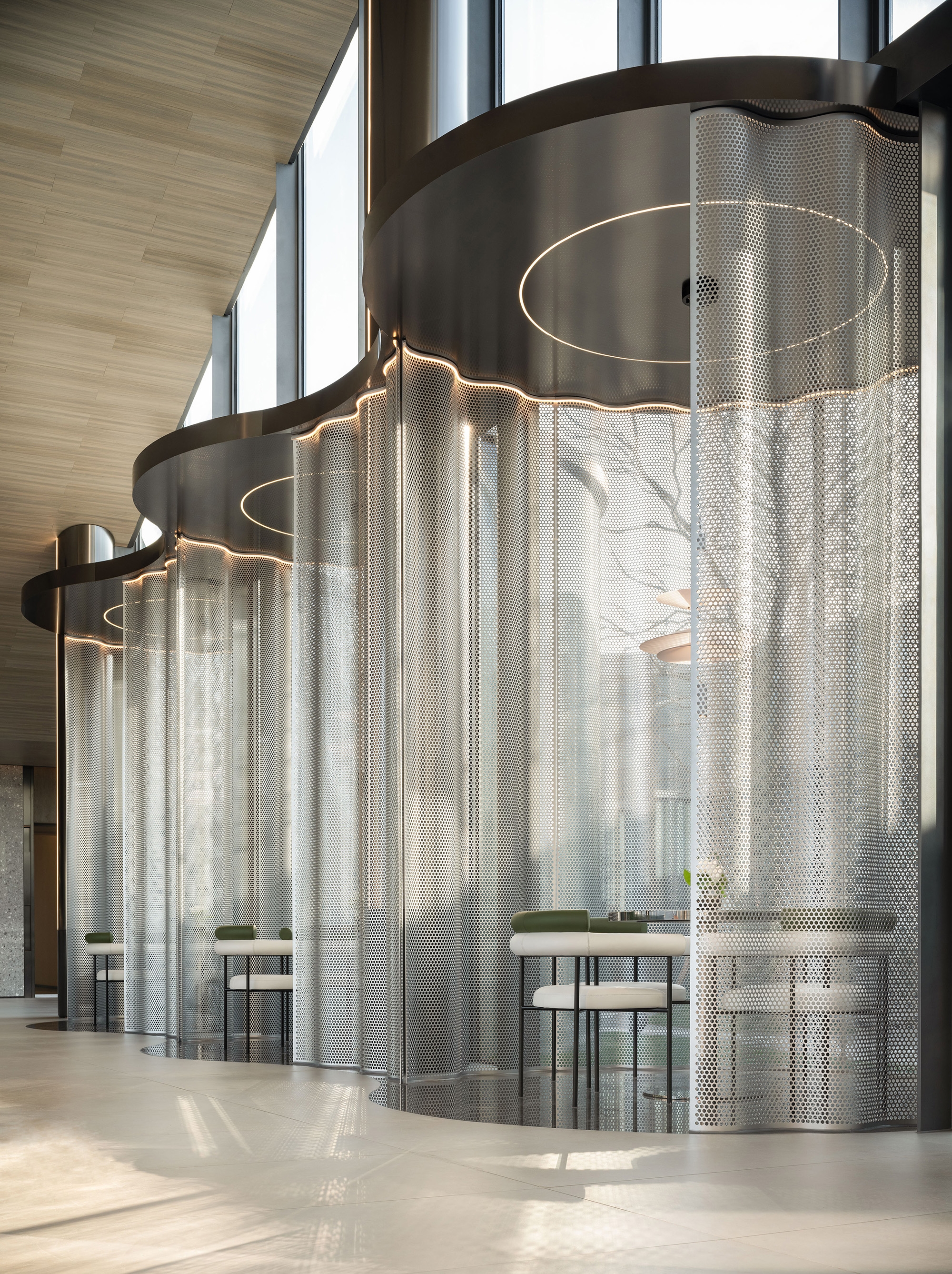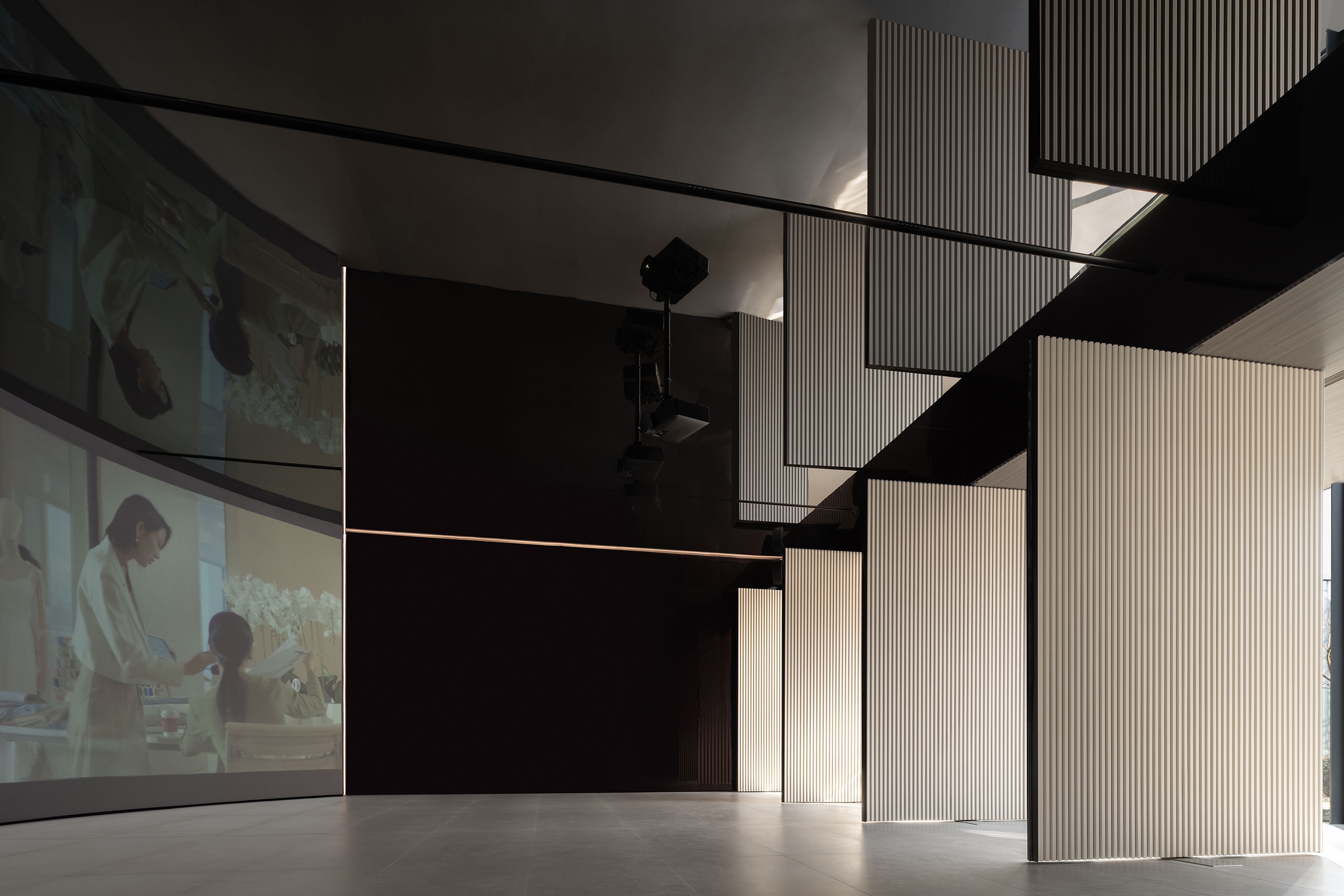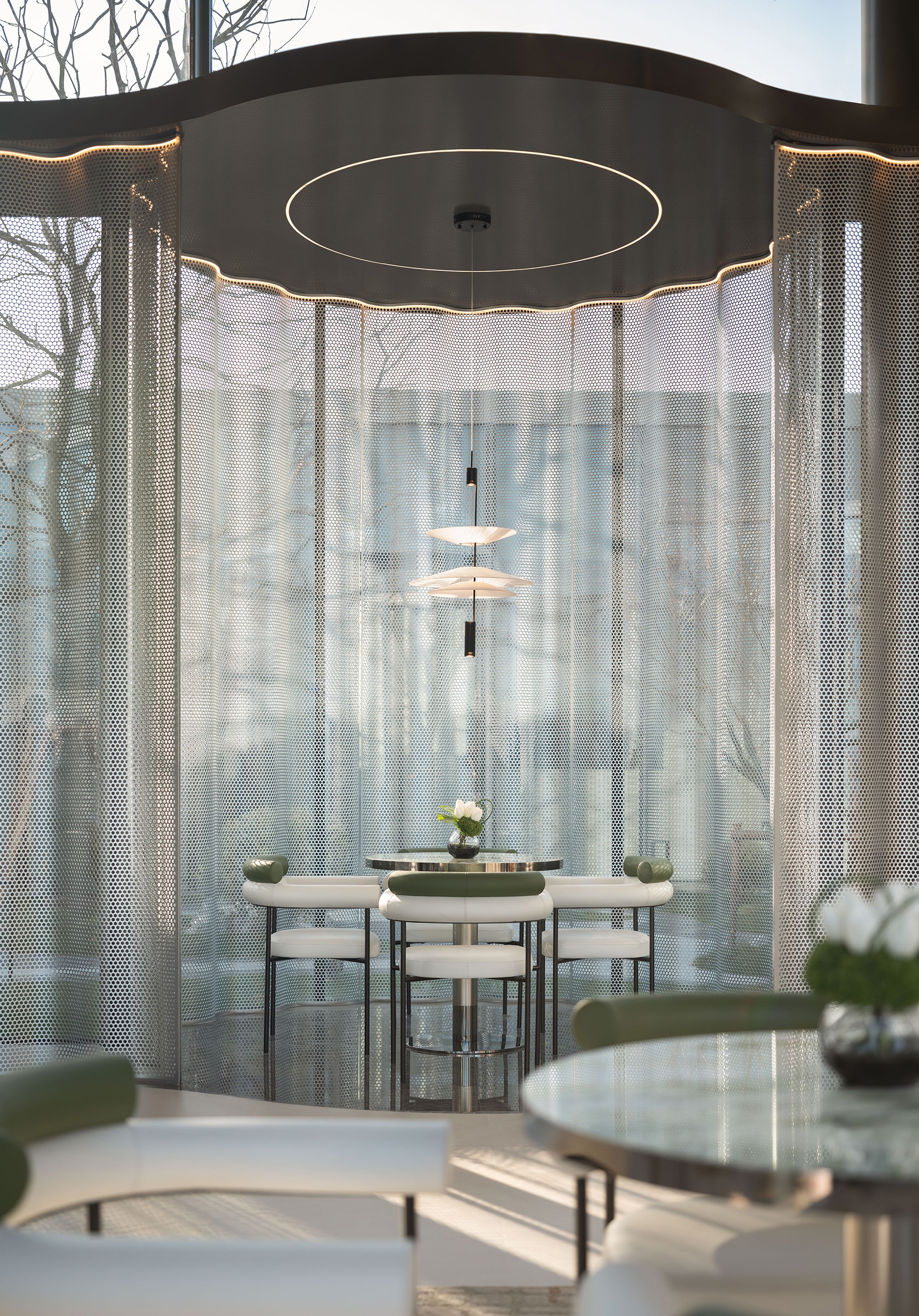 It takes the visitors’ linear motions as the starting point, and the interesting connection not only breaks the inherent boundary, but also creates a "ring" unified with the architectural form. The reception area follows the curved shape of the building and extends it to the interior, overflowing with dynamic vigour and energy. The AV room is wrapped in a three-dimensional all-round deep dark tone, bringing visual and auditory double sensory impregnation, and completing the functional and emotional positive guidance. As the electric revolving door opens, a huge atrium garden comes into view, bringing ecological nature within easy reach. Following the building's contour from high to low, it smoothly realizes the orderly division of the overall model area, negotiation area and water bar. The glass curtain wall introduces light and landscape into the interior, and the semi-circular arcs of the card seats facing the atrium also seem t to be immersed in nature, and the sense of wrapping and privacy are effectively protected and satisfied. The screen is transformed into a backdrop, capturing its wavy vocabulary and immersing the water bar area in a flow.