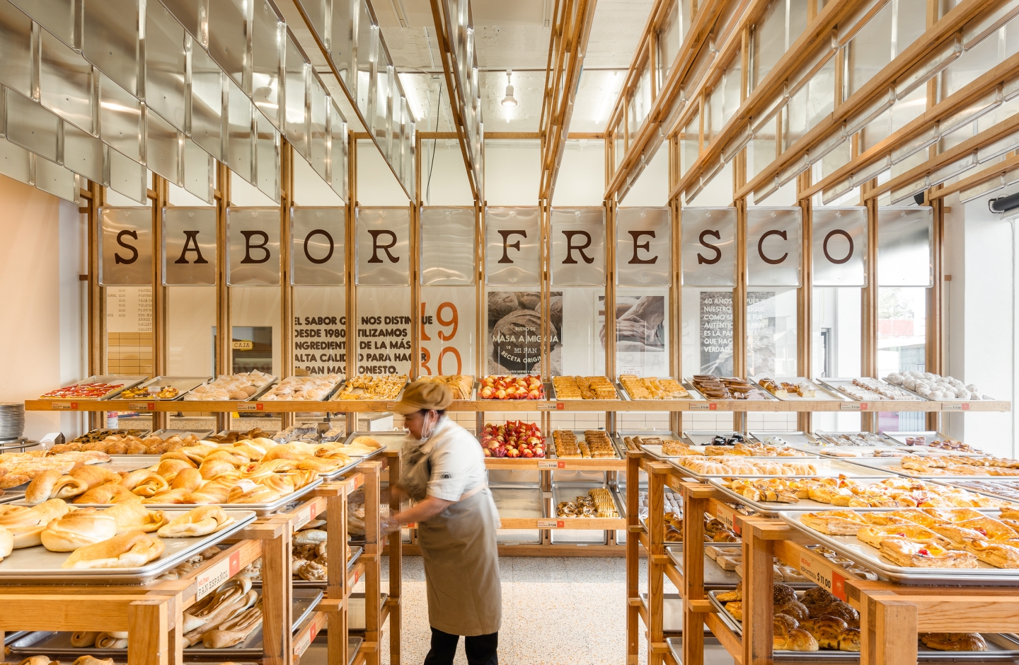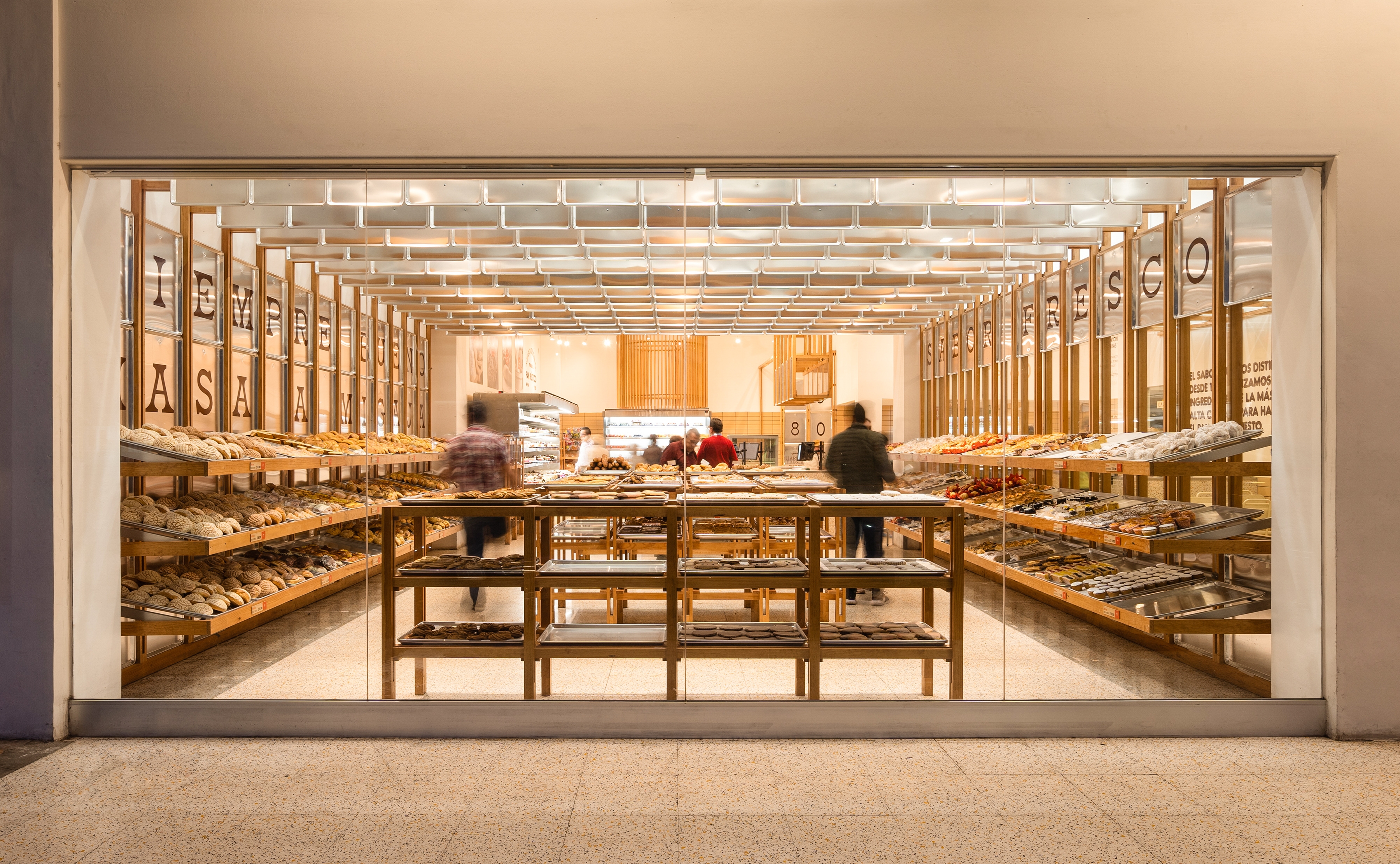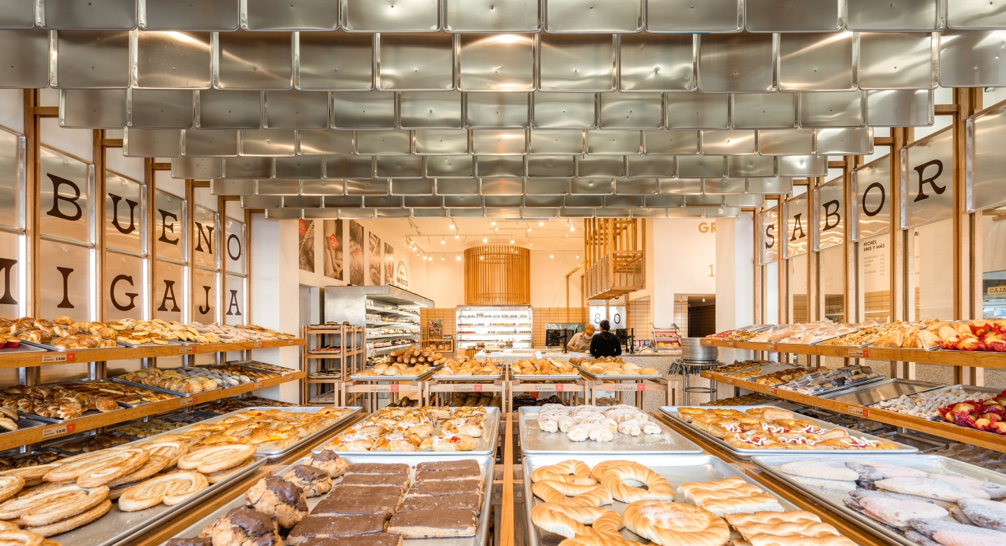 Visits to the bakery live in the memory of all Mexicans. With more than 40 years, Mi Pan has reached thousands of families, breaking barriers between generations and baking for everyone. The concept of Mi Pan comes from its heart, its kitchen. There we experience the magic and talent of the bakers who piece by piece shape each loave. Trays are used throughout the bread baking process, to reflect the freshness of the product we incorporate them into the store.