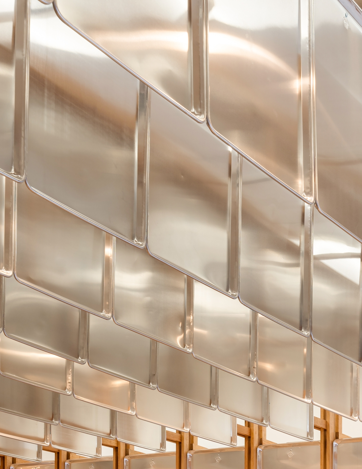 The signature use of metallic trays in the design makes it clear that all revolves around the bread and its process. Pine wood boards were used to structure the design and balance the coldness of the metallic trays. The terrazzo floor connects the shop to the many supermarkets that use the same material. To make this one unique the brand’s orange color was integrated to the mix.