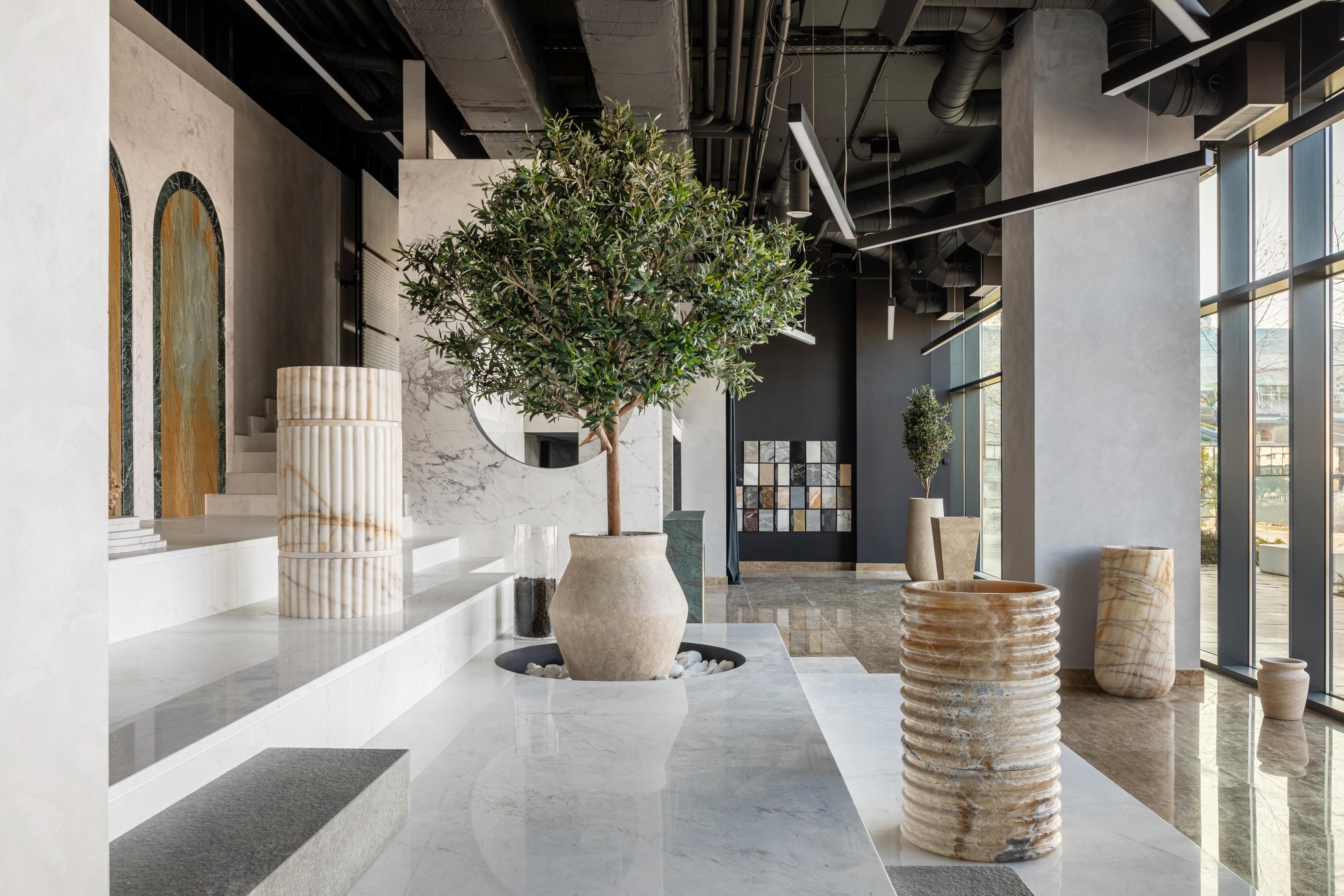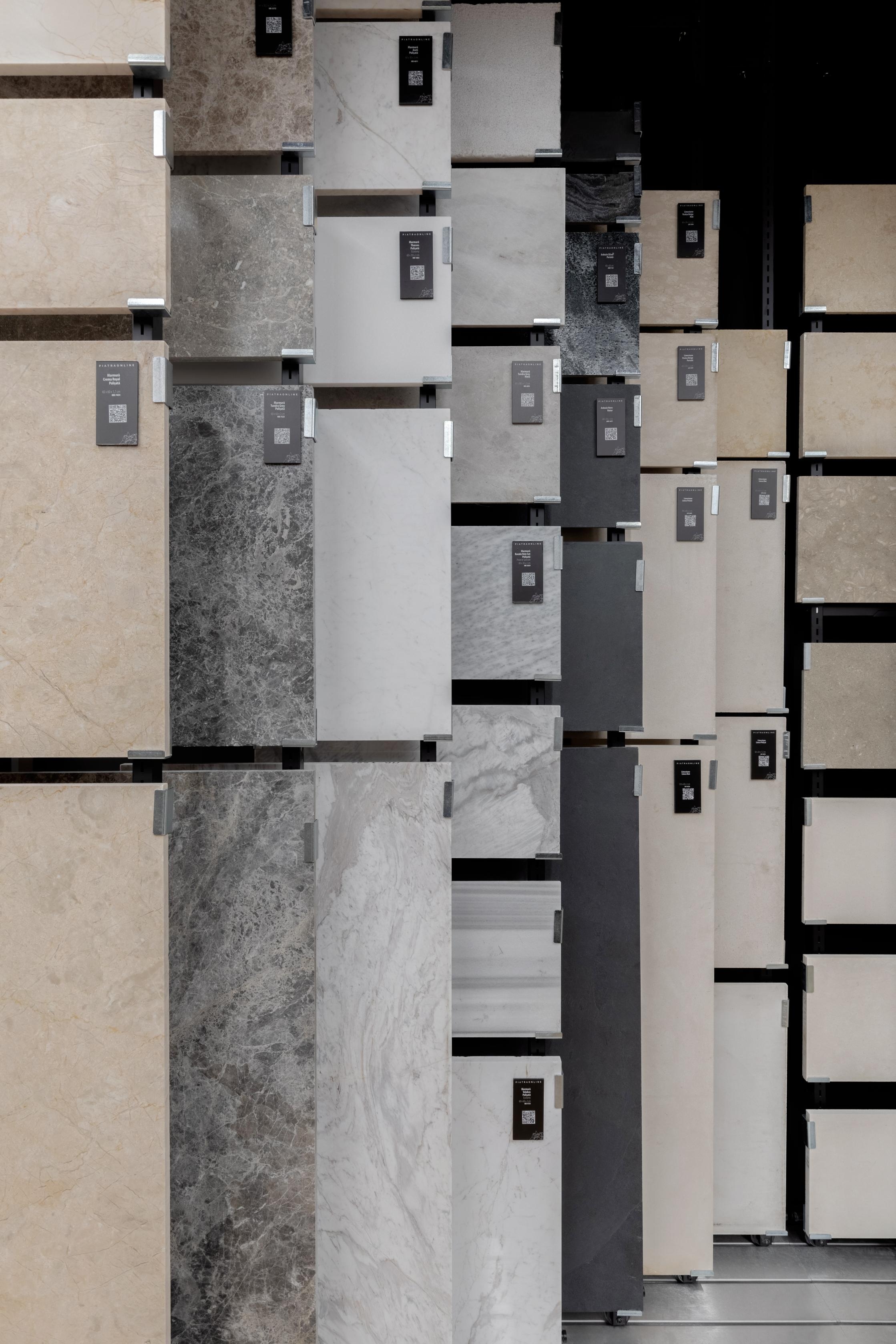 As Romania’s leading natural stone company with over 16 years of experience in the industry, we felt that simply materialising the e-commerce platform into a showroom that displays products on stands and racks was not enough. The space is designed as an experience akin to a gallery or museum, rather than a typical commercial space. The different types of stone are displayed in scenographic setups without labels or price tags, emphasising their design qualities. This approach fosters a carefully crafted brand experience, where the entire showroom functions as a conceptual space.