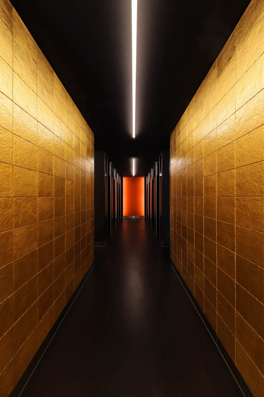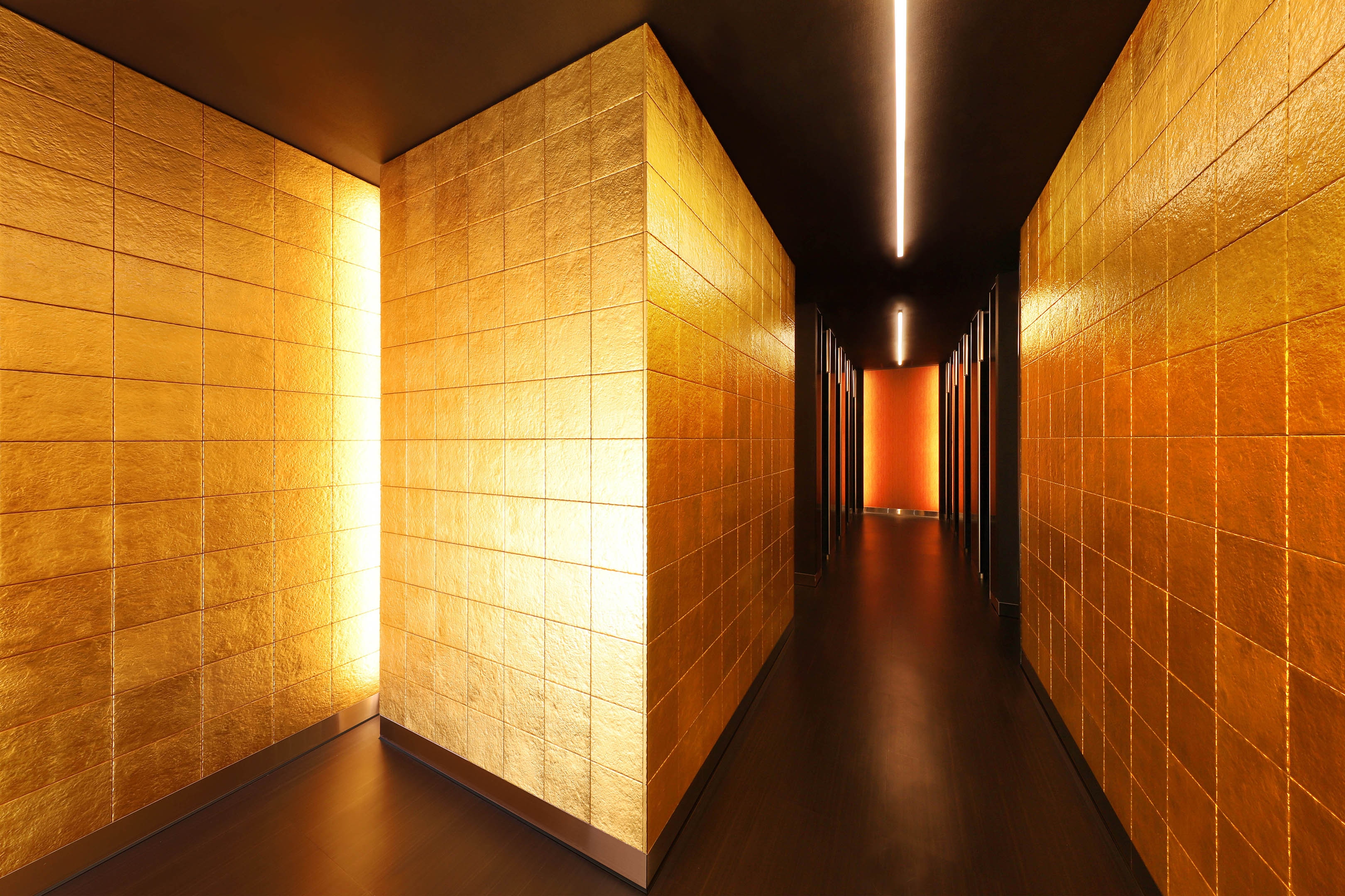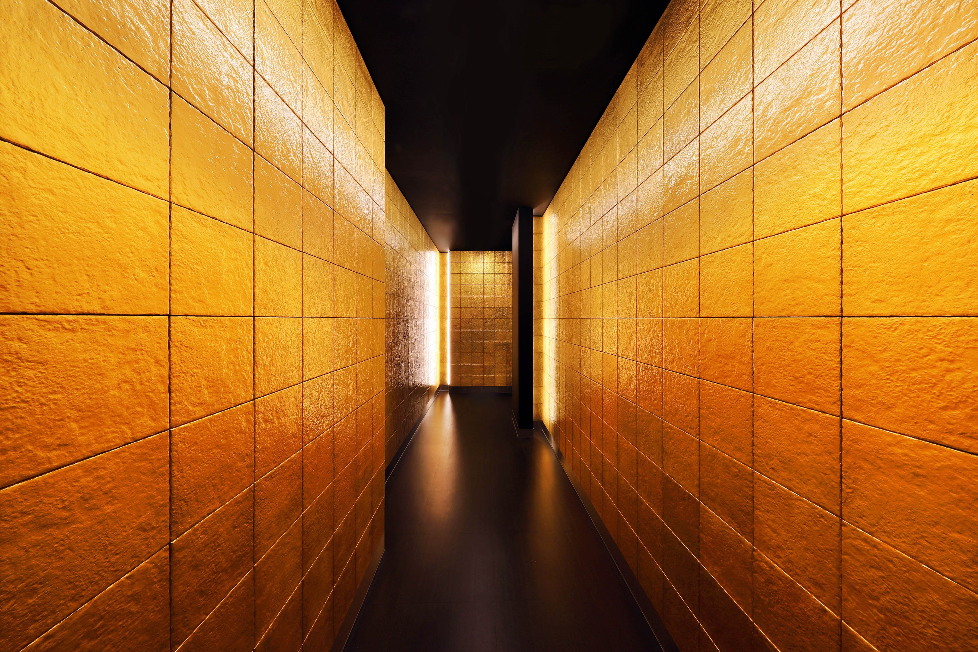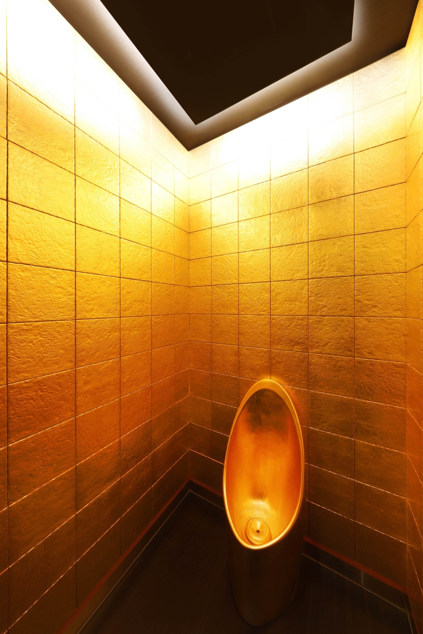 400 years ago, during the samurai era, Kanazawa City was one of Japan's leading economic powers, rivaling Edo (Tokyo) and Kyoto. This prosperity allowed for the preservation of many traditional crafts, among which gold leaf production has a long history. Today, 99% of Japan's gold leaf is manufactured in Kanazawa. This project is associated with a product hall attached to a highway parking area near Kanazawa City. The building serves as a sales space and includes public restroom facilities. The facade of the building is inspired by Kanazawa's samurai residences and features a simple, elegant design with wooden and black panels. The approach to the restroom is designed with a tense, black theme. The interior of the restroom is completely enveloped in gold leaf, creating a stunning, immersive golden space. Approximately 3,000 gold leaf tiles (200mm squares) used in this space are crafted using the refined techniques of 'Edged Gold Leaf,' recognized as a UNESCO Intangible Cultural Heritage. The gold leaf is applied not only to the wall tiles but also to the toilets, allowing visitors to directly engage with Kanazawa's rich traditional culture during their highway rest stops.