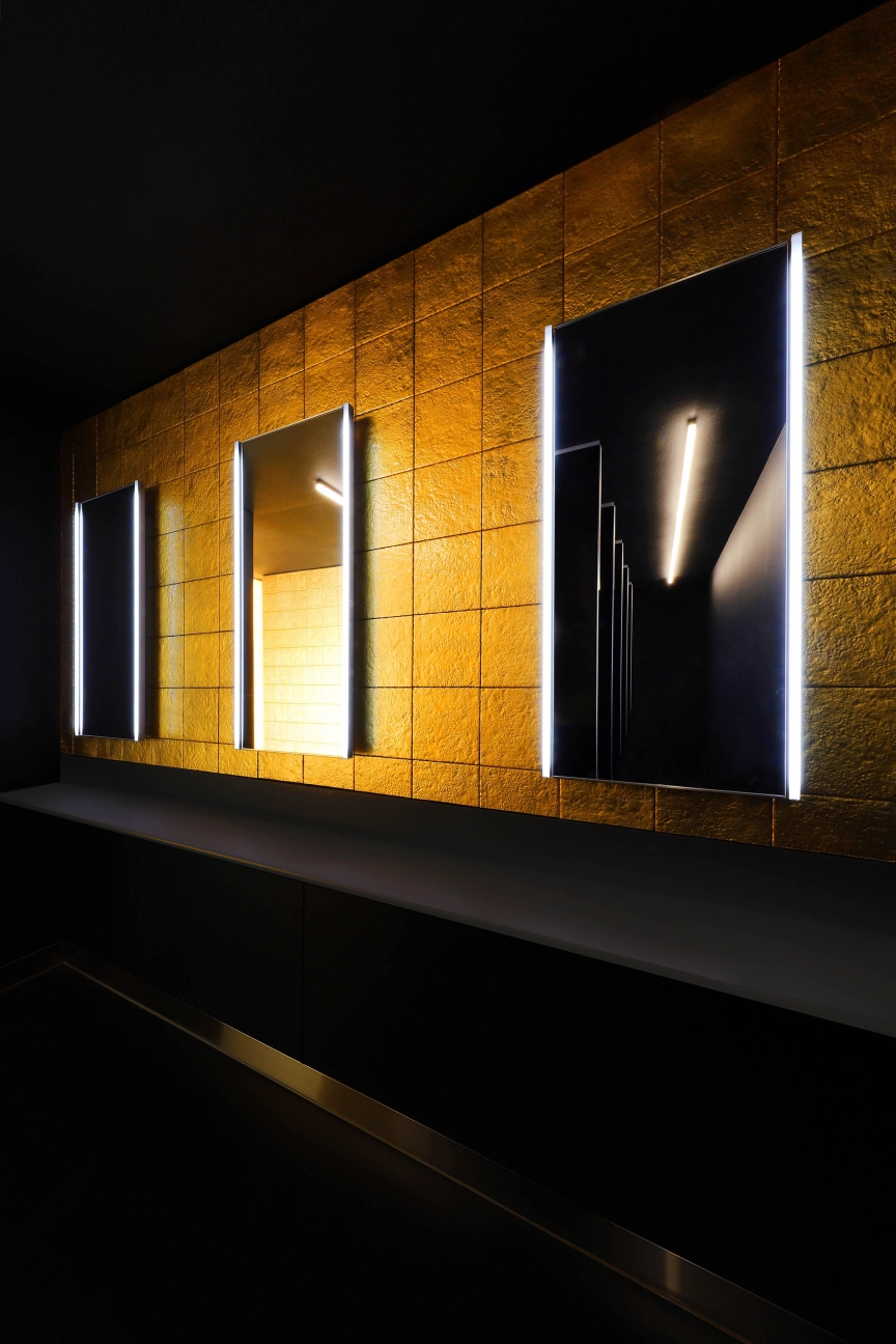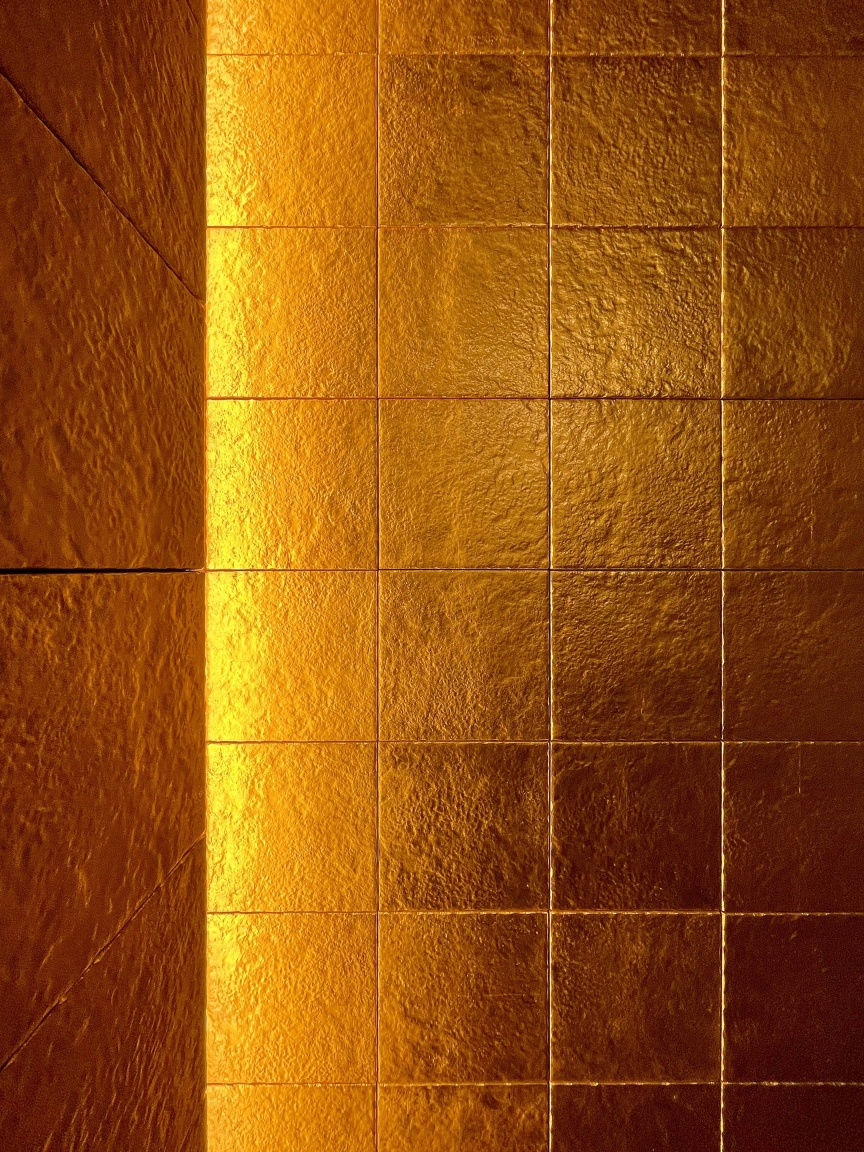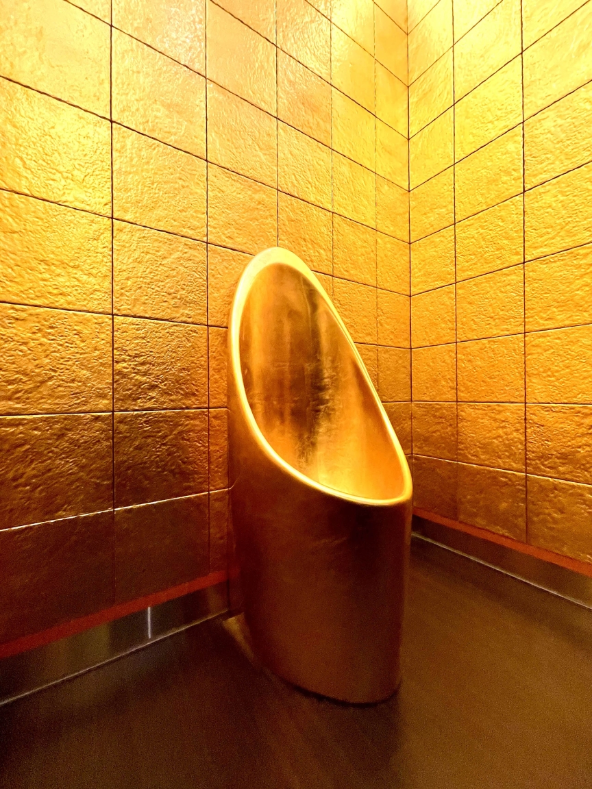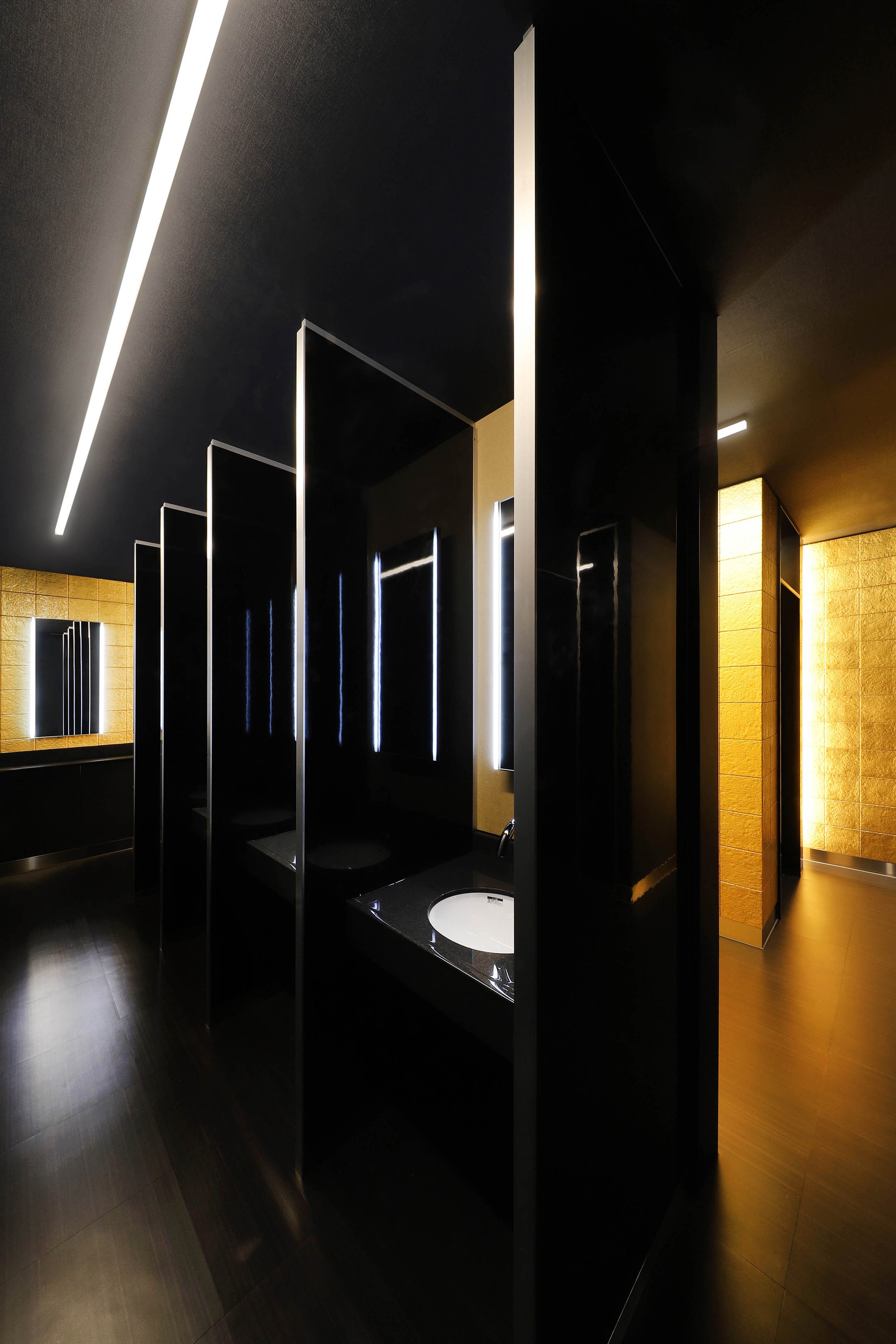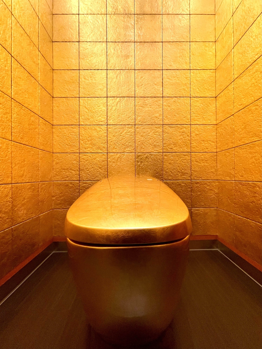 400 years ago, during the samurai era, Kanazawa City was one of Japan's leading economic powers, rivaling Edo (Tokyo) and Kyoto. This prosperity allowed for the preservation of many traditional crafts, among which gold leaf production has a long history. Today, 99% of Japan's gold leaf is manufactured in Kanazawa. This project is associated with a product hall attached to a highway parking area near Kanazawa City. The building serves as a sales space and includes public restroom facilities. The facade of the building is inspired by Kanazawa's samurai residences and features a simple, elegant design with wooden and black panels. The approach to the restroom is designed with a tense, black theme. The interior of the restroom is completely enveloped in gold leaf, creating a stunning, immersive golden space. Approximately 3,000 gold leaf tiles (200mm squares) used in this space are crafted using the refined techniques of 'Edged Gold Leaf,' recognized as a UNESCO Intangible Cultural Heritage. The gold leaf is applied not only to the wall tiles but also to the toilets, allowing visitors to directly engage with Kanazawa's rich traditional culture during their highway rest stops.