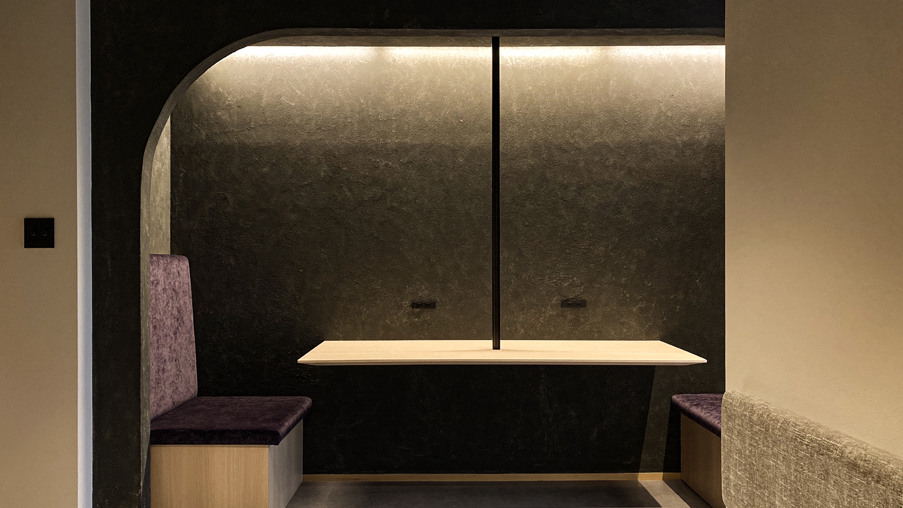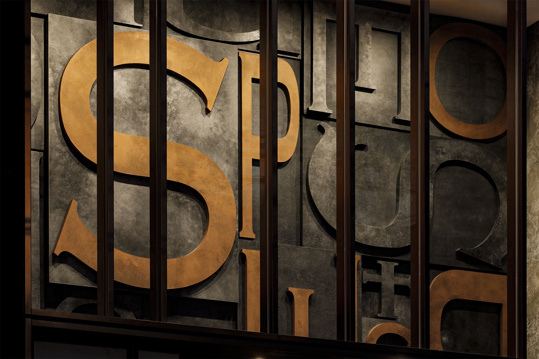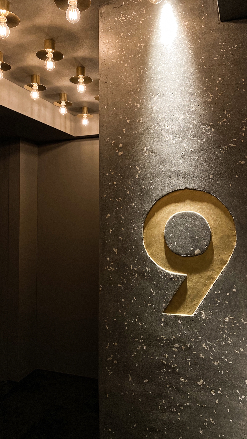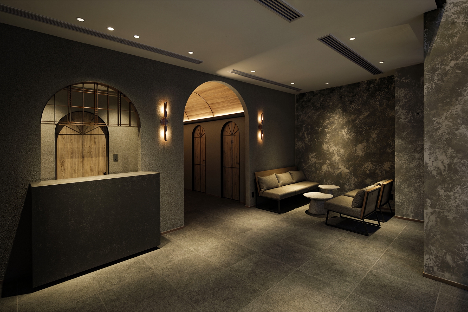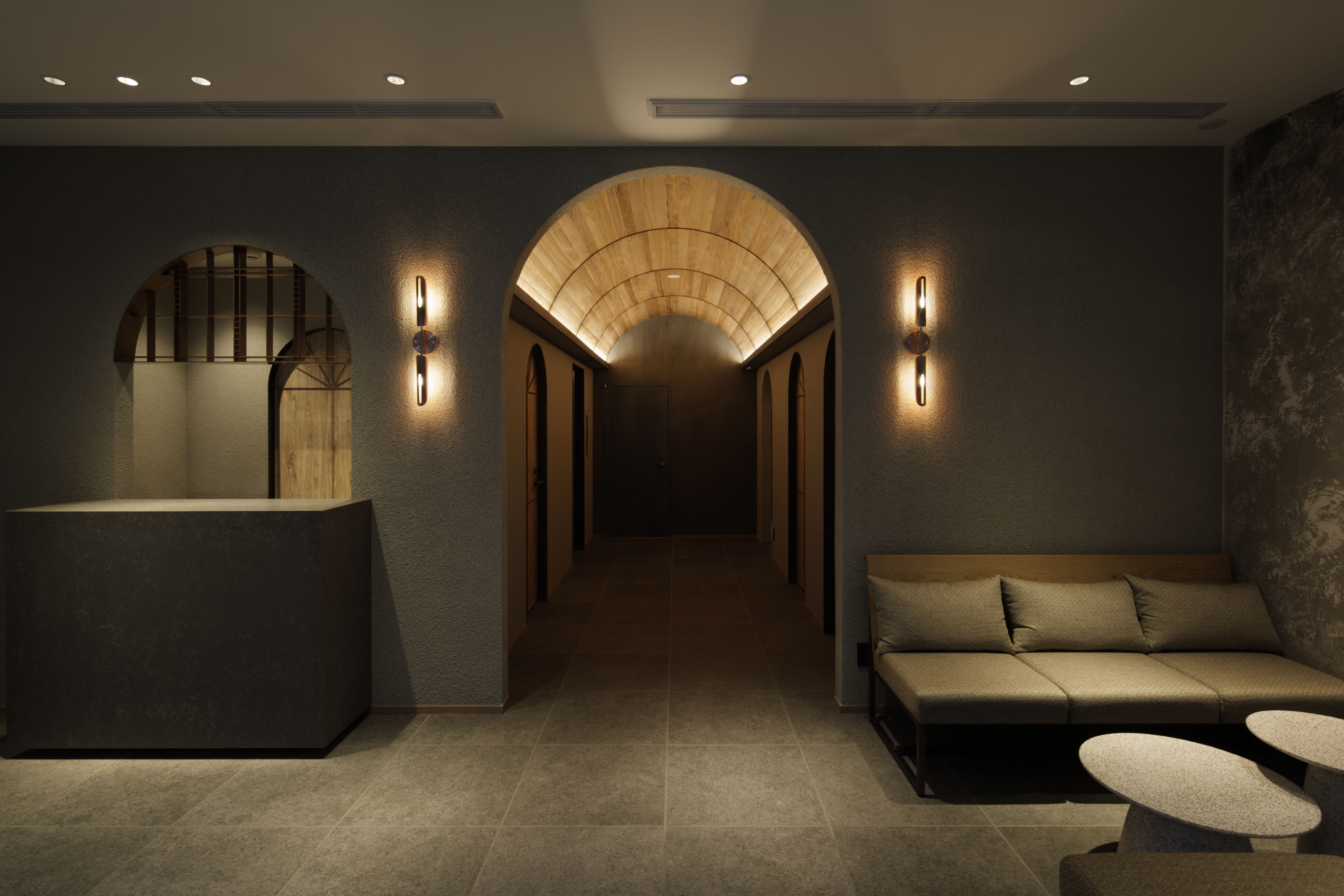 We designed a facade reminiscent of a retail store with display windows and artwork inspired by the hotel's name. Guests transition from this vibrant facade into a serene, small lobby. To reach the guest rooms, they pass through an arched space resembling an underground wine cellar.