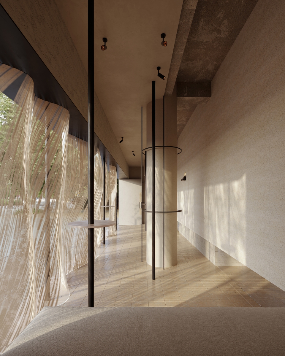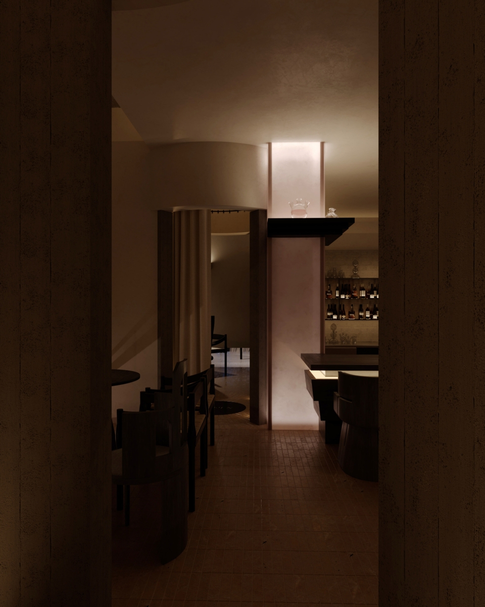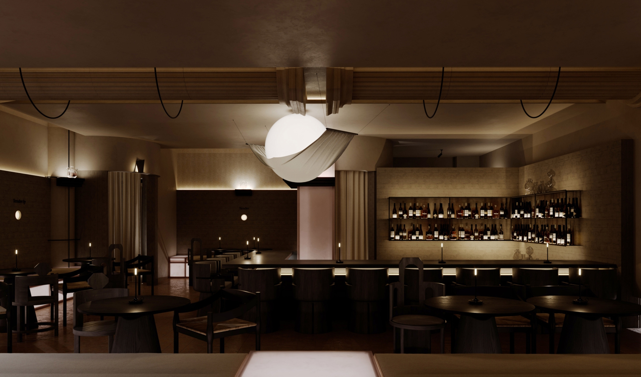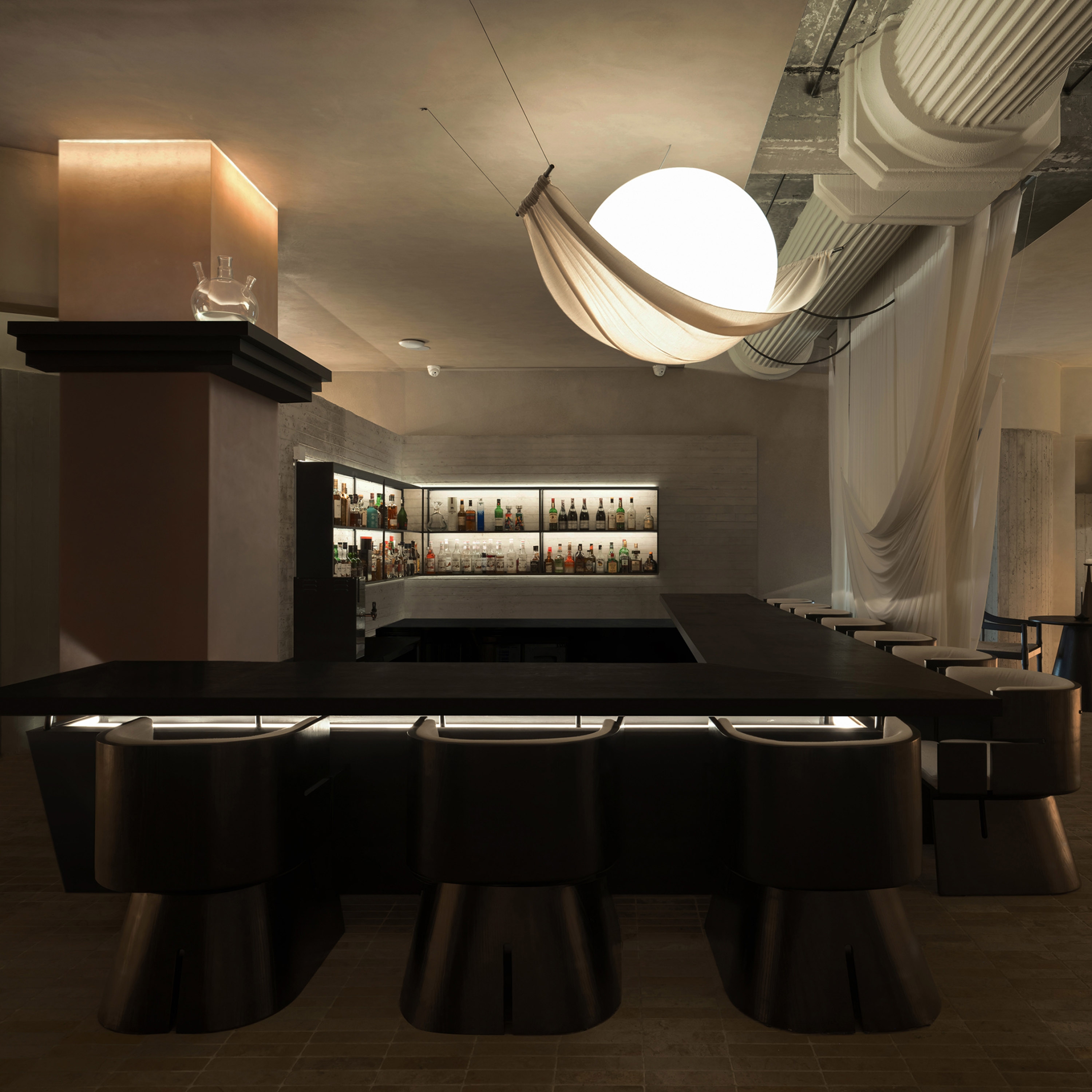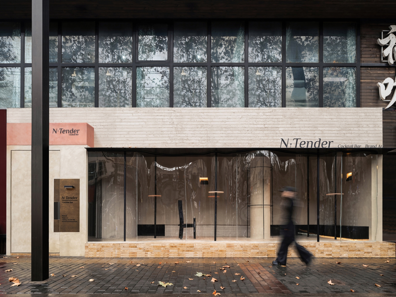 N·tender Bar is situated along the historic streets of Xi’an. The exterior design features expansive double-curved floor-to-ceiling glass, meticulously crafted by China’s top glass manufacturer over one month. These curved glass panels, modeled through software calculations, simulate the flowing curves of water, creating irregular and smooth surface radii.
