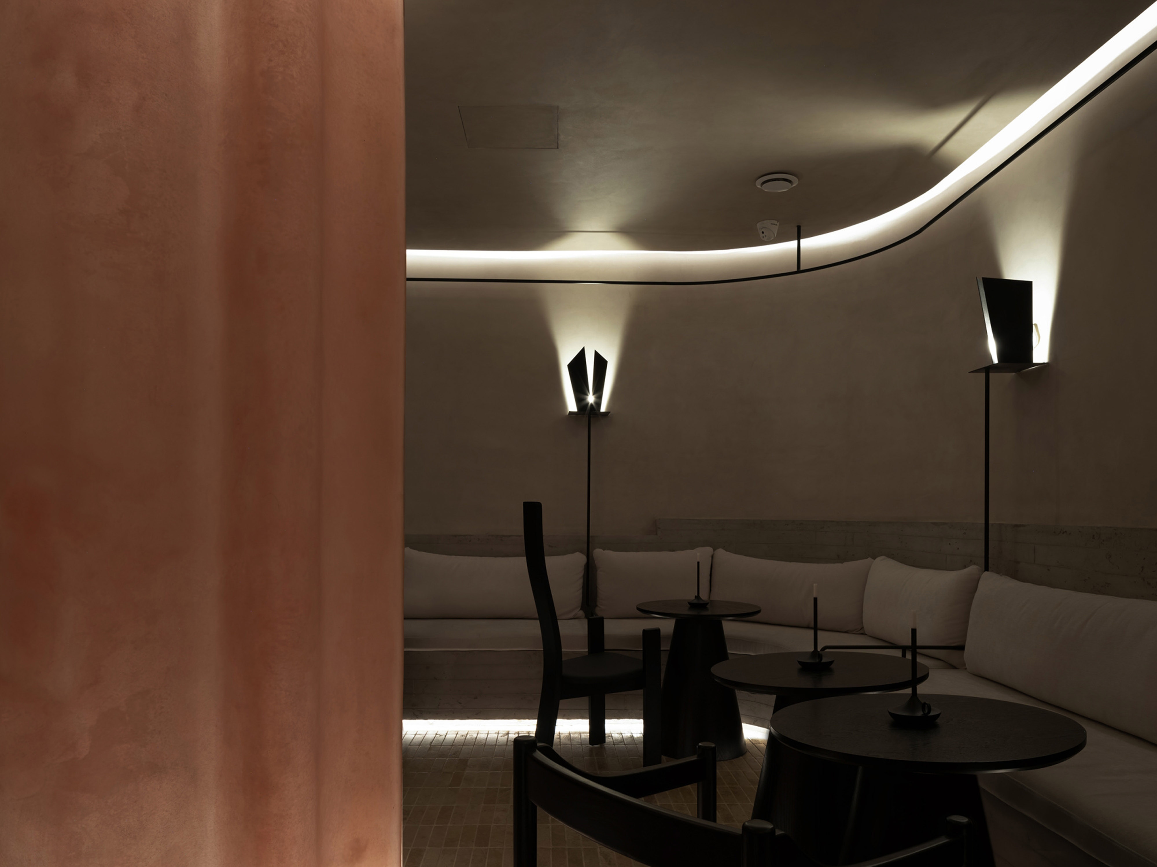 Inside N·tender Bar, seating and columns are fashioned from lotus-colored resin fiberglass material. Utilizing software modeling and manufacturing molds, the resin fiberglass manufacturer produces uniquely shaped fiberglass structures. The translucency of fiberglass, coupled with internal lighting, transforms the solid resin fiberglass into a blurred and fluid state, enhancing the experience of mild intoxication by movement, standing, and conversation within the space through concealed structural elements.