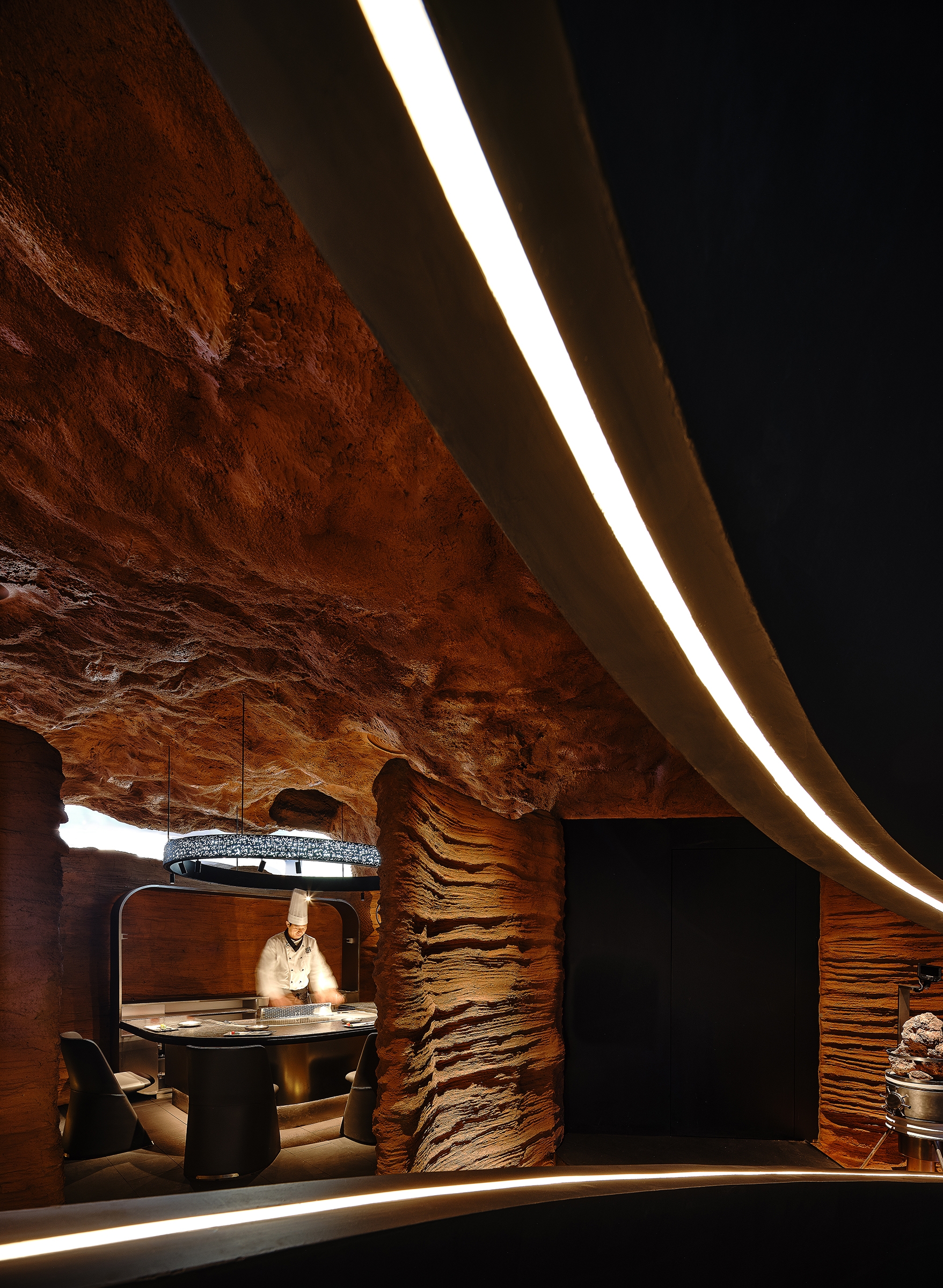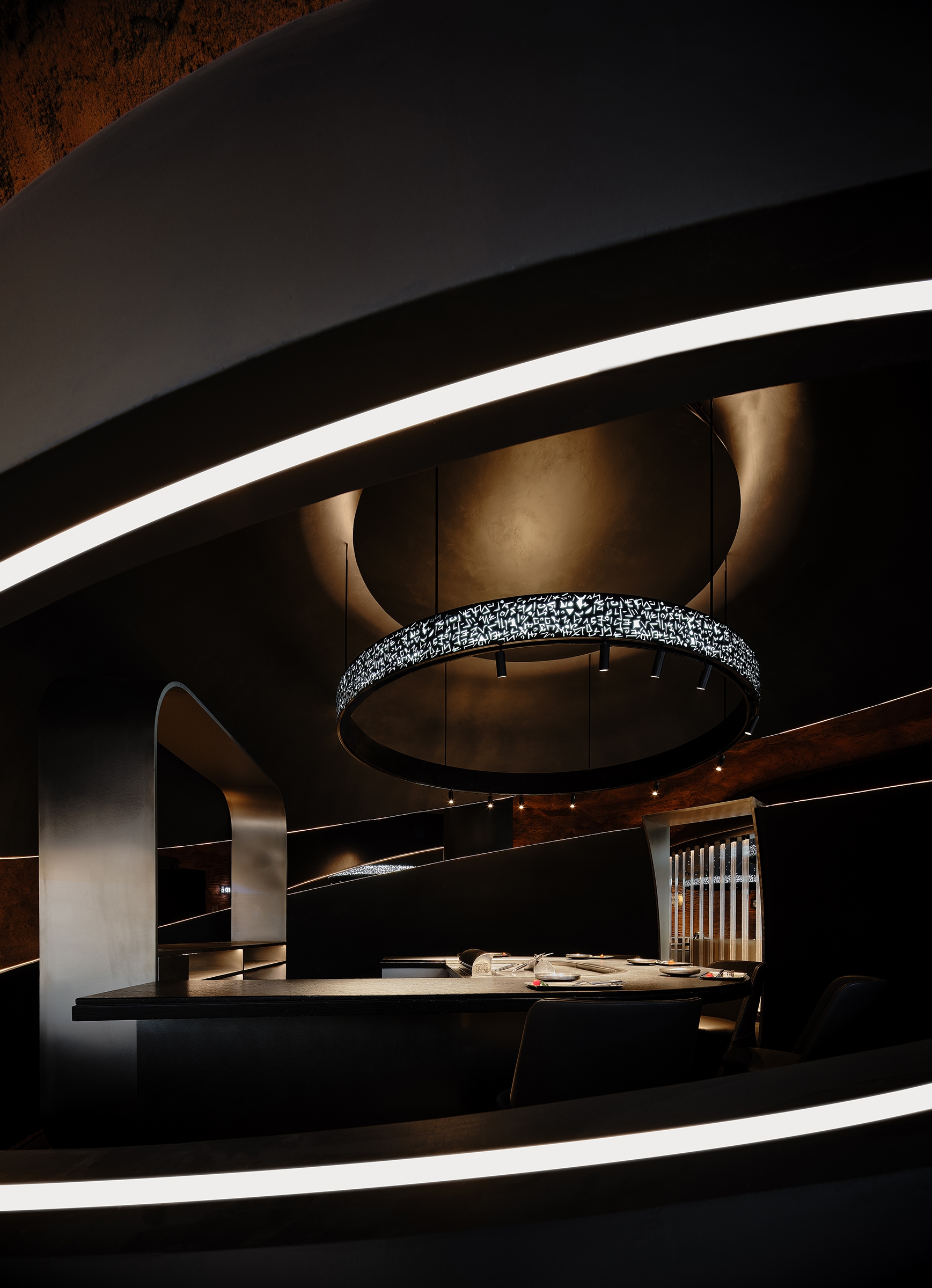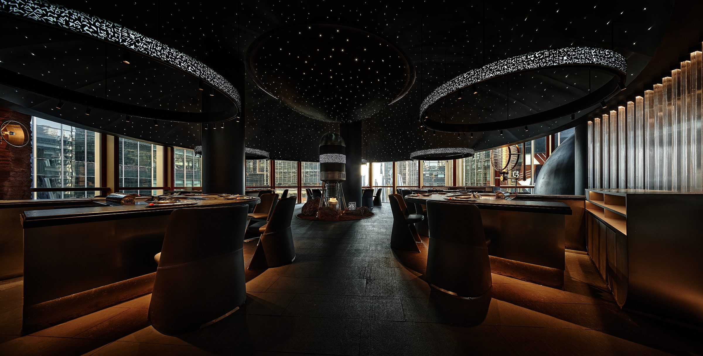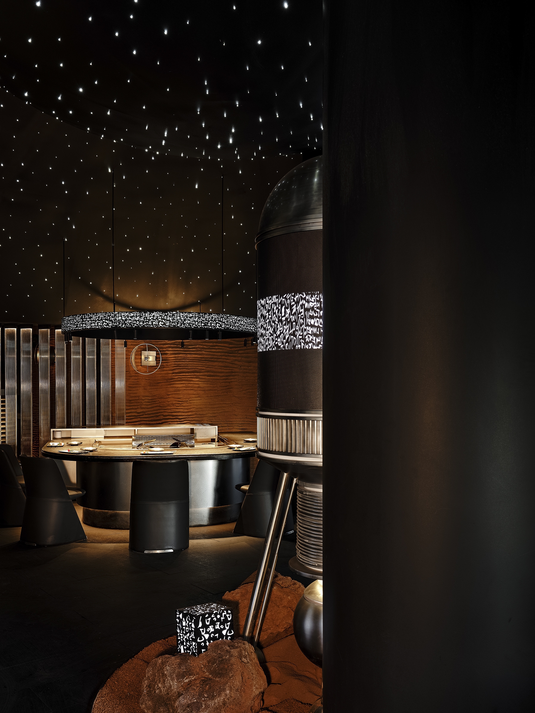 As a seasoned teppanyaki dining brand, Wanmo's newly upgraded location is nestled in the bustling Wujiaochang area of Shanghai. This spot, a cultural hub that attracts a youthful demographic, not only boasts a vibrant consumer base but also houses major tech firms like ByteDance and Bilibili, alongside a large student population with a keen interest in engaging and communal experiences. On the culinary front, Wanmo strives to provide delightful spaces and meals suited for various gatherings and casual outings. Beyond serving food, the brand seeks to establish a venue that inspires social interactions beyond the ordinary. Wanmo's core clientele can be envisioned following insights from designer Wei Zhixue, who draws from the restaurant's locale: Amid the brisk pace of work, internet-savvy "workers" crave unique, easily shareable experiences that resonate with their identity, often confined to the office cubicle. Thus, inspired by the theme of "Interstellar Exploration," both design and branding aim to craft a dining and social space that promotes both online buzz and in-person discovery, enhancing the overall experience.