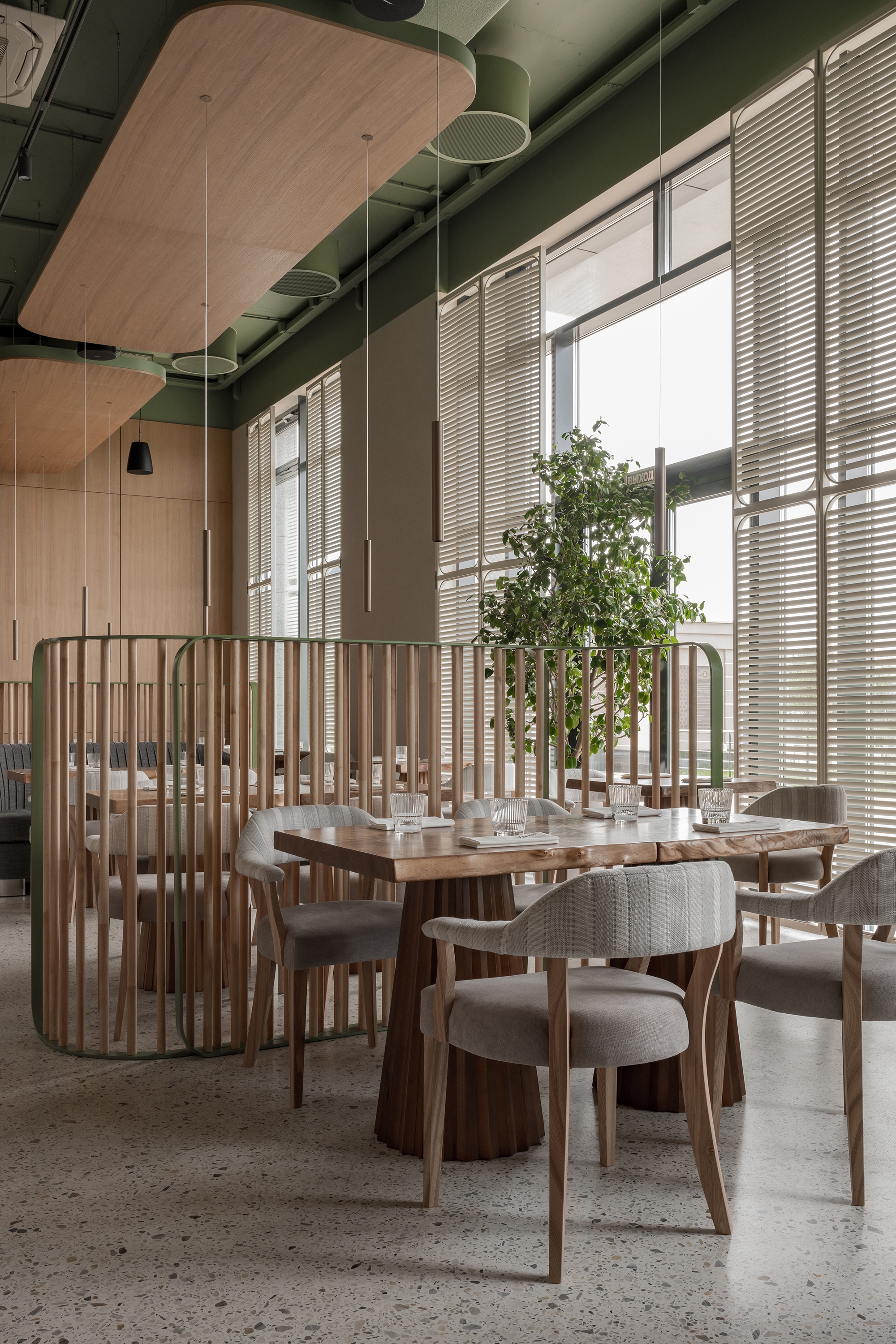 Large stained glass windows of the restaurant overlook the pedestrian embankment, making it part of the interior. Therefore, instead of traditional fabric curtains, light wooden shutters were used.