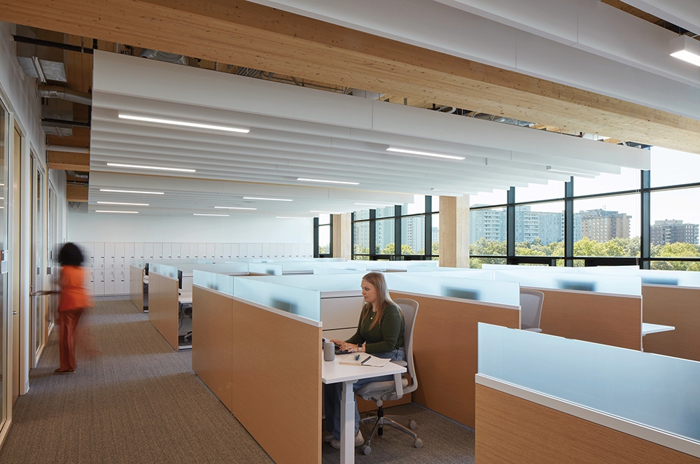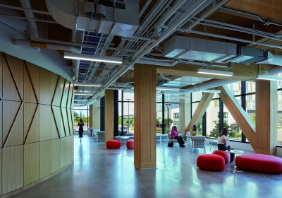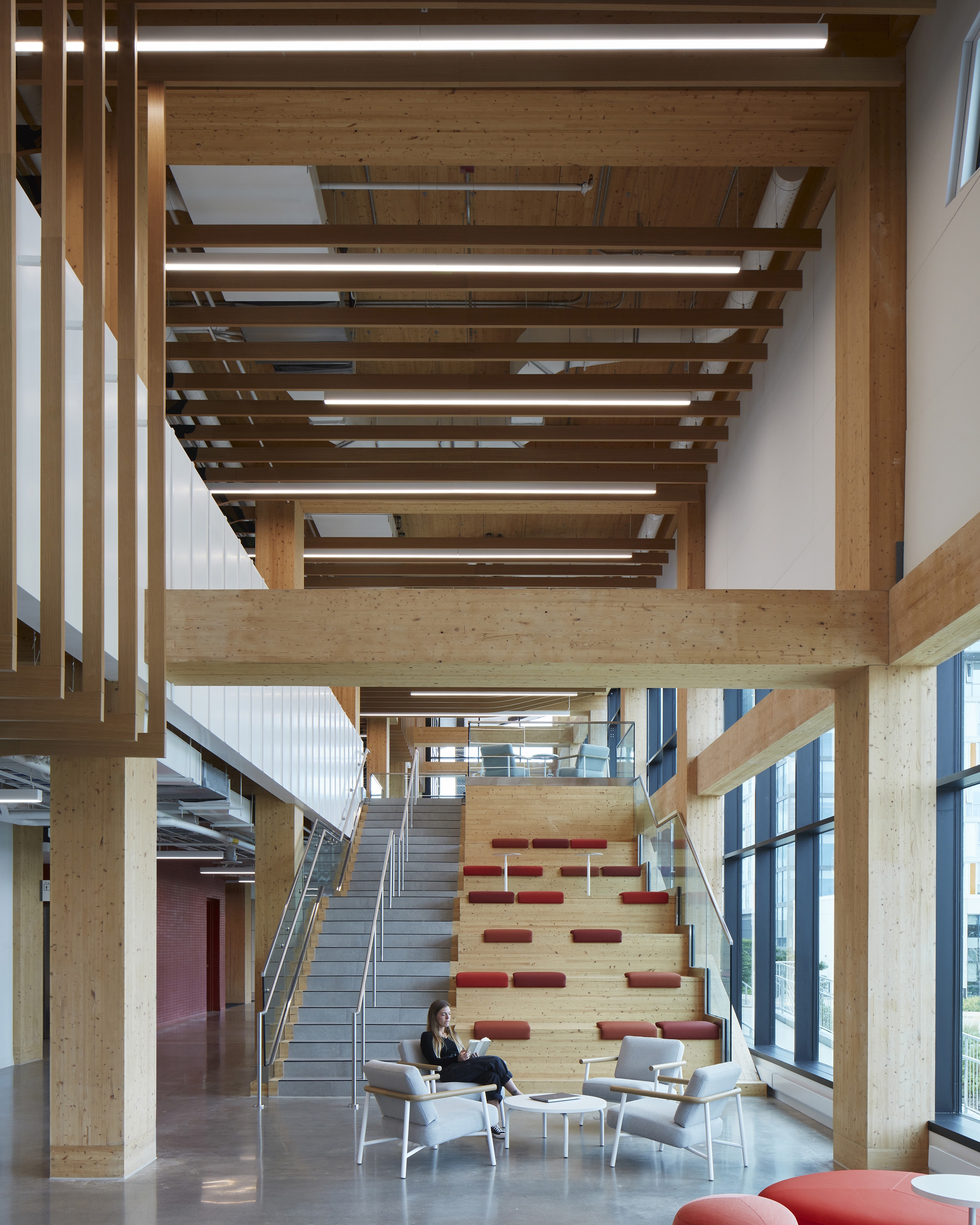 The Centennial College A Building embodies the Mi’kmaq concept of "Two-Eyed Seeing," blending Indigenous wisdom with Western perspectives. As Canada's first LEED Gold, net-zero carbon, WELL-certified, mass timber higher-education facility, it demonstrates a strong commitment to sustainability and social responsibility.