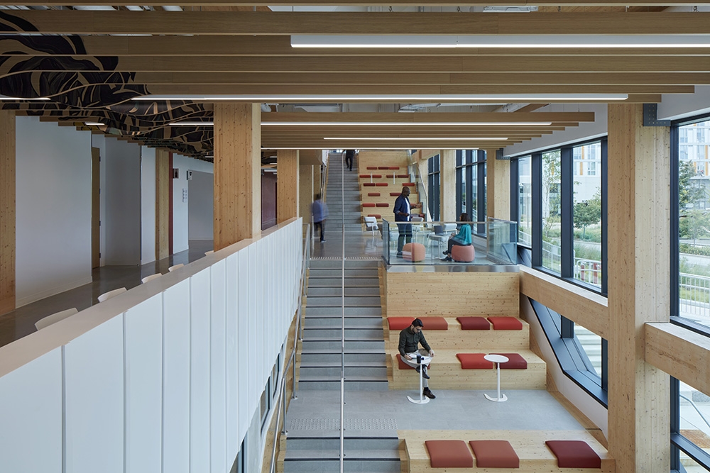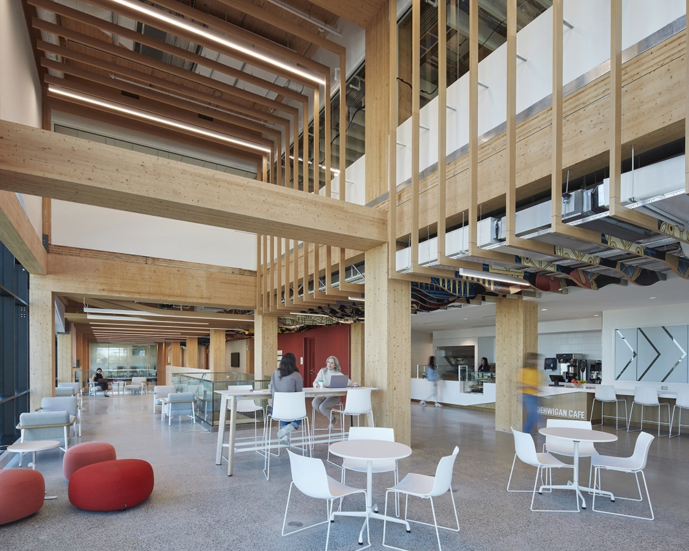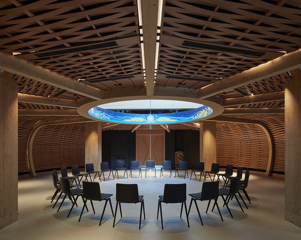 The building, aligned with cardinal directions, features an East-facing entrance, reminiscent of traditional longhouse. Inside, a grand stairway in Wisdom Hall leads to informal learning spaces that foster spontaneous conversation and idea exchange. At Level 3, the stair reaches a Student Hub and Café showcasing Indigenous cuisine, offering a cultural experience through food. The main corridor in Wisdom Hall is adorned with acoustic wood baffles that mimic water flow, reflecting Indigenous stories. The circular Indigenous Commons, the building’s heart, serves as a ceremonial space that anchors the building’s design.