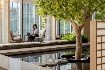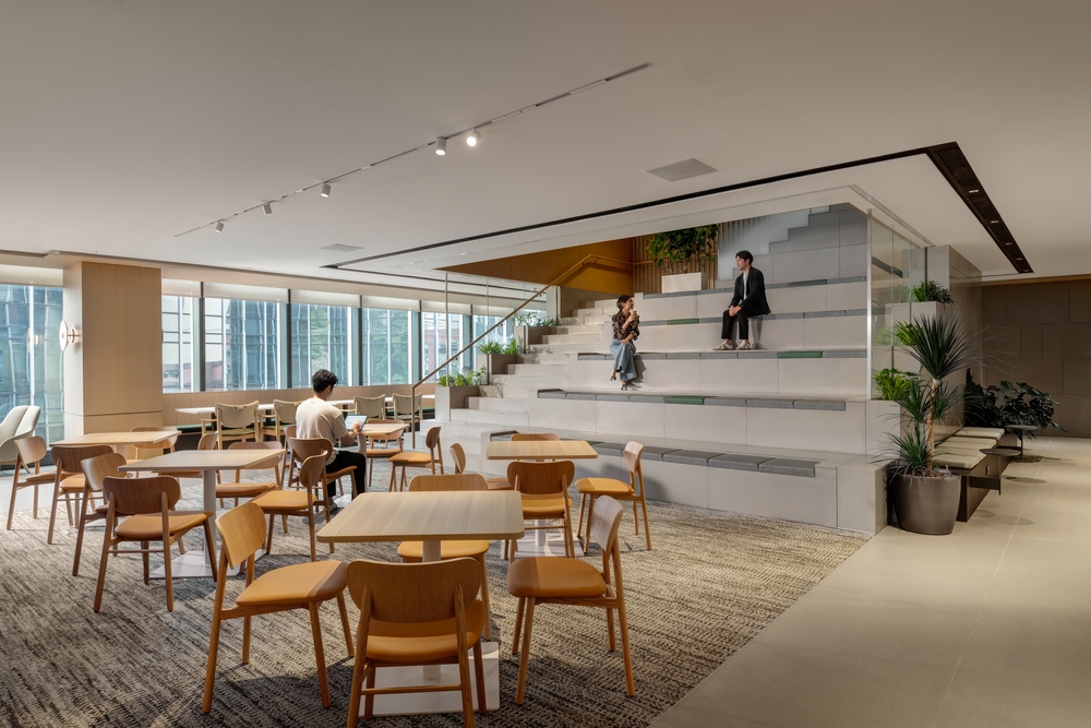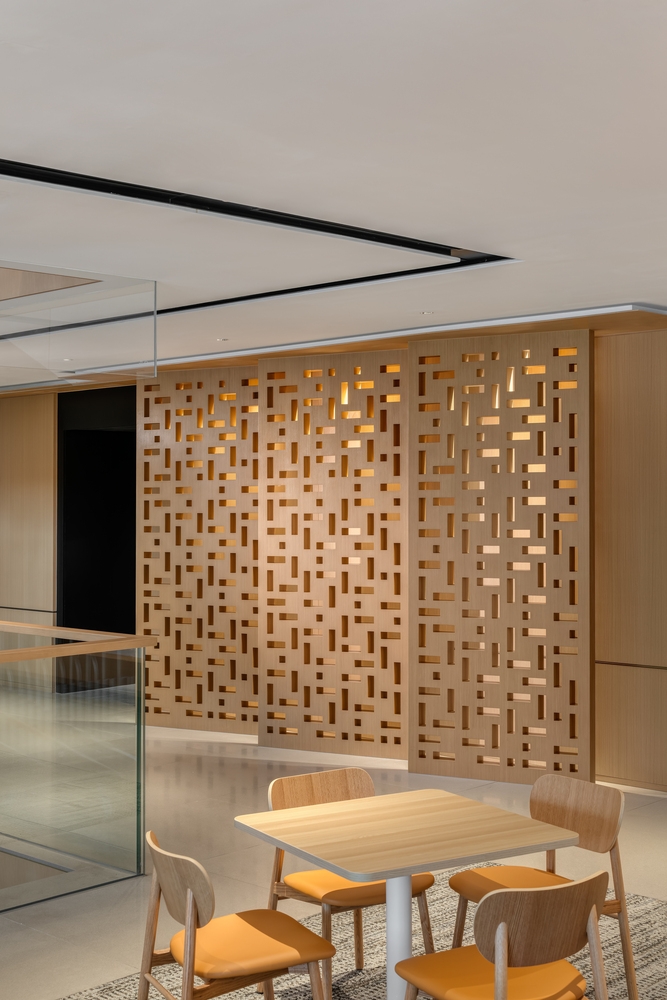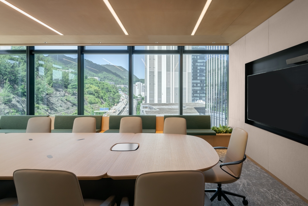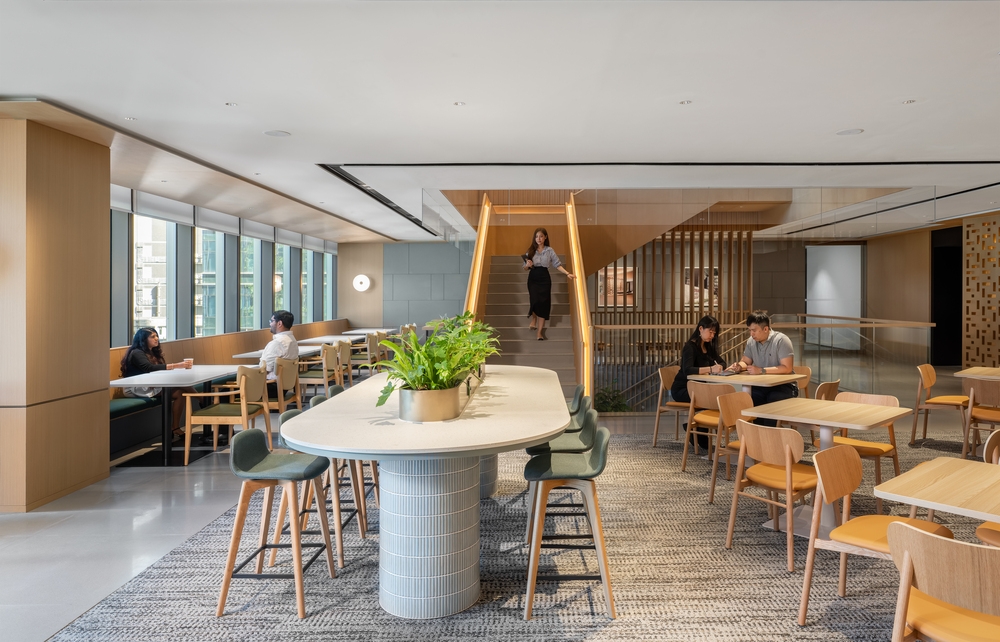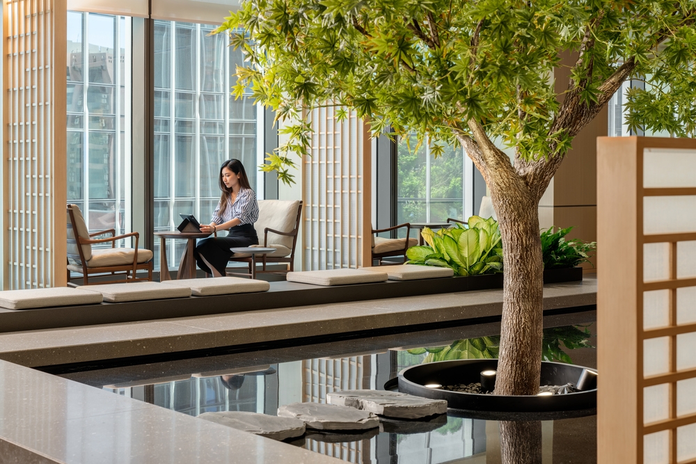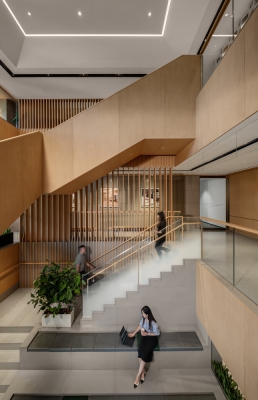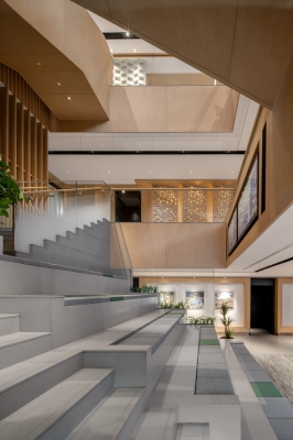 The new headquarters for a leading property developer spans 80,000 sq.ft. in a Grade A twin tower in the vibrant Cheung Sha Wan area. Spatial Concept's design consolidates multiple departments across four levels, linked by a feature staircase, and incorporates the client’s Artisanal Movement DNA. Inspired by the traditional siheyuan, a Chinese courtyard home, the design fosters collaboration, creativity, and well-being, echoing the communal nature of these homes. The 10th-floor reception courtyard features a shallow pool encased in black granite and centered around a tree reaching toward the 2.7m ceiling. Adjacent casual meeting areas with custom furnishings are separated by wooden lattice screens, while a monolithic granite reception desk showcases craftsmanship central to the Artisanal Movement. Sustainability is a core focus, with over 60% of finishes made from eco-friendly materials. Terrazzo floors use up to 80% recycled content, while FSC-certified wood, low-VOC finishes, and perforated ceiling tiles enhance acoustics. With ample natural daylight, the space promotes well-being, creating a future-proof workplace for creativity and comfort.