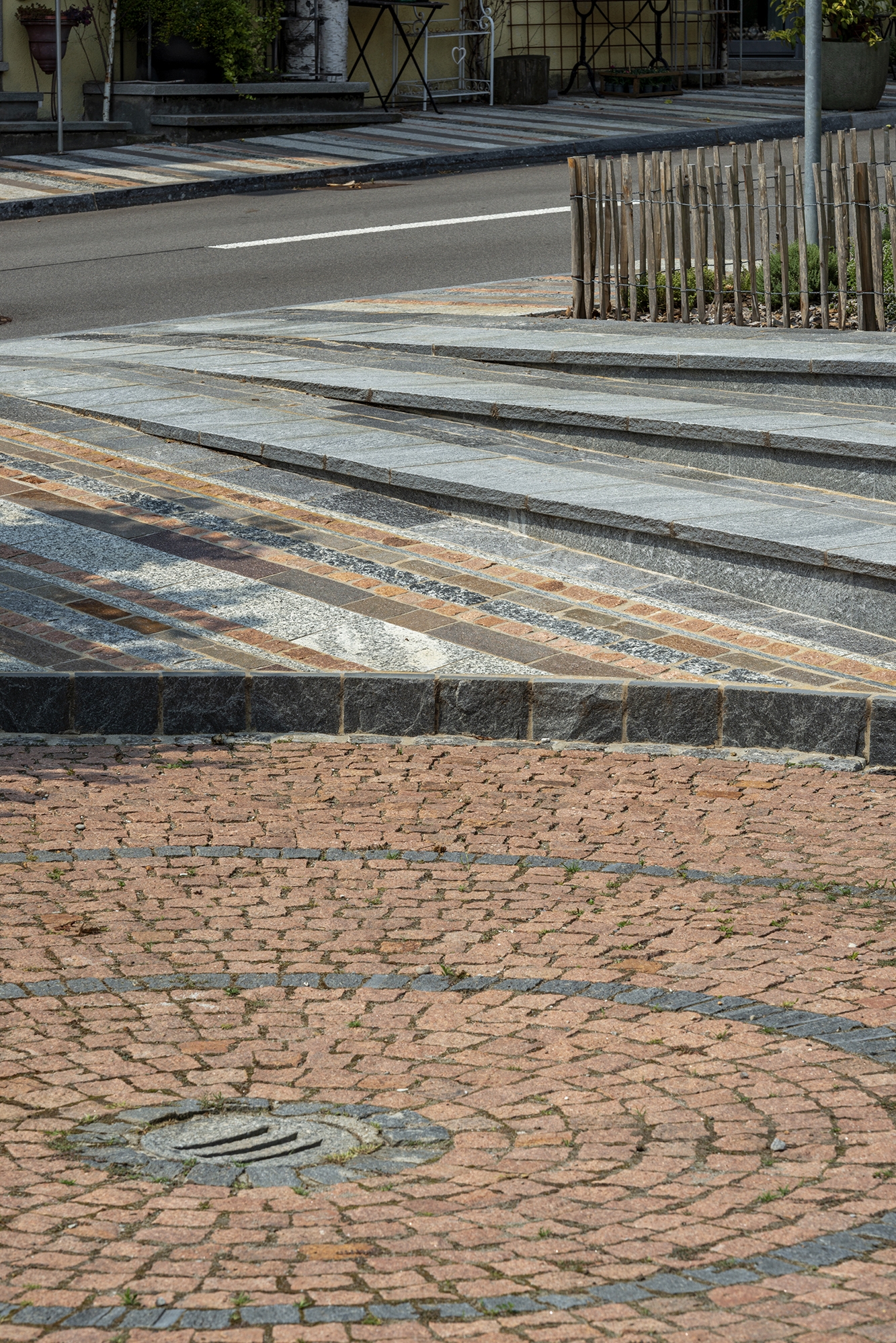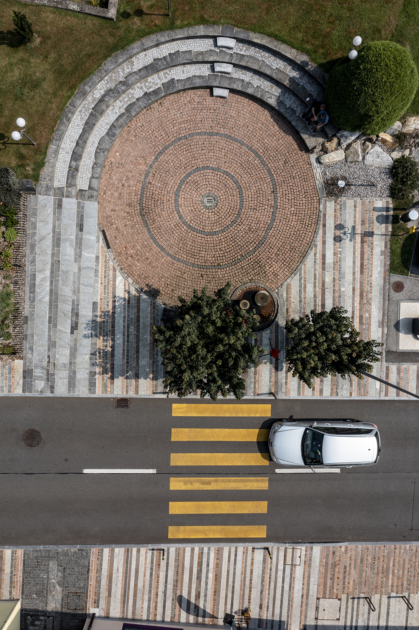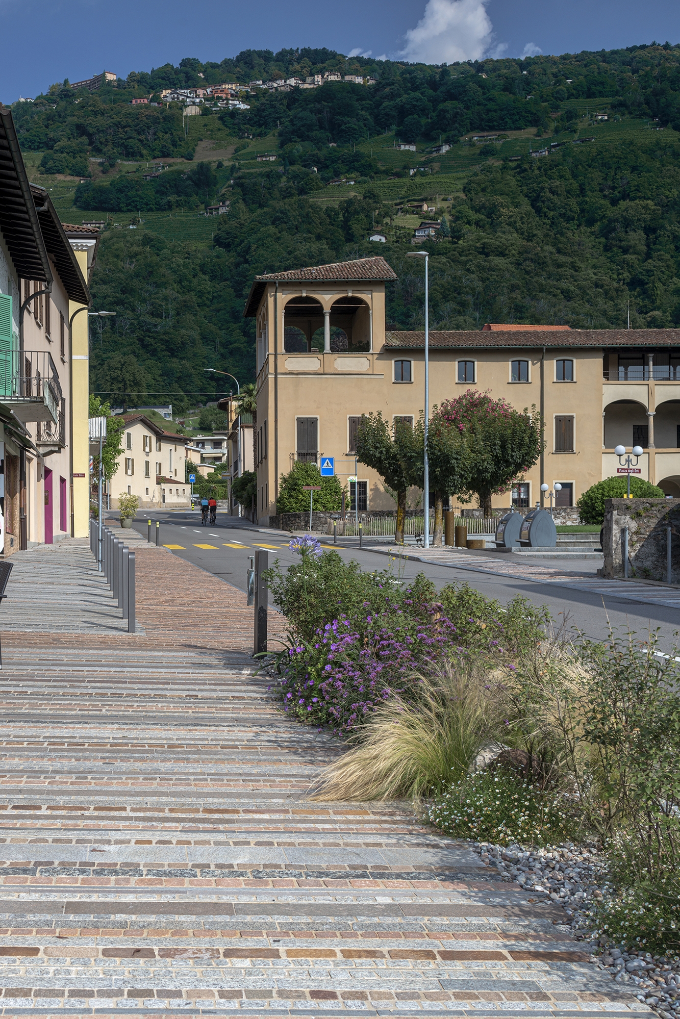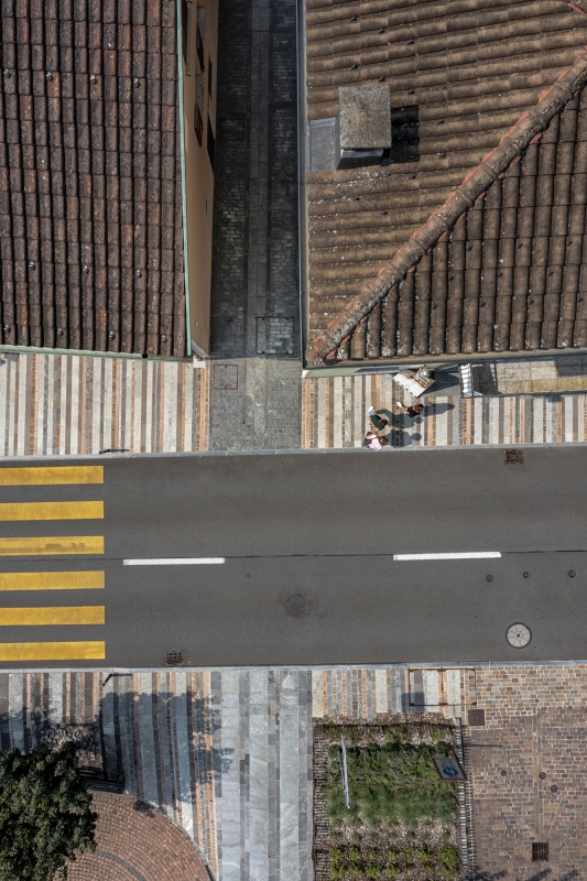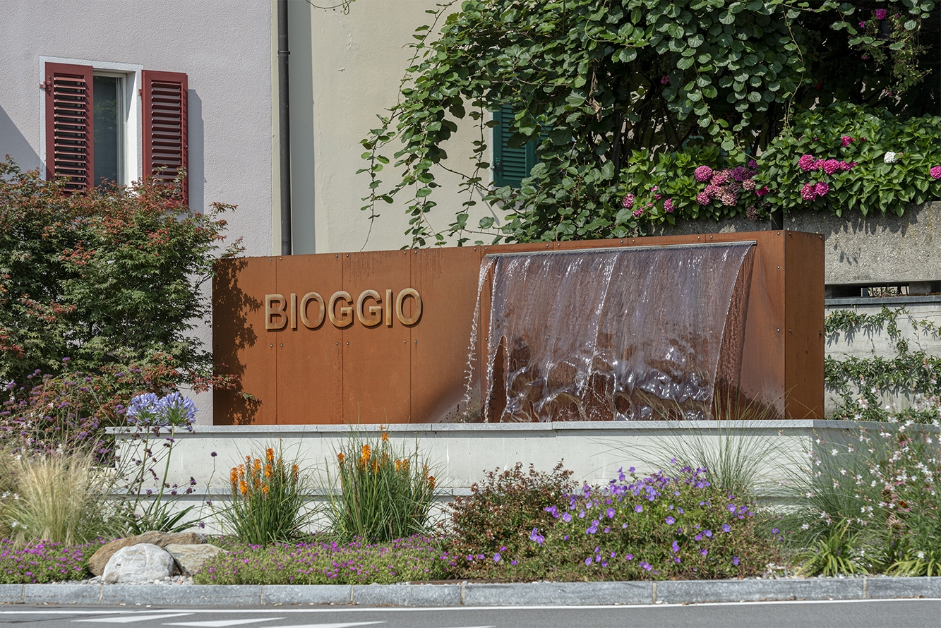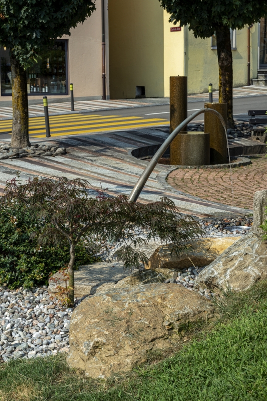 The project redefines the public space affected by the redevelopment of the road axis of “via Cademario”; a road link that crosses the historic center of Bioggio connecting the important road of the Strada Regina (Lugano – Ponte Tresa connection) with the above Malcantone municipalities. The intervention consists of a series of public space reconnection/redevelopment projects and was carried out in synergy with the renewal of the cantonal road that crosses the nucleus for a total length of 185 m. The project includes the entirety of the spaces intended for pedestrian circulation. It starts downstream with the “gateway” of the municipality (area with fountain and green spaces), continues with the reconnection with the “Piazza degli orti”, public transport stops, and ends upstream with the entrance to the Town Hall building. The pedestrian paths were paved with natural stone of different types (1’100 m2), new green areas were created (128 m2), and a fountain with waterfall was built (31 m2)