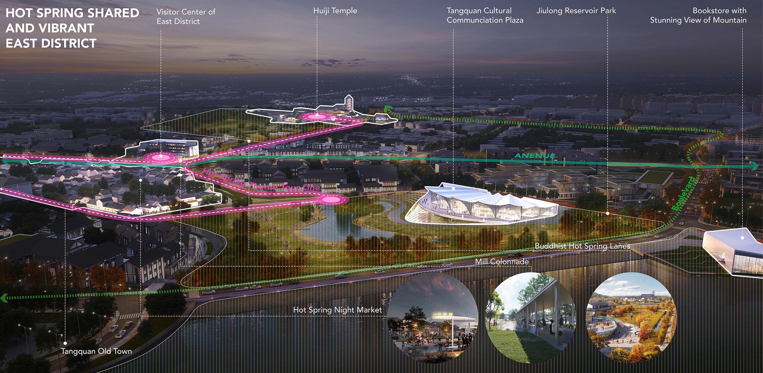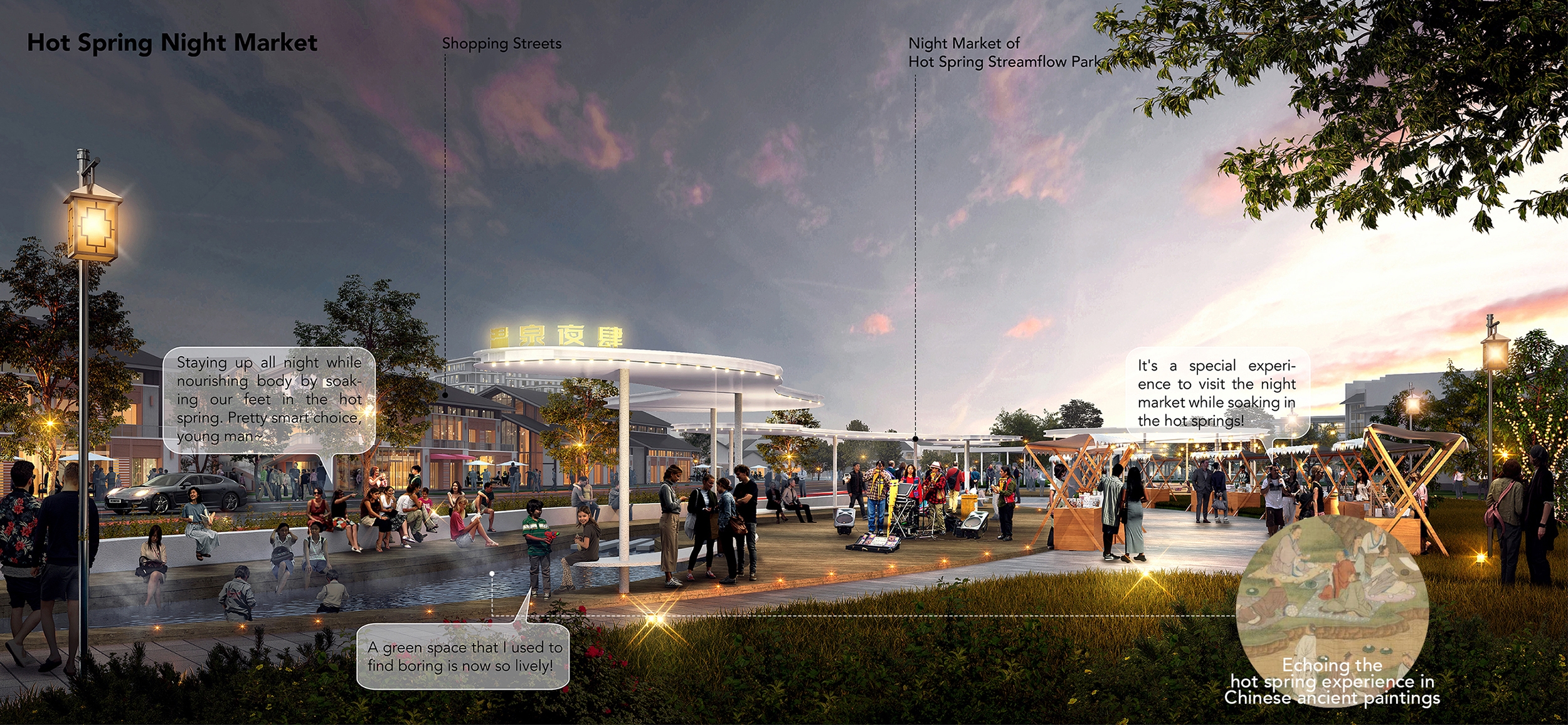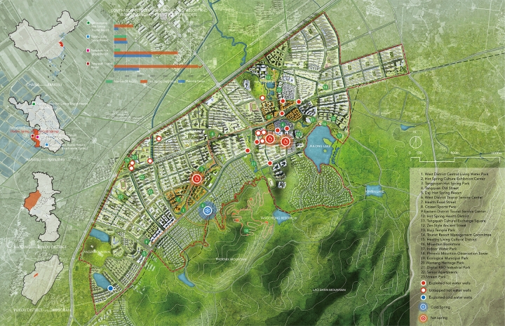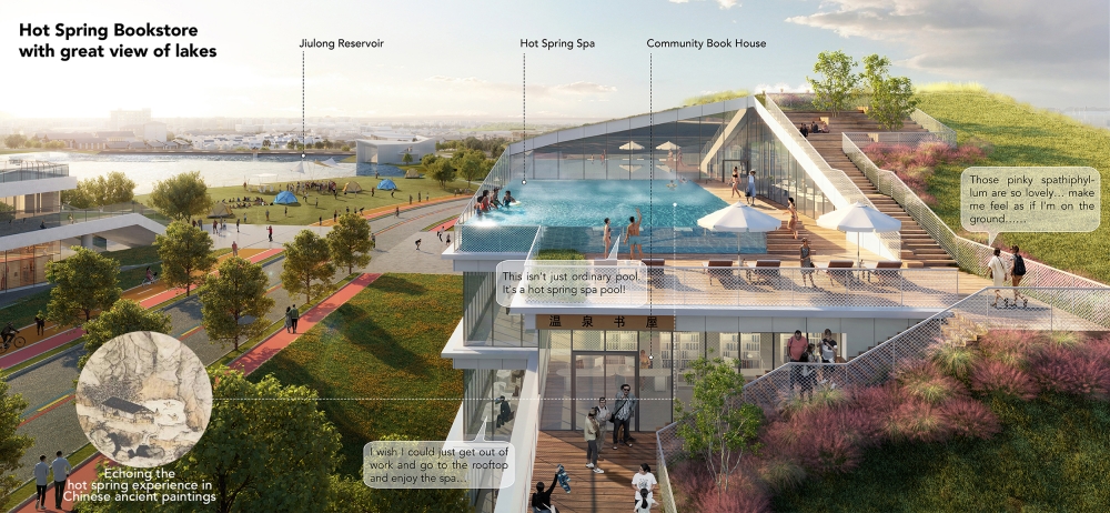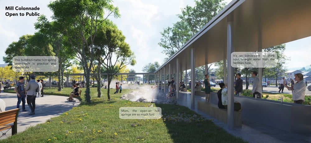 Tangquan Town, with a 1600-year history, is a Jiangnan town known for scenic views, hot springs, ancient forests, and historic temples. It features unique radon and dual-temperature springs, boasting Jiangsu's highest geothermal water flow. Historically, outdoor hot springs and communal baths were common, but many are now privatized or abandoned. To create an eco-friendly, shared hot springs, and vibrant tourism town, the design team proposed publicizing hot springs and developing a themed route with slow traffic lanes, integrating resources with urban spaces for diverse, communal experiences.