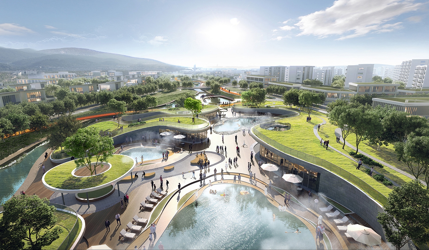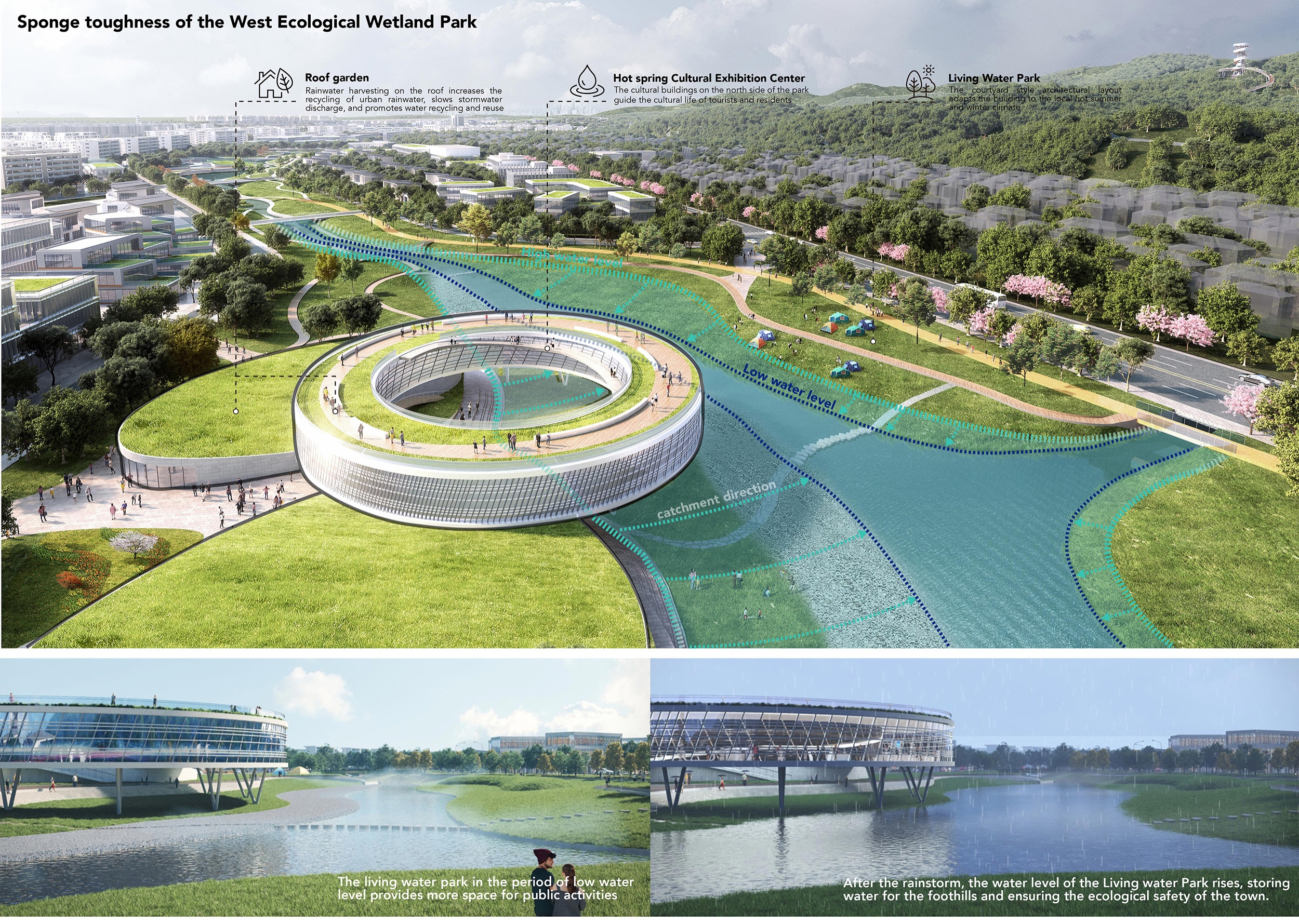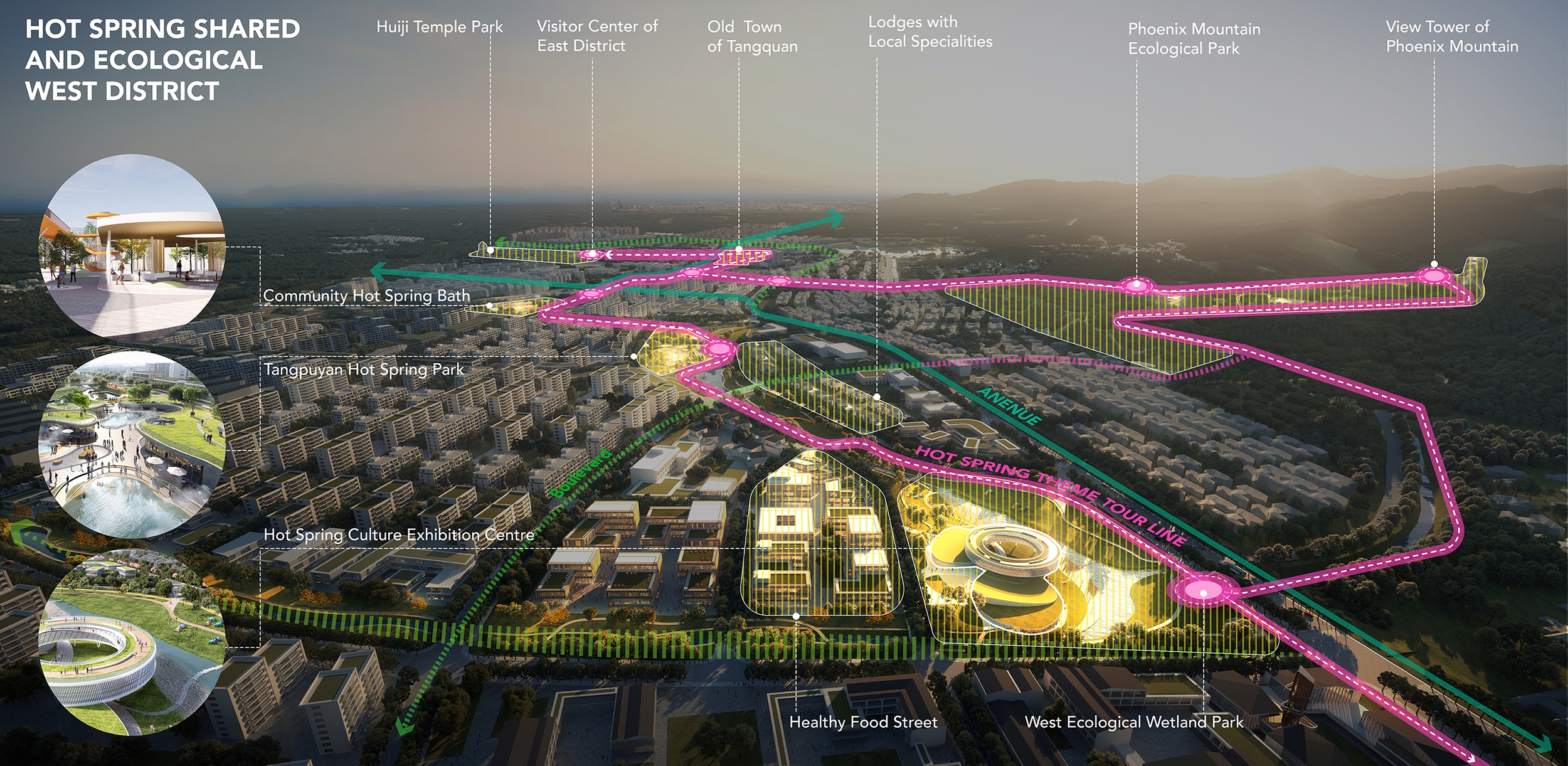 Tangquan Town, with a 1600-year history, is a Jiangnan town known for scenic views, hot springs, ancient forests, and historic temples. It features unique radon and dual-temperature springs, boasting Jiangsu's highest geothermal water flow. Historically, outdoor hot springs and communal baths were common, but many are now privatized or abandoned. To create an eco-friendly, shared hot springs, and vibrant tourism town, the design team proposed publicizing hot springs and developing a themed route with slow traffic lanes, integrating resources with urban spaces for diverse, communal experiences.