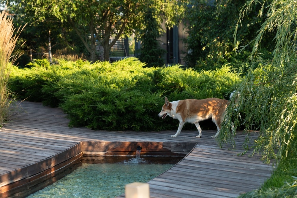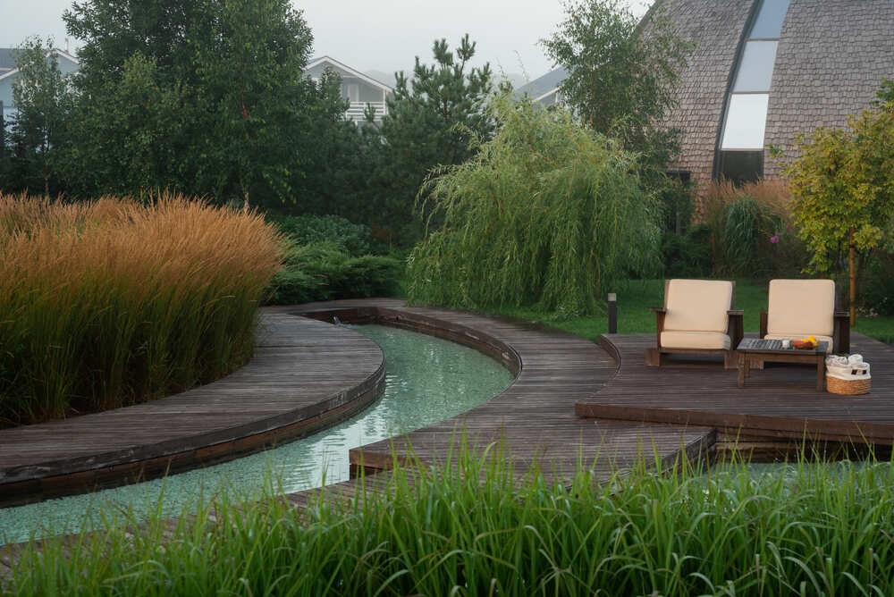 The main element of the garden is a pond with a large mirror of water, which reflects the entire surrounding landscape. In our opinion, we have created a cozy garden in which it will be comfortable and interesting to spend time.