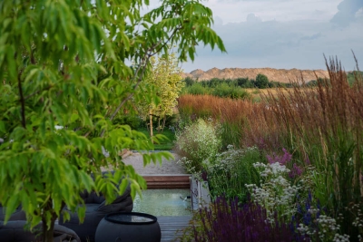 The garden was designed and created for people who have great respect and love for nature. It was necessary to provide a large number of areas for outdoor recreation. All flower beds are made in a natural style, which blends with the surrounding field landscape.