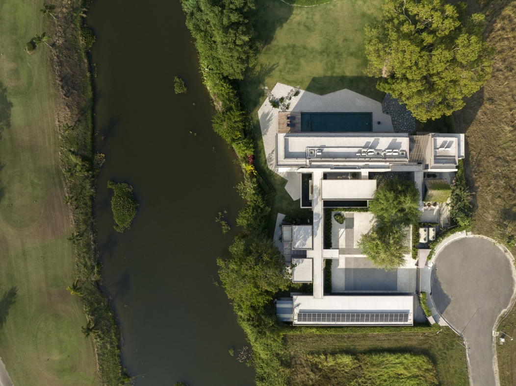 Sequence House, situated on a 3,200 sqm plot adjacent to a lake within a golf course in Rayong, Thailand, is designed for an extended family seeking both privacy and tranquility. Inspired by the Japanese Kaiyu-shiki-teien (Stroll Garden) concept, the layout guides visitors through a thoughtfully curated journey of serene experiences. Upon arrival, guests are welcomed at the entrance and led through a peaceful front garden with various viewpoints. The journey begins at the arrival court, gym and reception room, offering glimpses of the property’s natural harmony. Beyond a Travertine wall, guests enter the private zone, where they are greeted by the stunning centerpiece—the back garden, featuring the Karesansui, a dry rock garden, meticulously positioned to be viewed from the main house’s living and dining rooms. The house was built in a very simple concept, undecorated style, reminiscent of the Japanese architecture in The Edo period, called Sukiya style, a prototype for future Japanese architecture. This design seamlessly blends openness with seclusion, creating an inviting yet intimate retreat for family and friends.