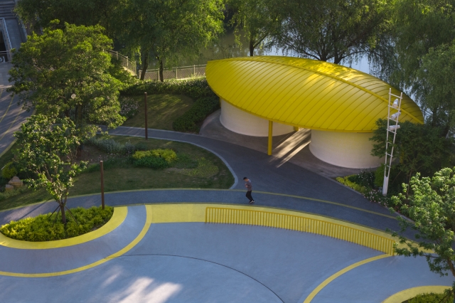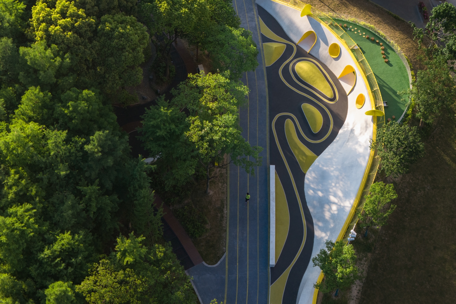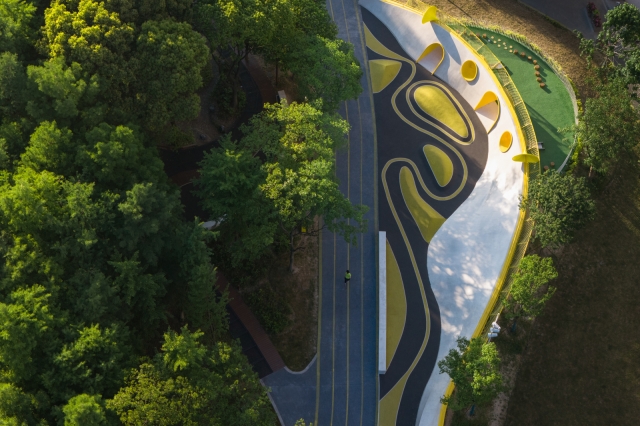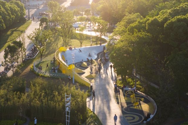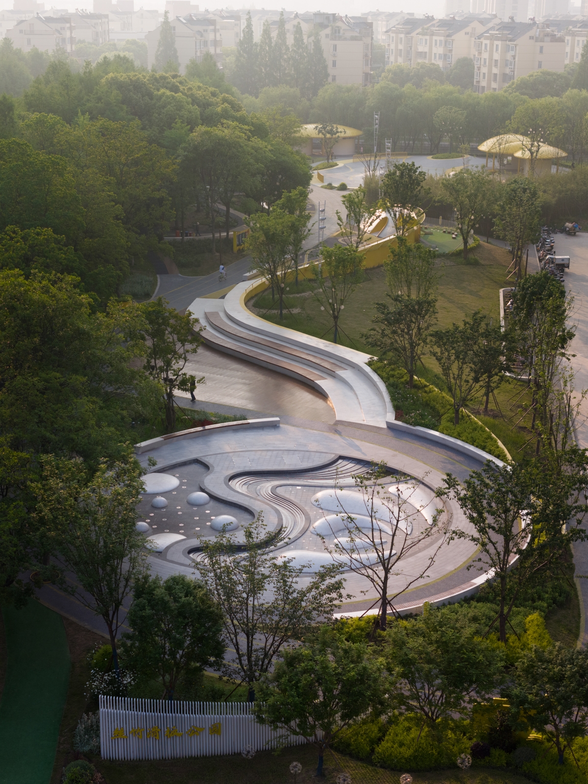 Inspired by traditional Jiangnan instruments, the park design integrates cultural heritage with the natural landscape, creating a community amusement park with diverse activities. The layout features smooth, silk and bamboo-inspired curves, a jogging track, and divides the park into a riverside green belt and a dynamic recreational area.
