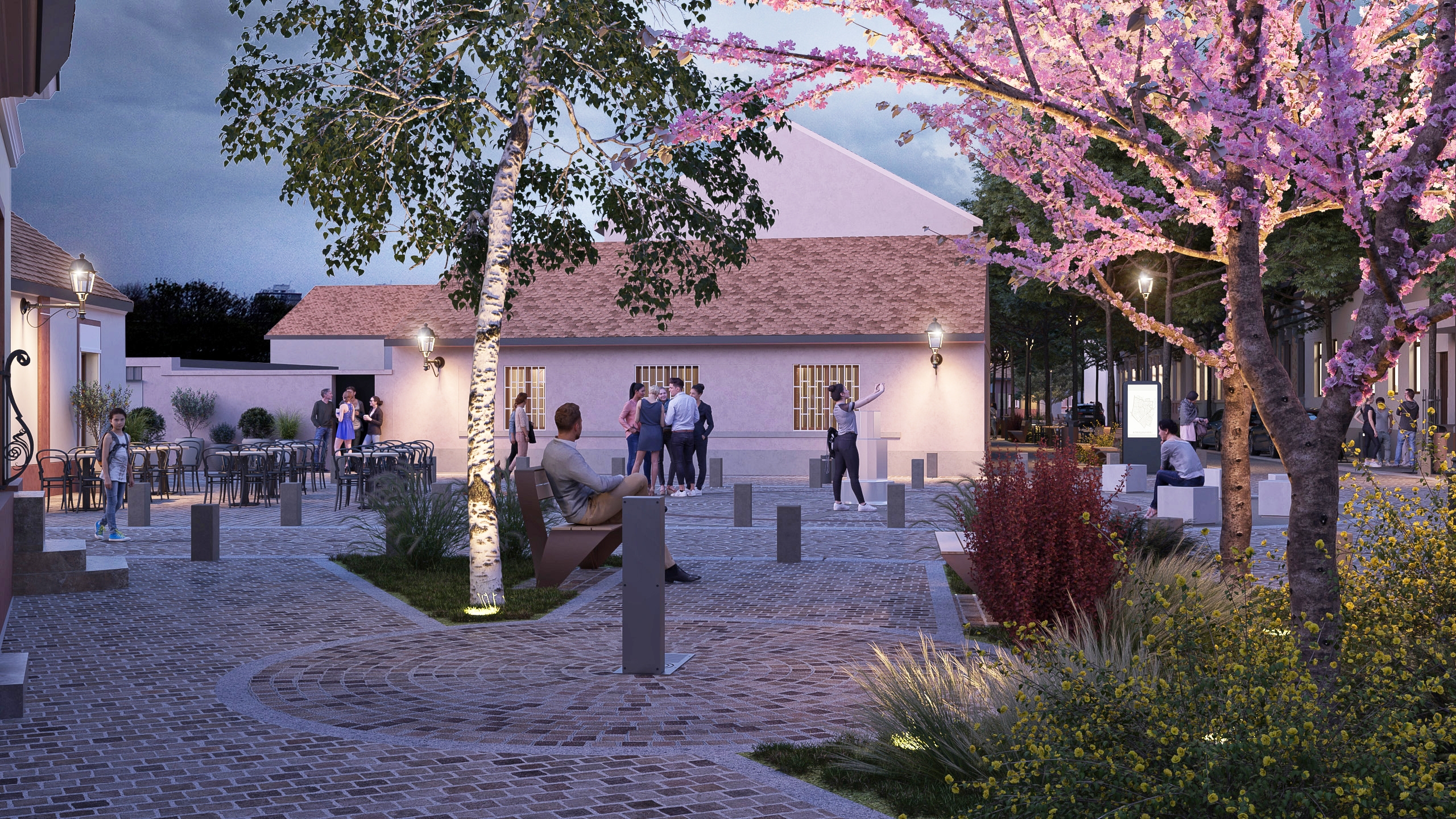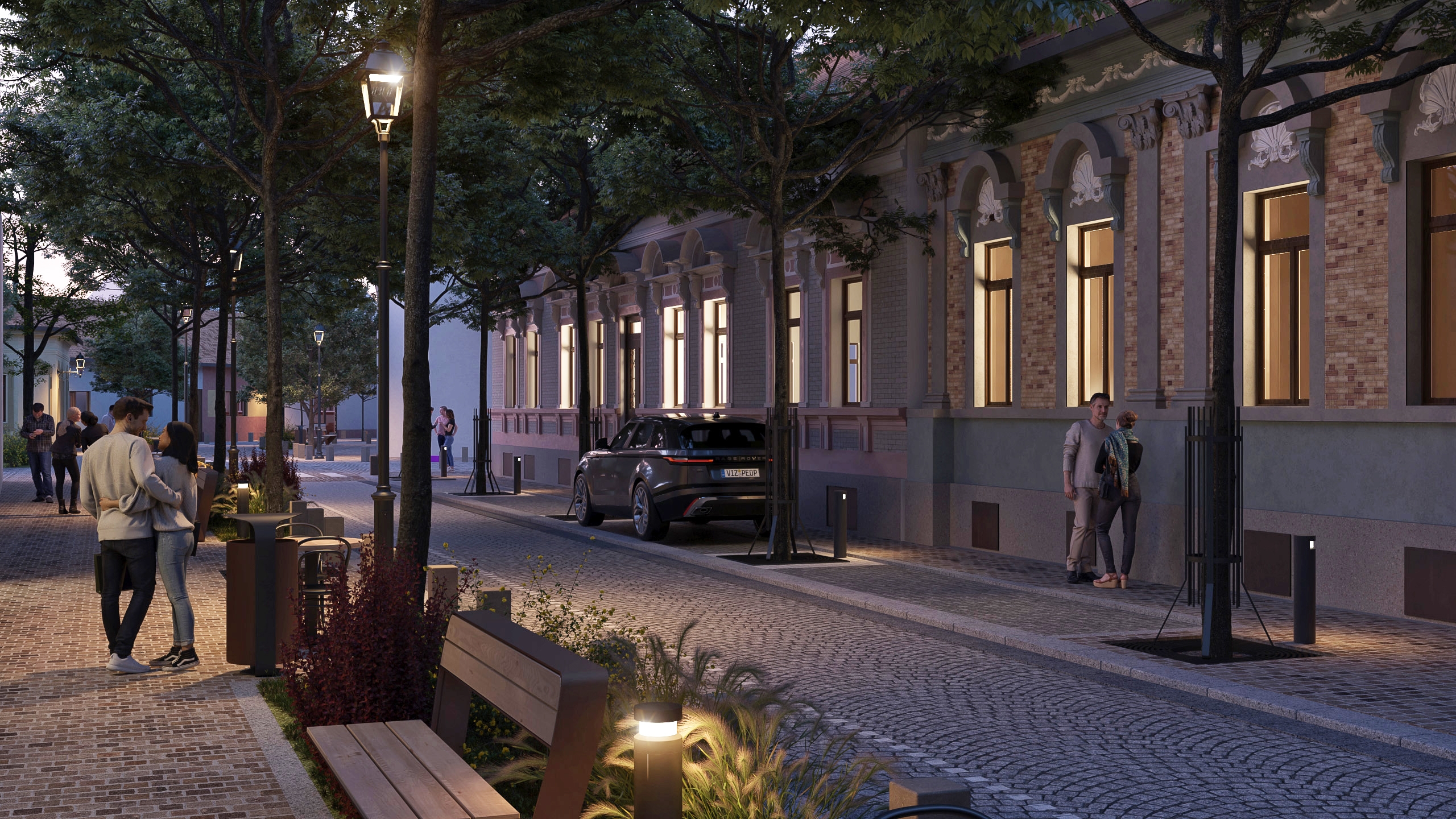 The transformation focuses on reducing car traffic by expanding the pedestrian zone, calming traffic, and restricting parking to residents, while visitor parking is moved to nearby garages. Emphasis is placed on creating new tree lines and small squares, with lighting inspired by traditional street lanterns and natural cobblestone paving in earth tones.