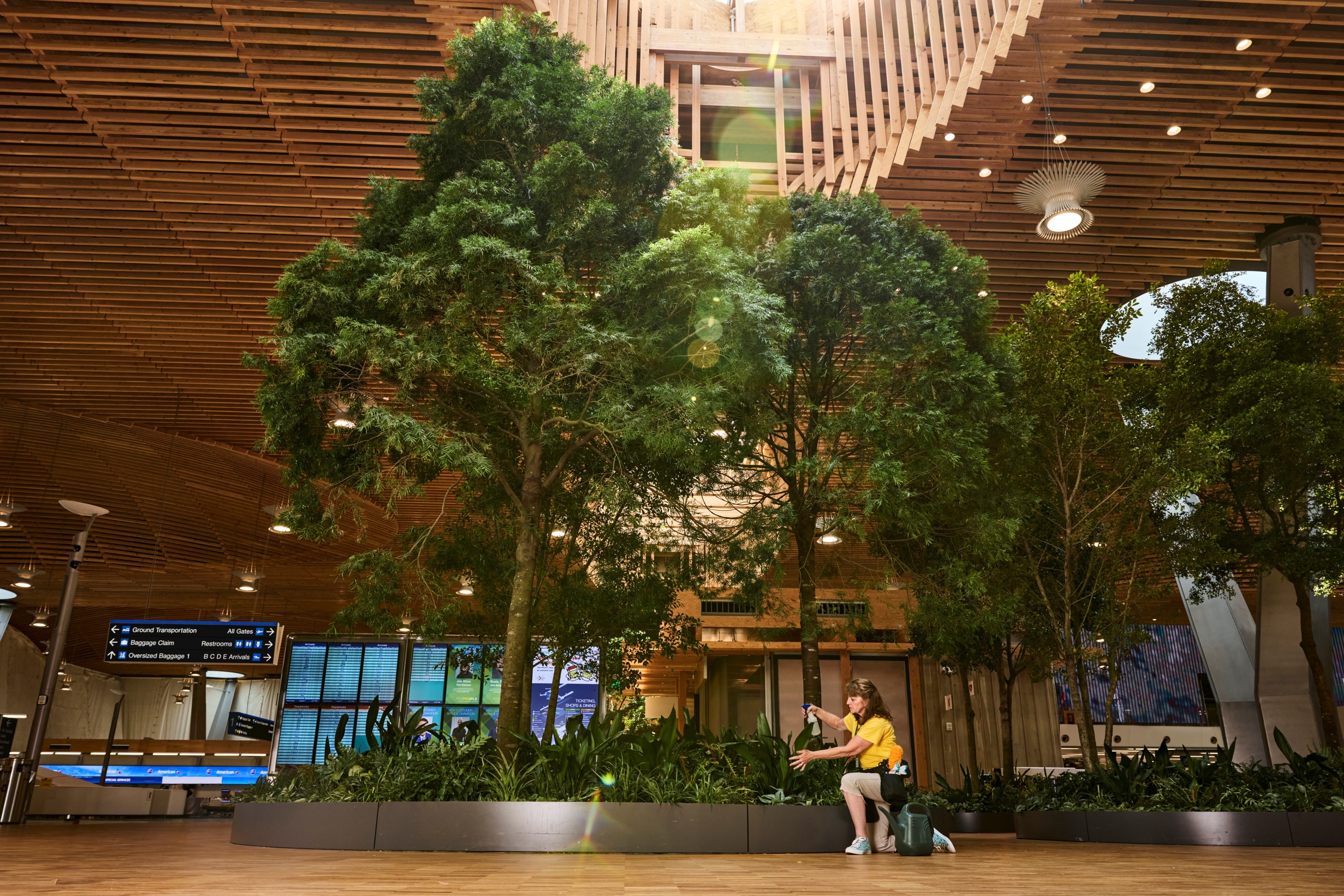 The park-like terminal, featuring 70 large mature trees and 5,000 cascading plants beneath a stunning, locally sourced 9-acre mass timber roof, strategically offers wayfinding. The tree-lined shopping corridor showcases local flavors and tastes, while Oregon-inspired digital landscape artworks complete the immersive experience, welcoming all to Portland’s newest destination.
