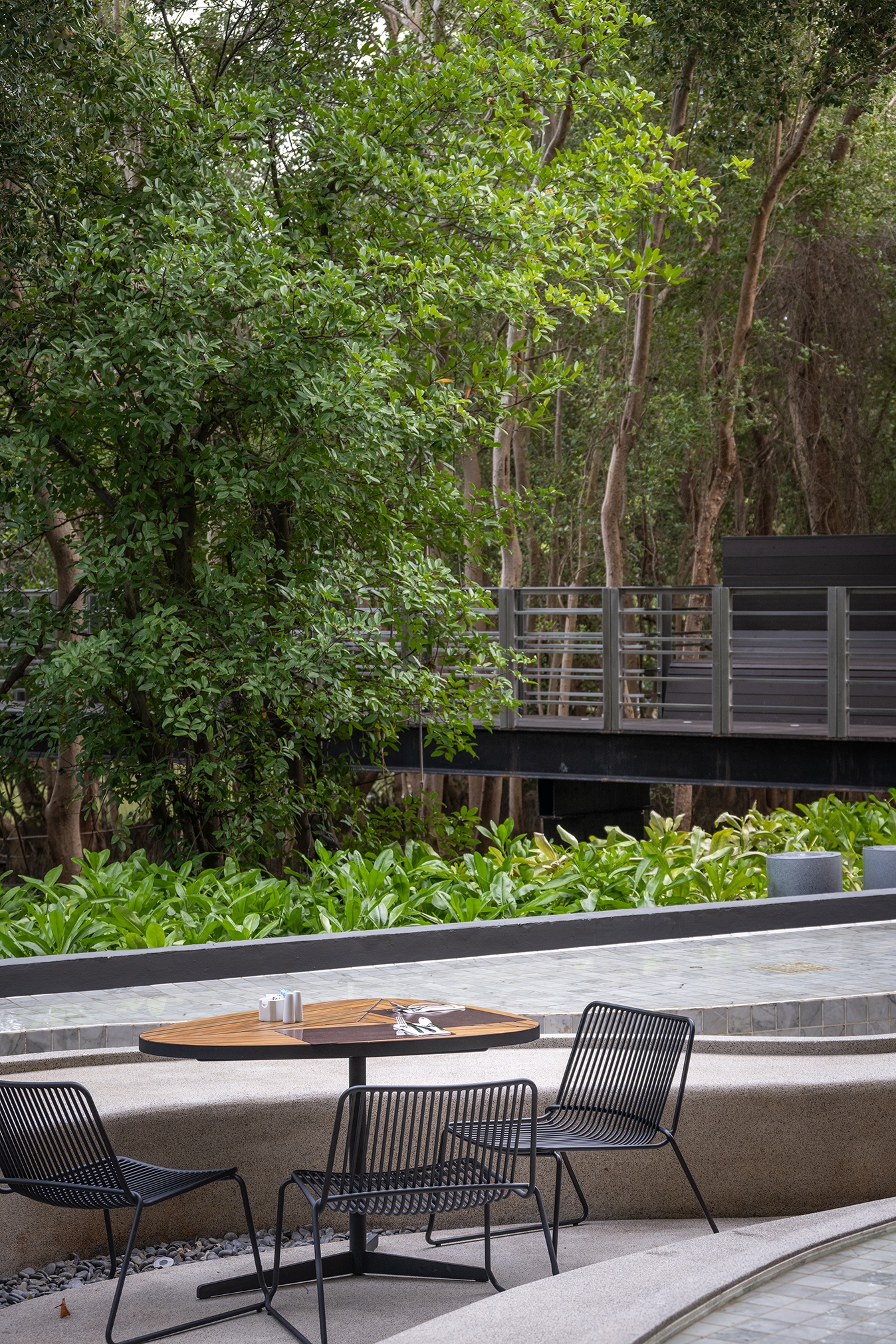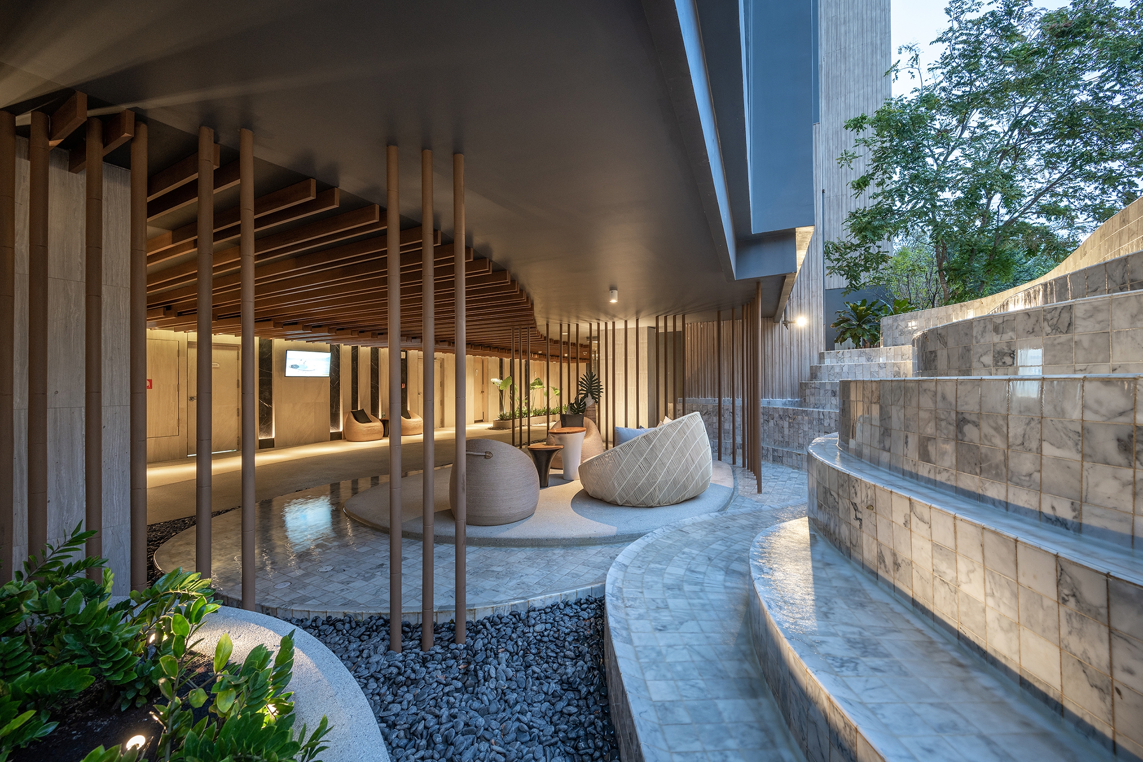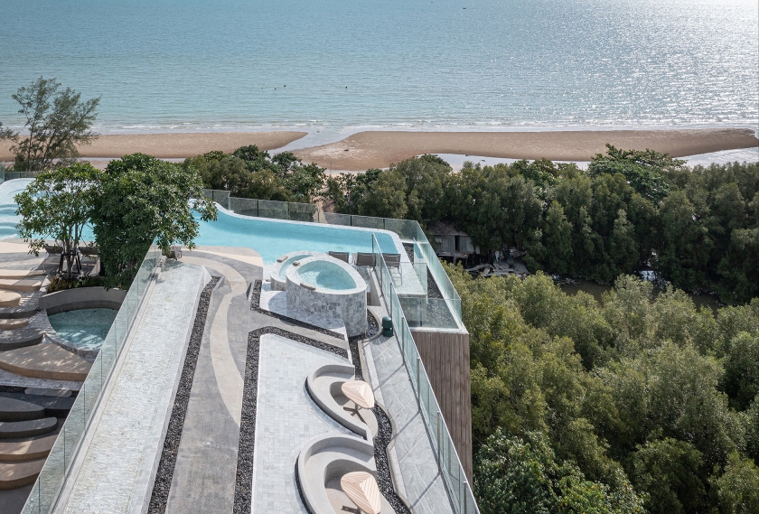 The hotel's design is inspired by indigenous customs that employ bamboo and mangrove sticks to form sediment layers, and it replicates the natural reclamation process. The rooftop pool offers panoramic sea views, while the ground-floor lobby has an open-air design with a waterfall, a reflecting pond, and a dynamic feature wall. Flowing patterns on the ground floor mimic the movement of the sea, while elements such as cascading water and a pop-up jacuzzi depict the beach.
