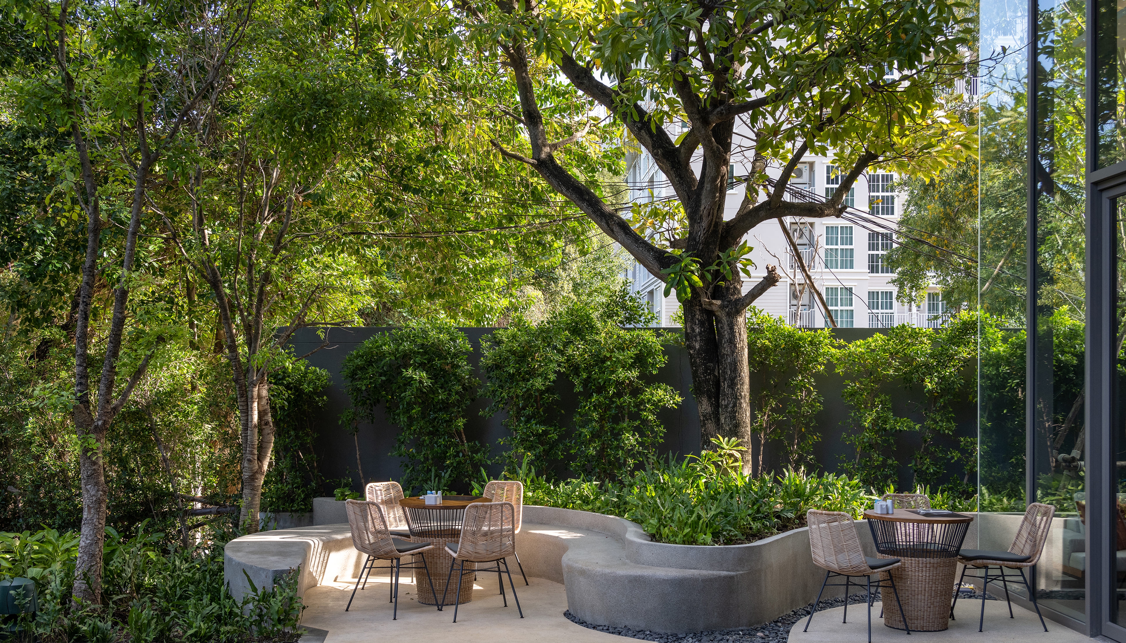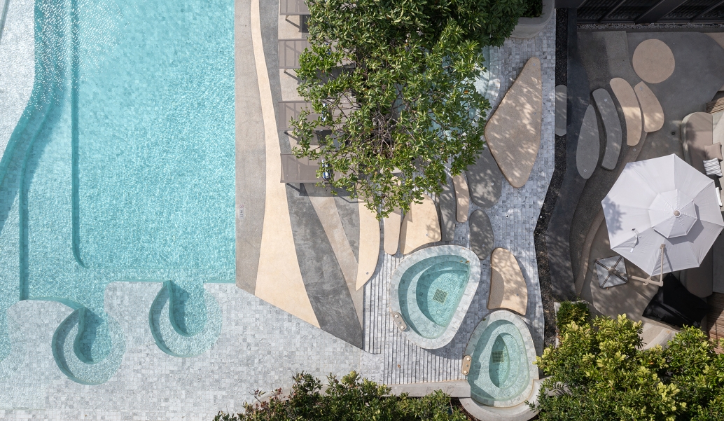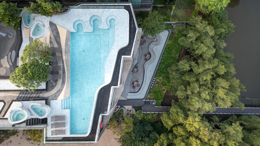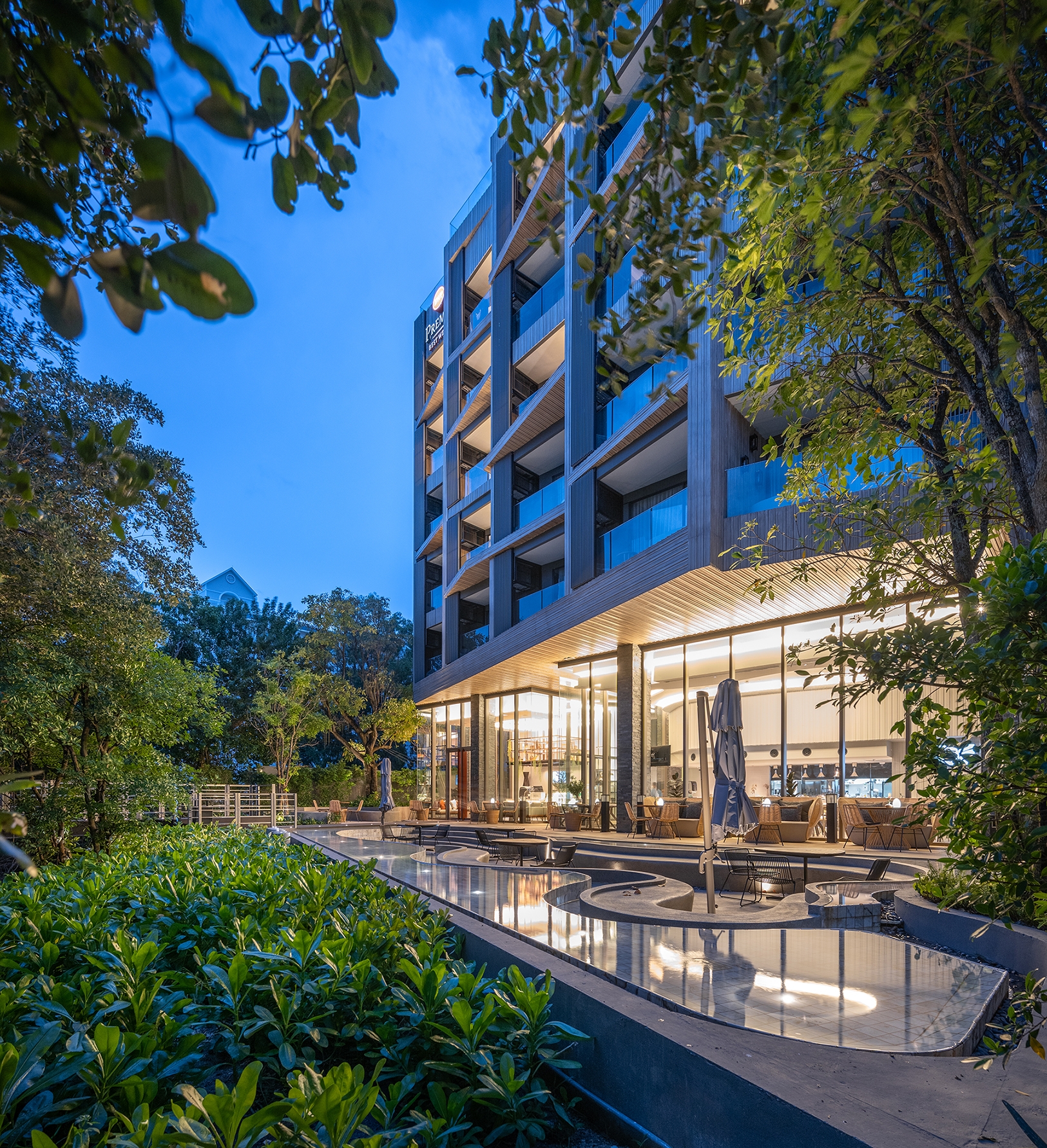 The hotel's design is inspired by indigenous customs that employ bamboo and mangrove sticks to form sediment layers, and it replicates the natural reclamation process. The rooftop pool offers panoramic sea views, while the ground-floor lobby has an open-air design with a waterfall, a reflecting pond, and a dynamic feature wall. Flowing patterns on the ground floor mimic the movement of the sea, while elements such as cascading water and a pop-up jacuzzi depict the beach.