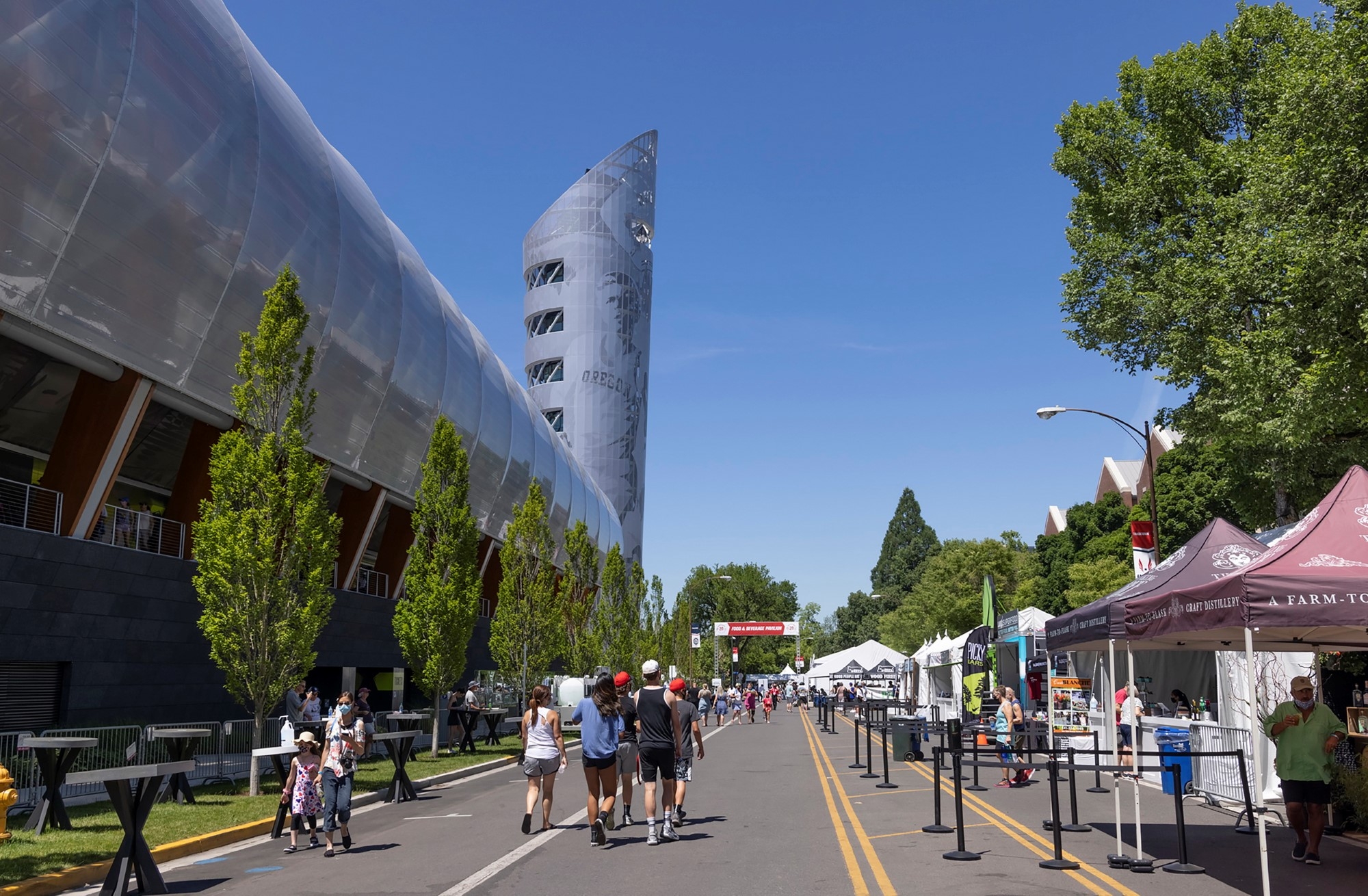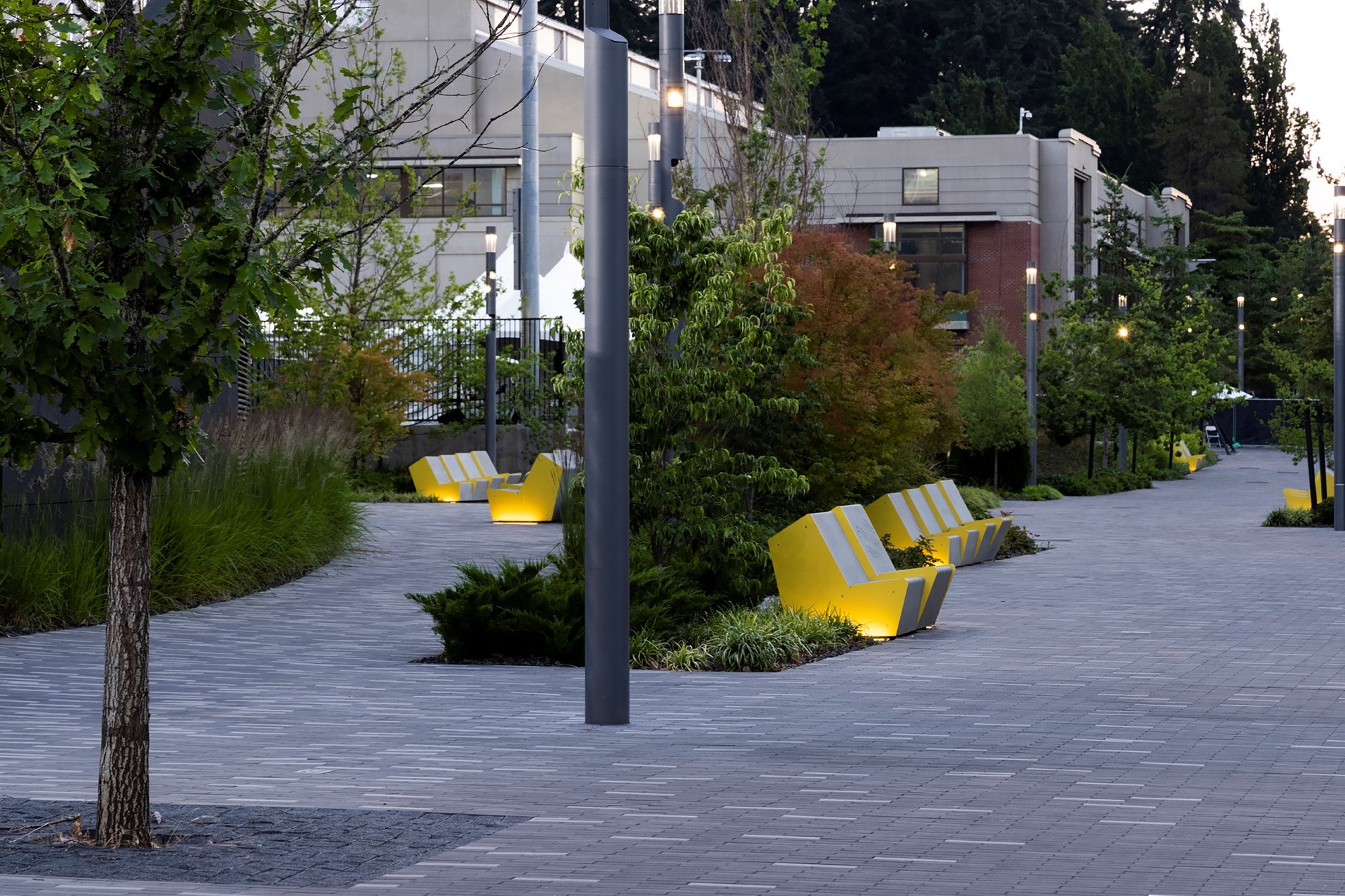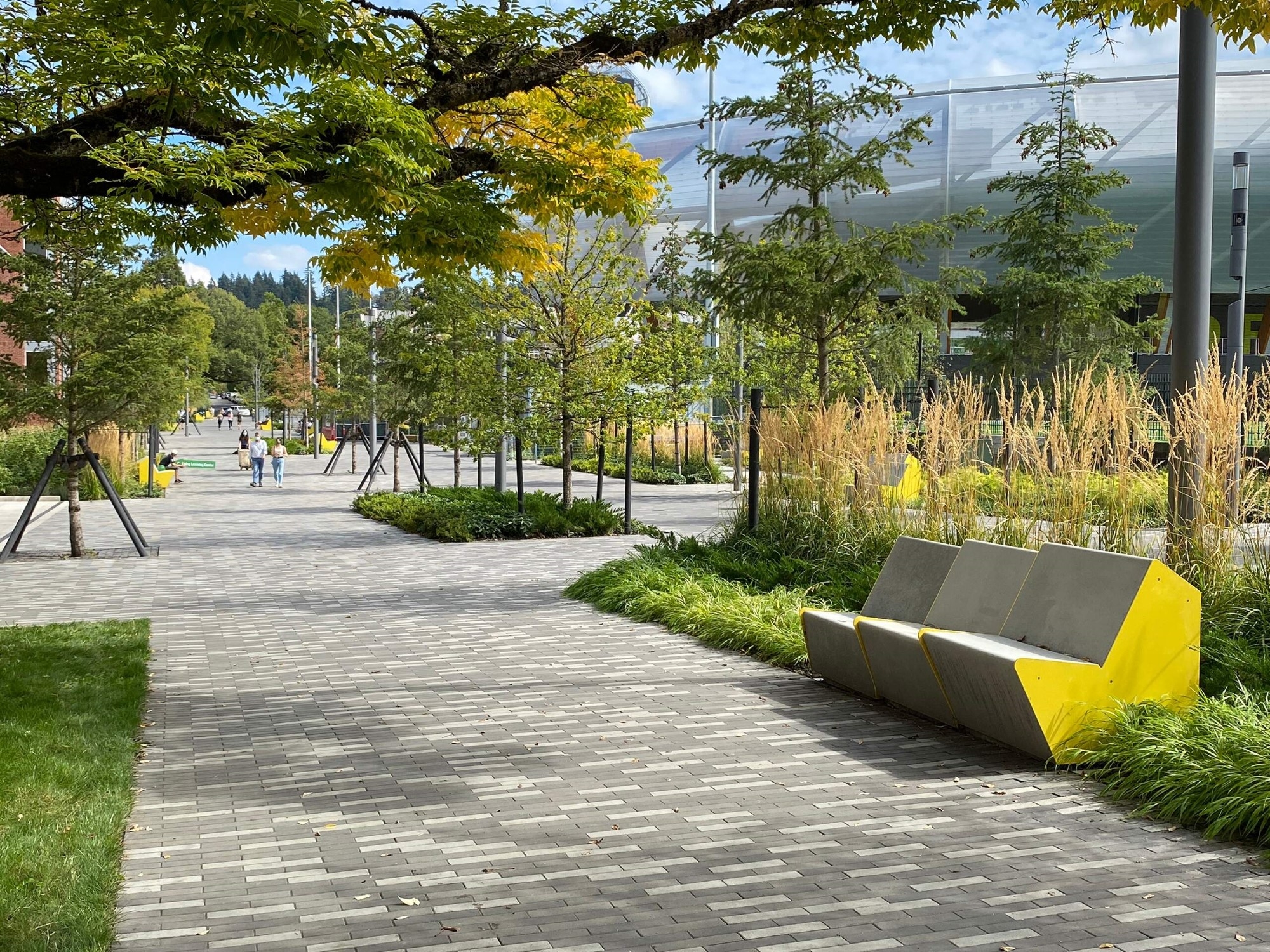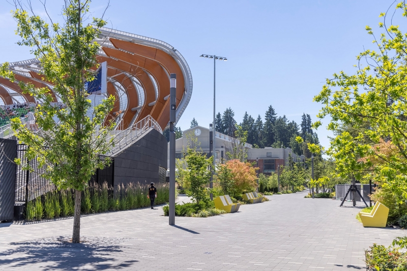 The landscape biodiversity design approach reduced the consumption of resources. Scalable LID strategies naturally filter stormwater, fulfilling the University’s goals. Native plants and habitats restore lush softscapes in the plaza and corridor, featuring large Douglas Firs providing shade, reducing urban heat islands, and decreasing pollution and greenhouse gas emissions. Propelling athletes’ aspirations, Douglas Firs’ branching structure provides local birds, animals, and insects a home, while accommodating pedestrian and vehicular movement.