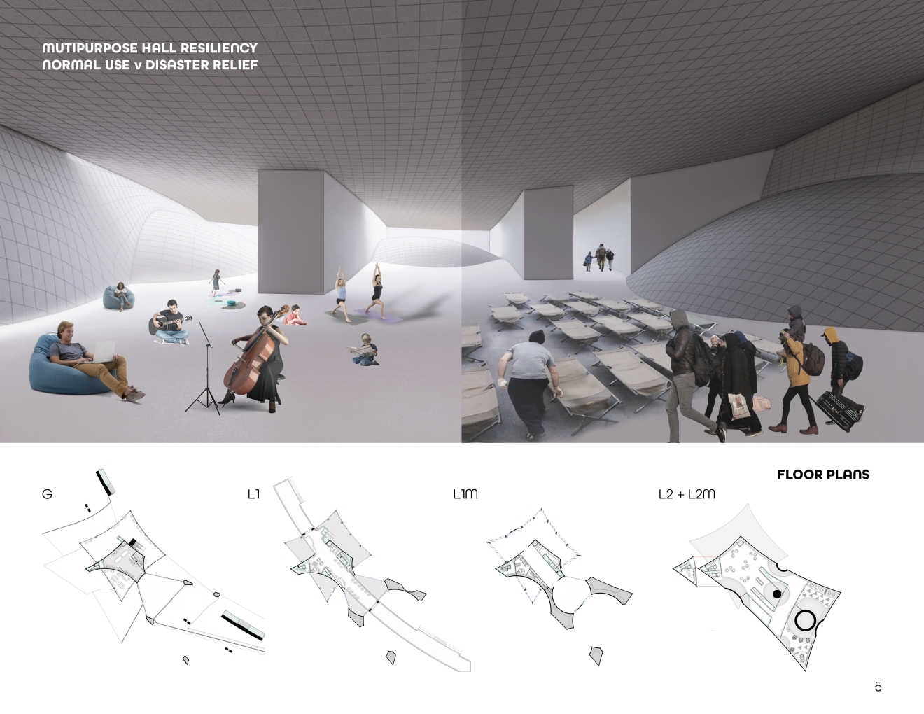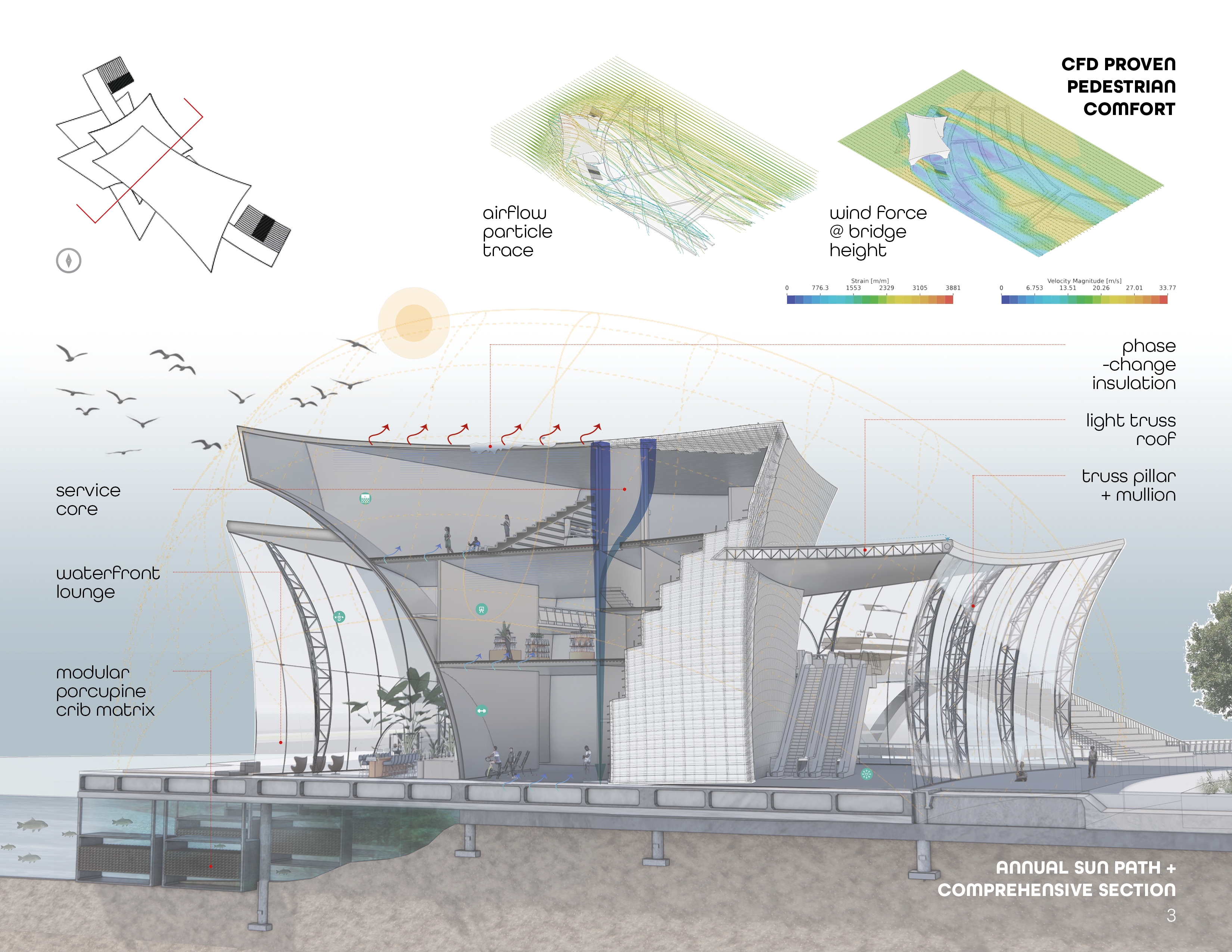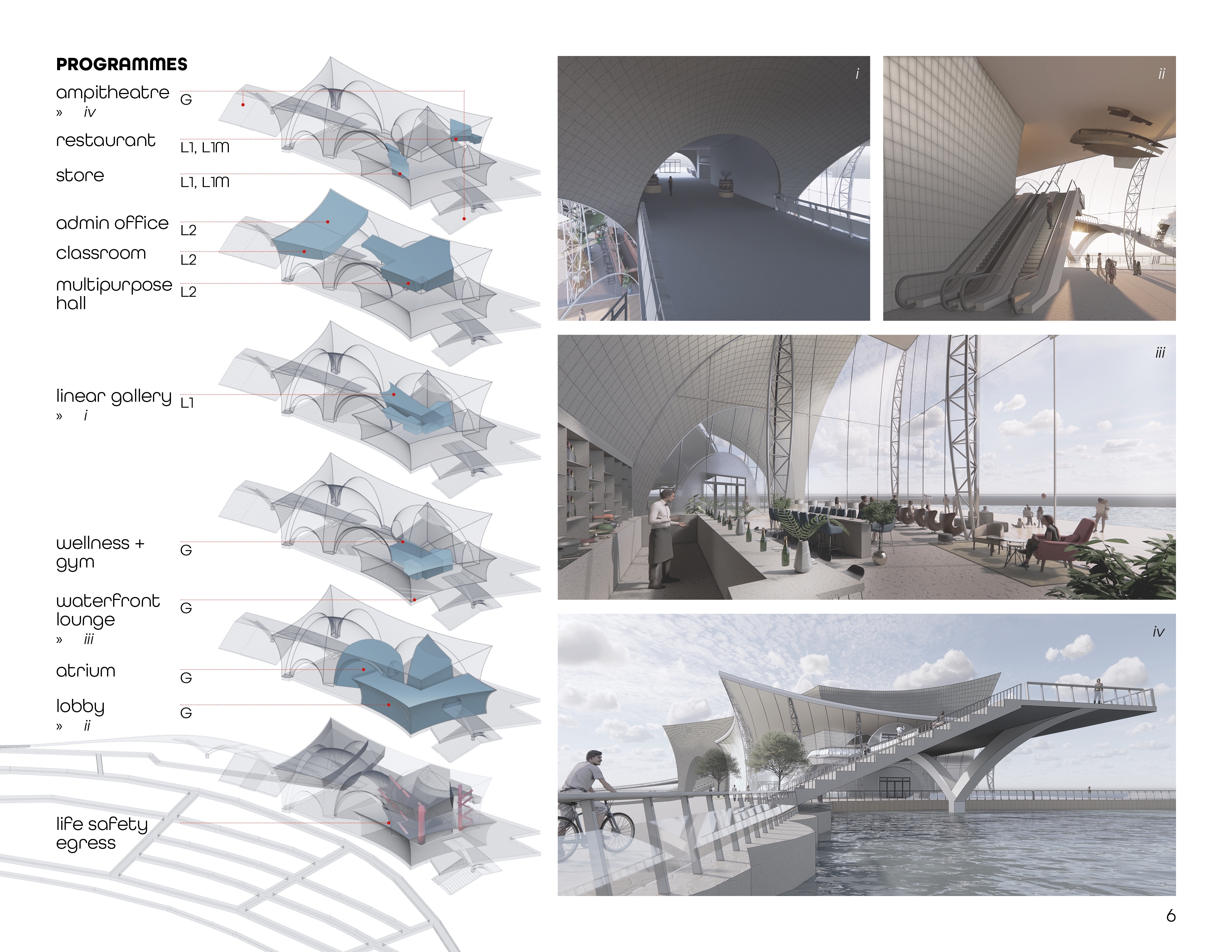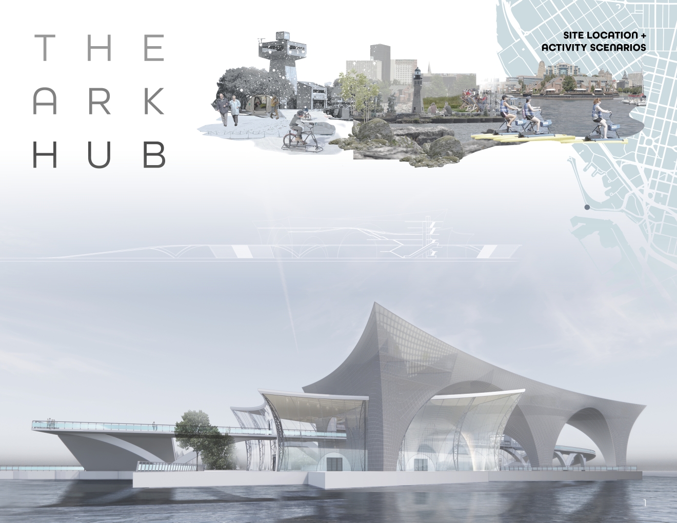 Buffalo, NY suffered from a severe winter storm in late 2022. A reliable disaster relief building is needed to prepare citizens for future severe colds. Ancient masonry structures that have stood in the weather for centuries provide new thinking for today's resilient architecture. Located at Erin Basin Marina, the Ark Hub celebrates the renowned local boat culture. The form of the building visually mimics the outstretched sails and is consistent with the traditionally enduring arches and vaults. The elevated entrance protects the arterial circulation from snow blockages, and the pedestrian bridge connecting to the surrounding urban contexts offers an accessible promenade. The main programs feature a multipurpose hall that transforms into a disaster relief assembly in case of blizzards and a waterfront lounge with a deck that encourages natural engagement. Other supporting programs include a retail store, a restaurant, a collaborative classroom, a wellness gym, a linear gallery, and two outdoor amphitheatres.
