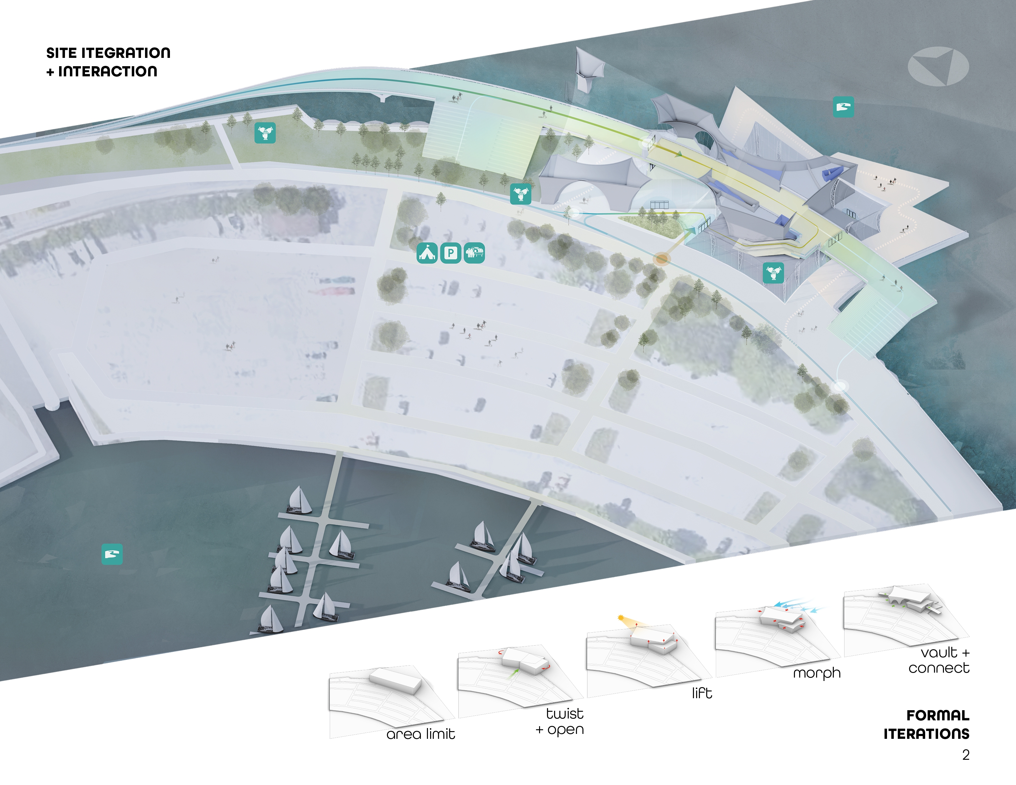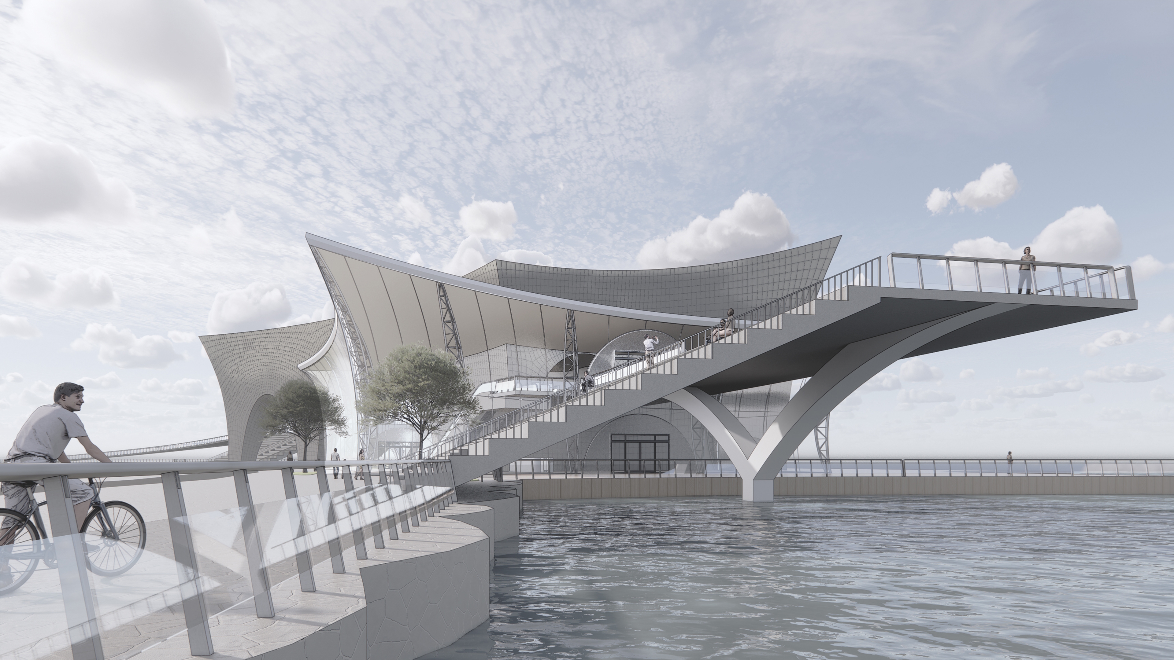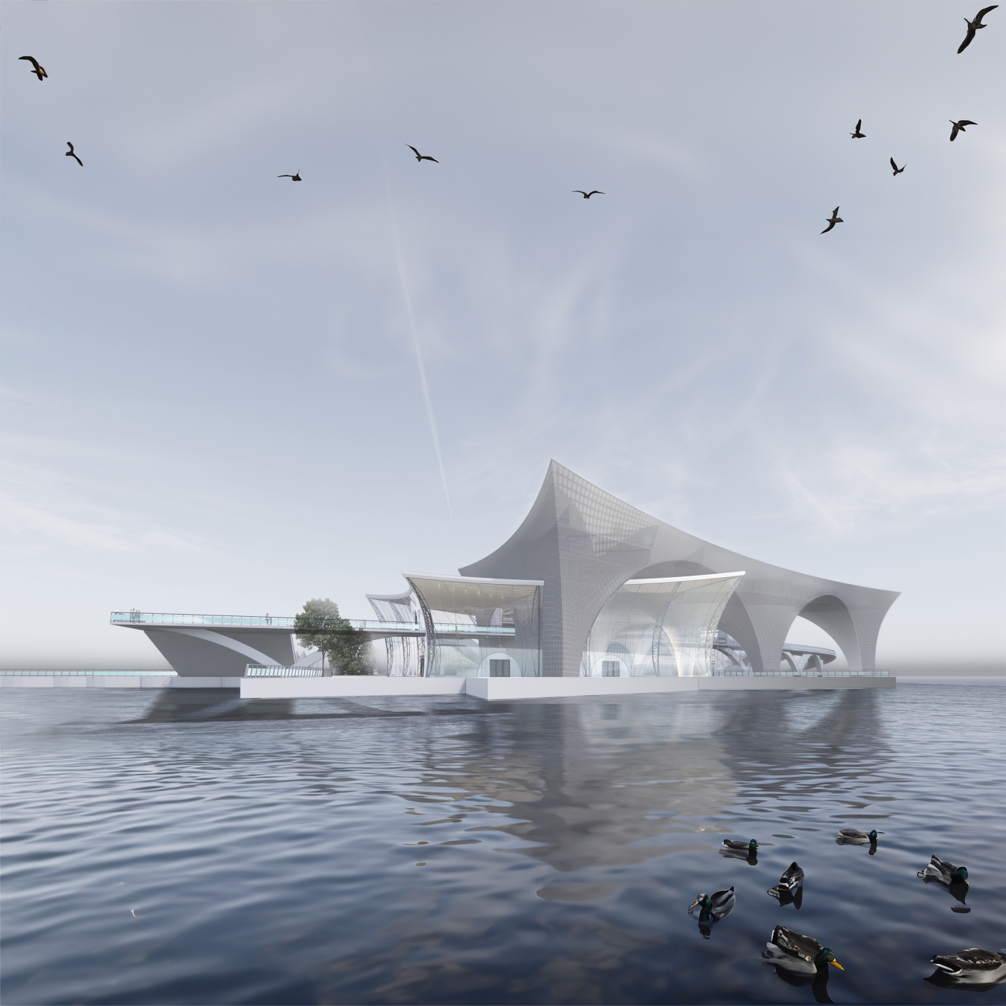 Buffalo, NY suffered from a severe winter storm in late 2022. A reliable disaster relief building is needed to prepare citizens for future severe colds. Ancient masonry structures that have stood in the weather for centuries provide new thinking for today's resilient architecture. Located at Erin Basin Marina, the Ark Hub celebrates the renowned local boat culture. The form of the building visually mimics the outstretched sails and is consistent with the traditionally enduring arches and vaults. The elevated entrance protects the arterial circulation from snow blockages, and the pedestrian bridge connecting to the surrounding urban contexts offers an accessible promenade. The main programs feature a multipurpose hall that transforms into a disaster relief assembly in case of blizzards and a waterfront lounge with a deck that encourages natural engagement. Other supporting programs include a retail store, a restaurant, a collaborative classroom, a wellness gym, a linear gallery, and two outdoor amphitheatres.