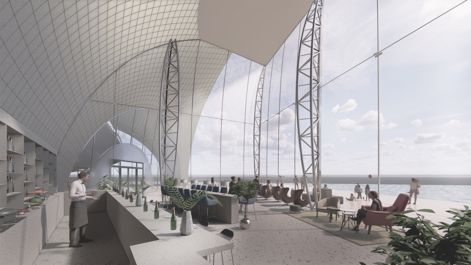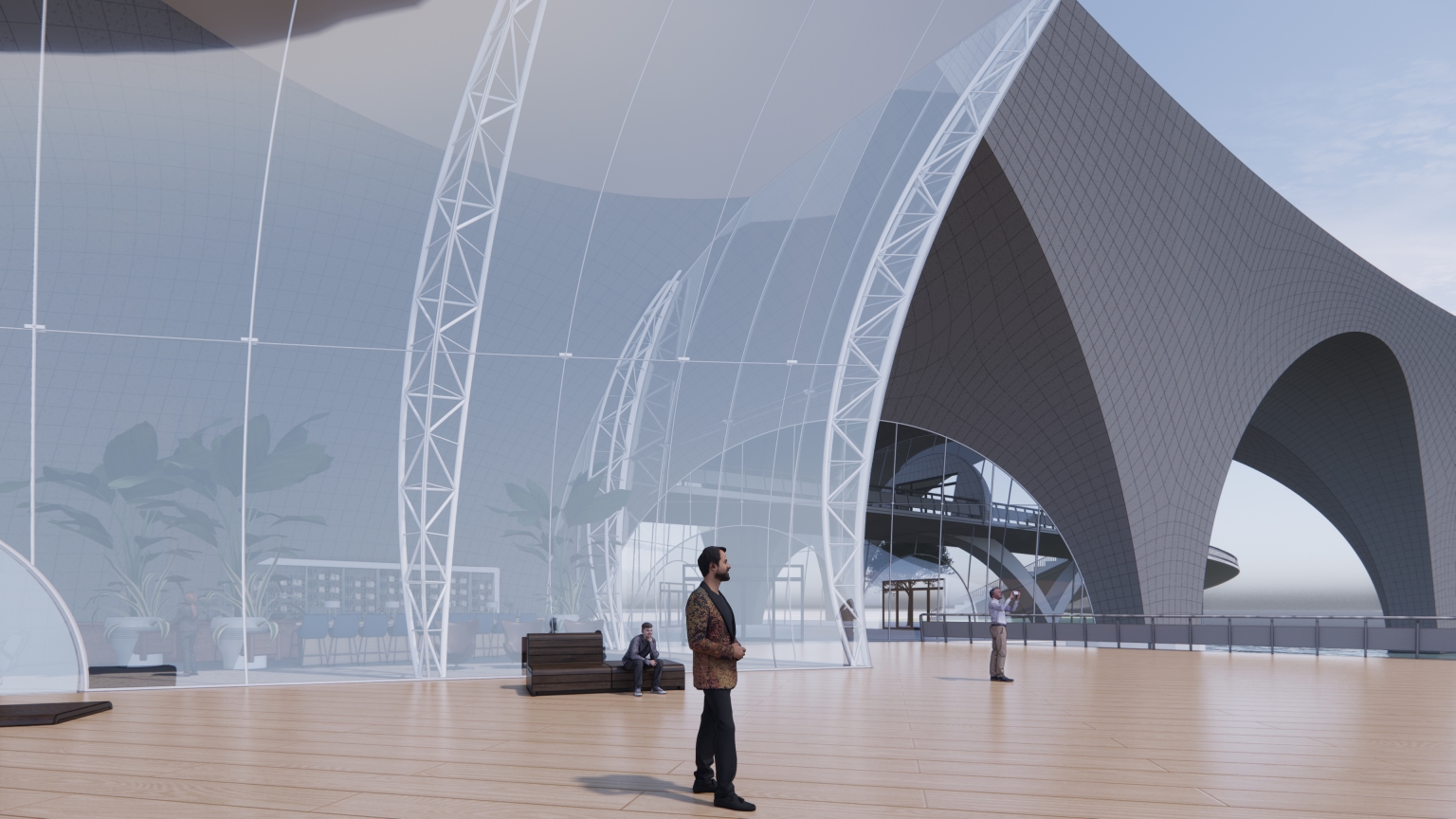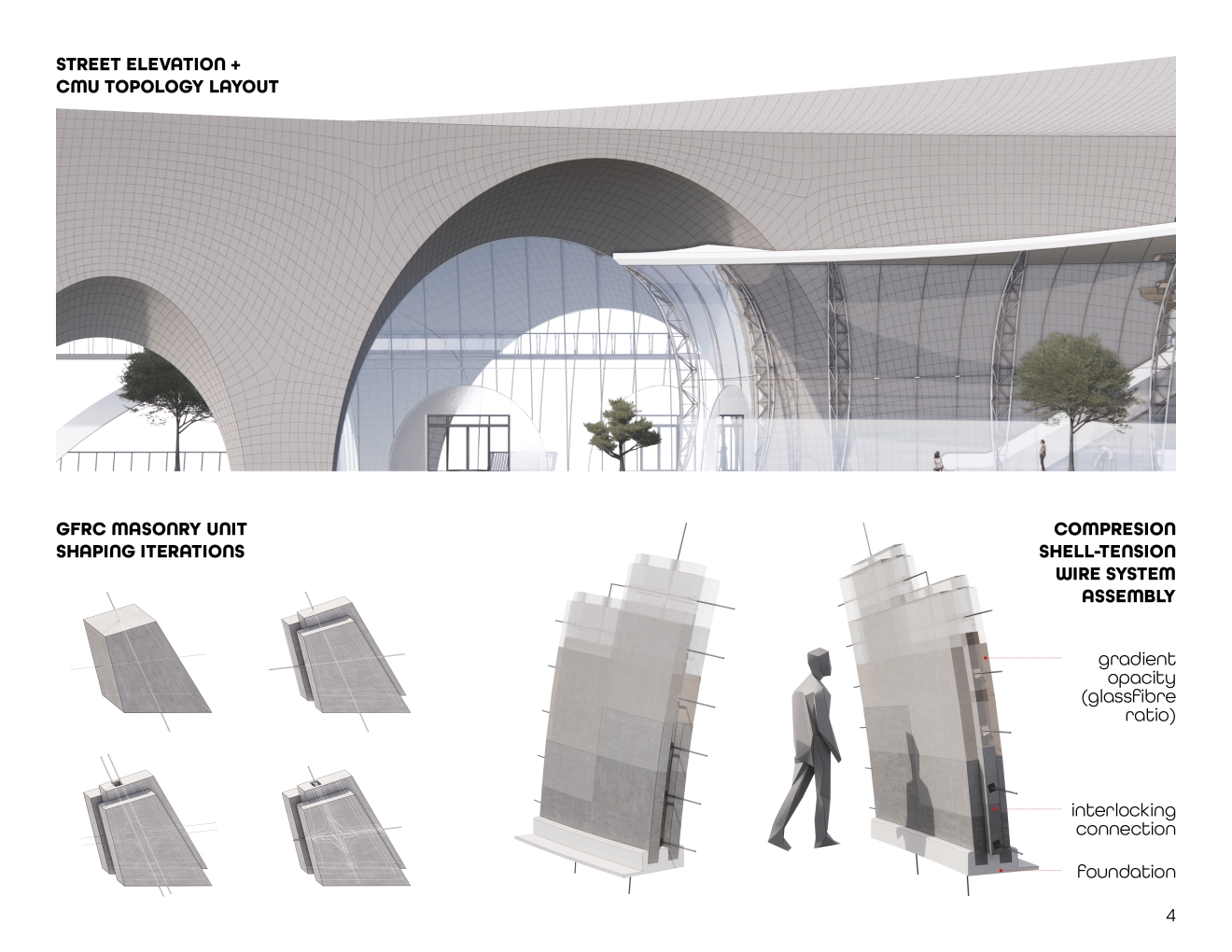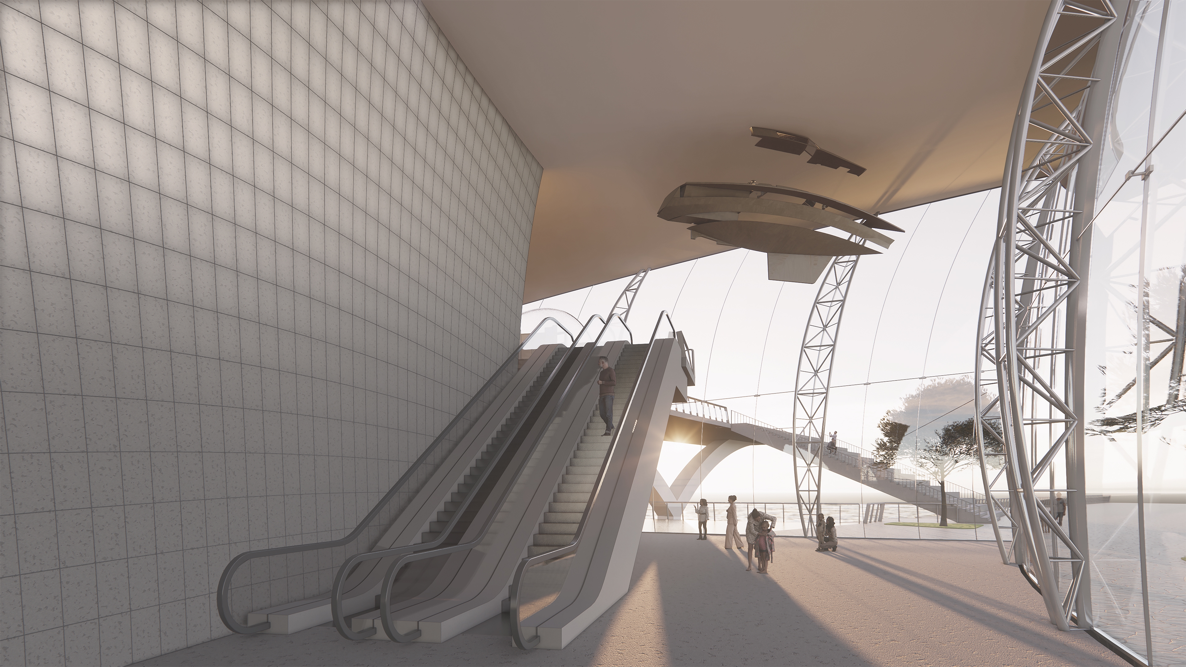 Buffalo, NY suffered from a severe winter storm in late 2022. A reliable disaster relief building is needed to prepare citizens for future severe colds. Ancient masonry structures that have stood in the weather for centuries provide new thinking for today's resilient architecture. Located at Erin Basin Marina, the Ark Hub celebrates the renowned local boat culture. The form of the building visually mimics the outstretched sails and is consistent with the traditionally enduring arches and vaults. The elevated entrance protects the arterial circulation from snow blockages, and the pedestrian bridge connecting to the surrounding urban contexts offers an accessible promenade. The main programs feature a multipurpose hall that transforms into a disaster relief assembly in case of blizzards and a waterfront lounge with a deck that encourages natural engagement. Other supporting programs include a retail store, a restaurant, a collaborative classroom, a wellness gym, a linear gallery, and two outdoor amphitheatres.
