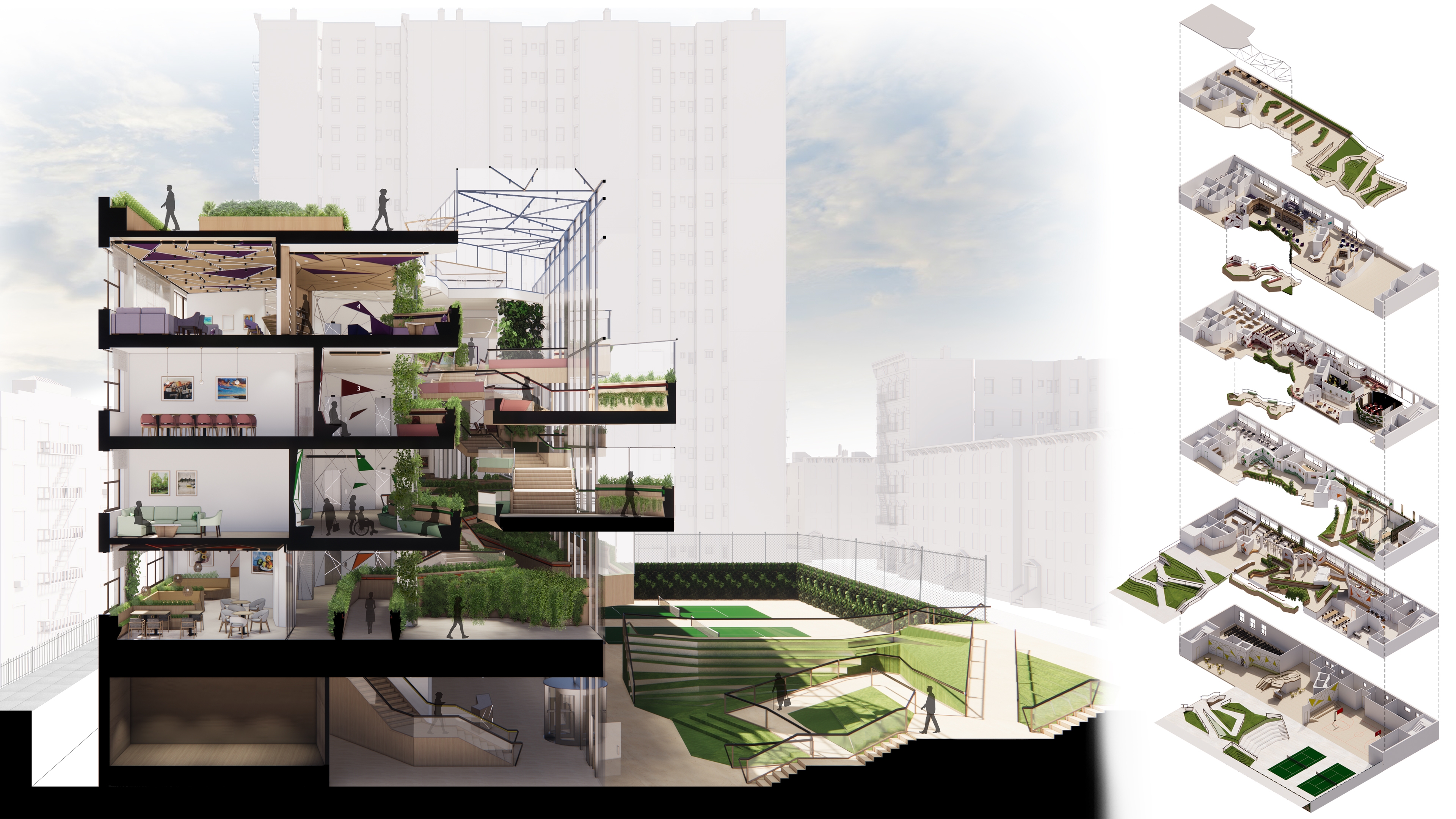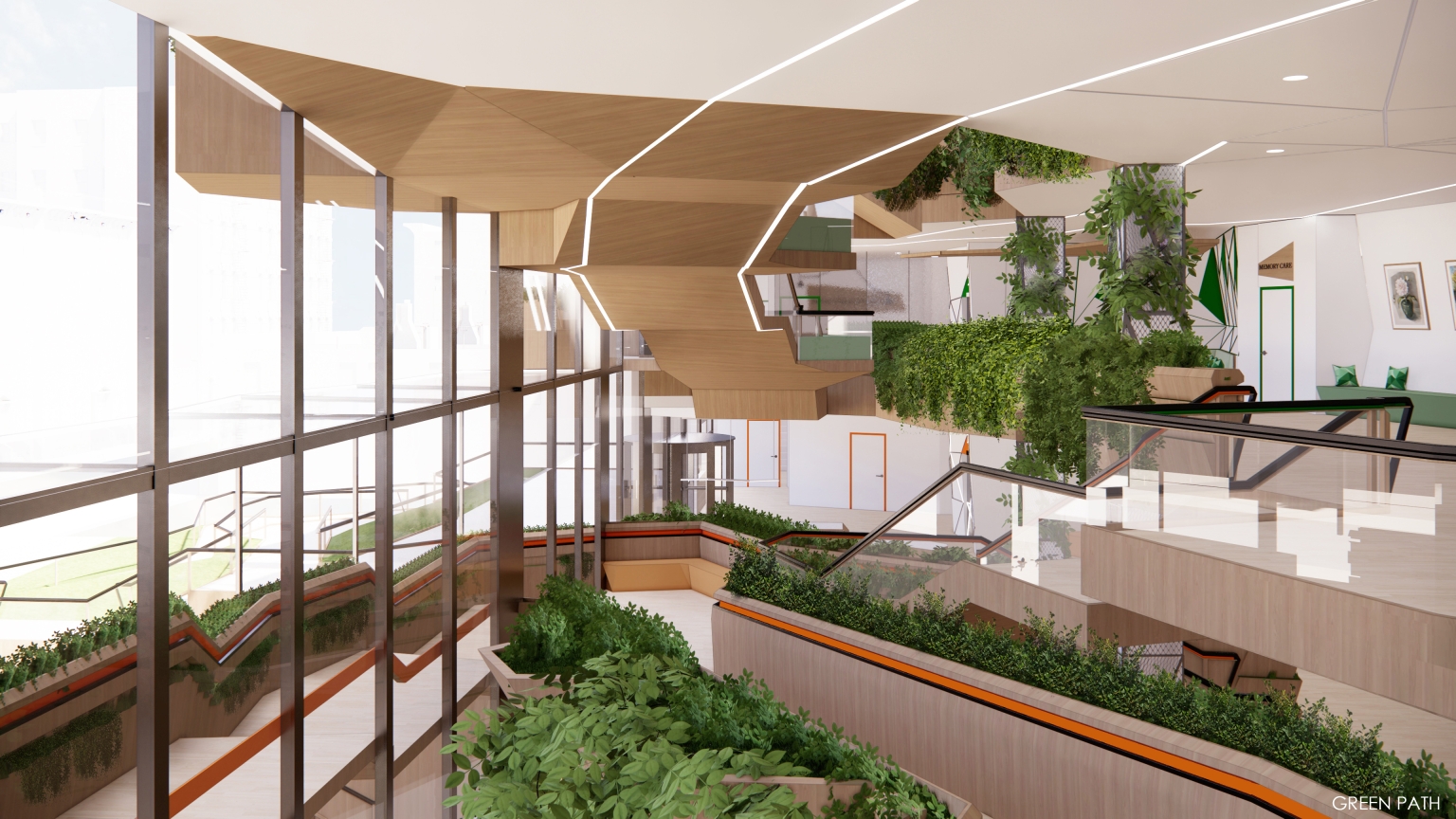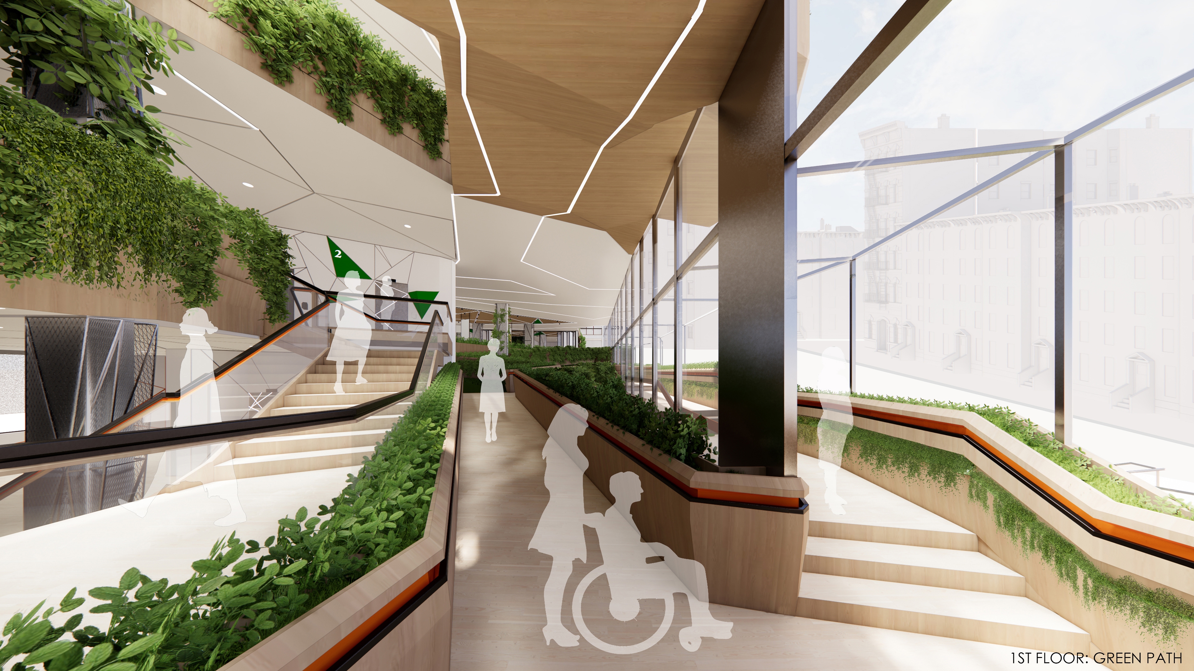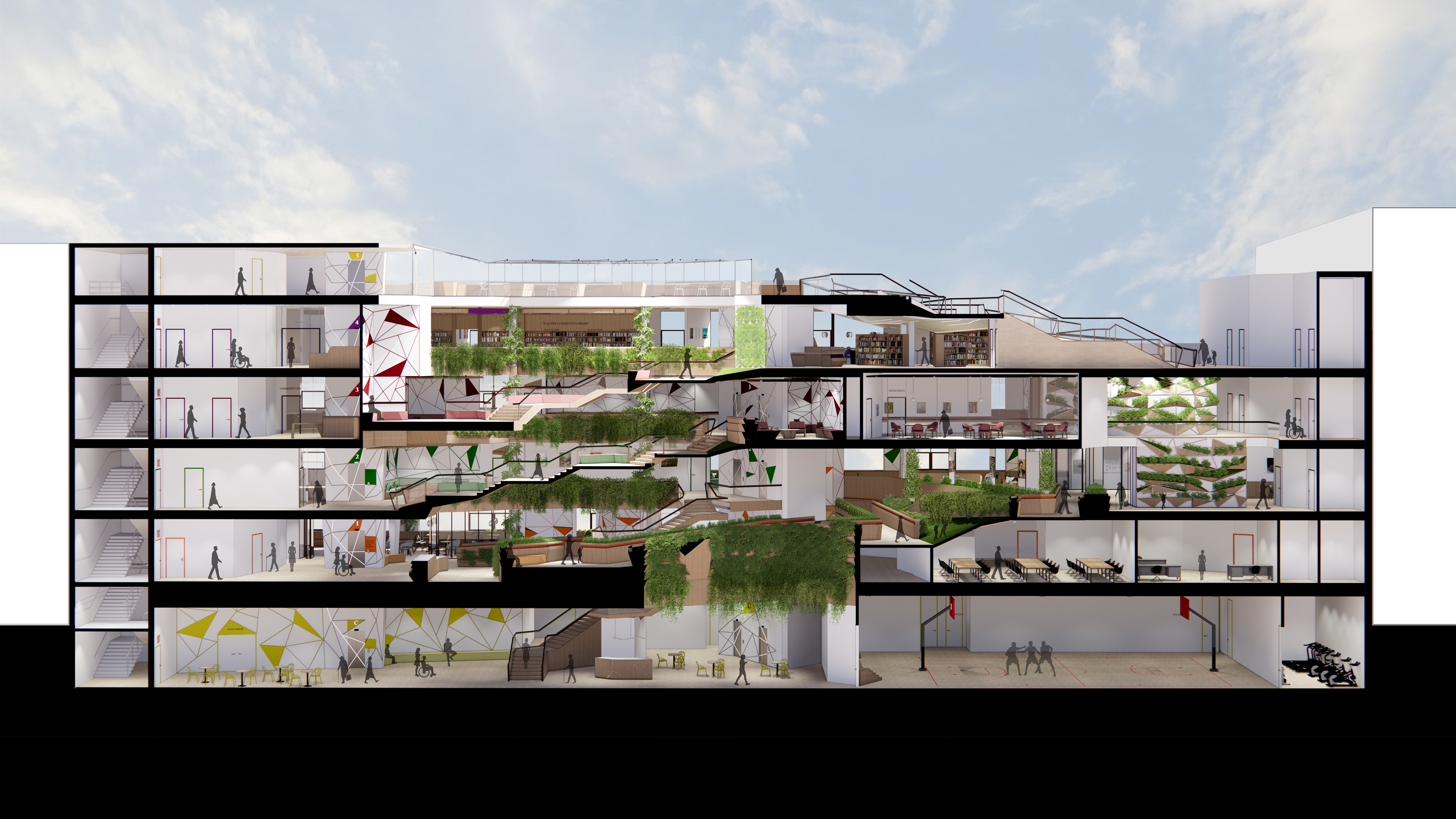 Wagner Senior Community Center brings together seniors and younger generations in a dynamic and youthful space. Similar to taking a walk in the park, visitors can access activity spaces on different floors which are connected via a green path that takes the form of ramps and stairs. The path allows seniors to be physically active and allows for social interactions and being with nature. The path forms the primary circulation route which connects all intergenerational and senior specific spaces together, enabling wayfinding, along with color coded finishes on different floors.