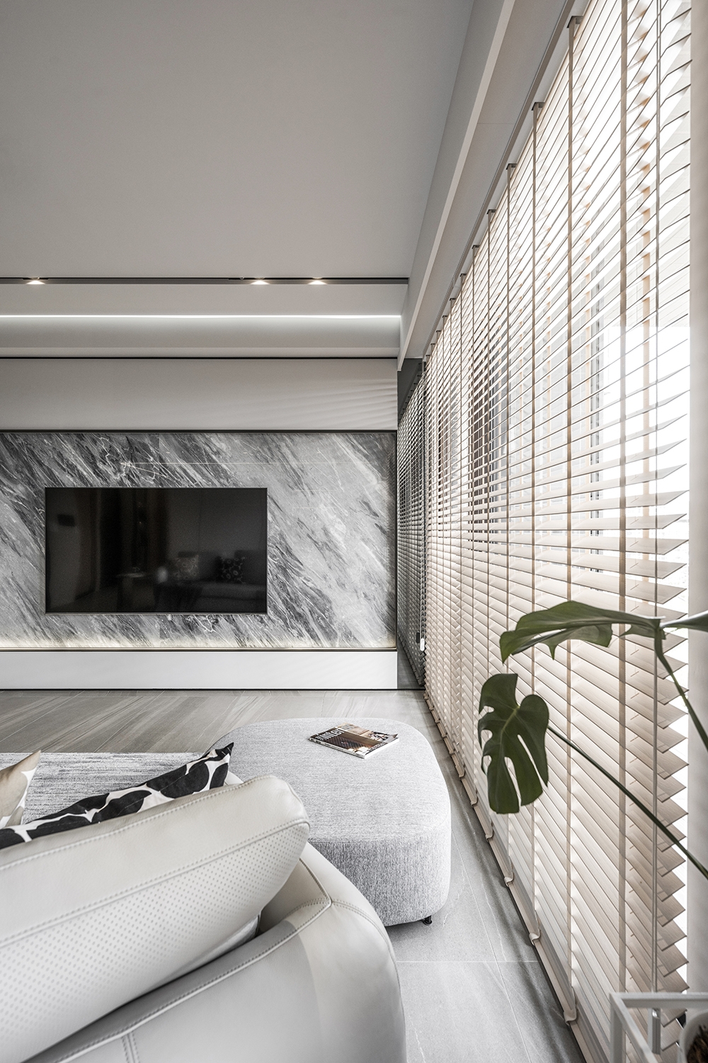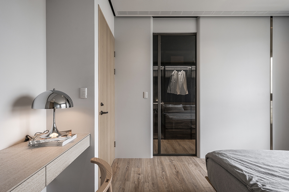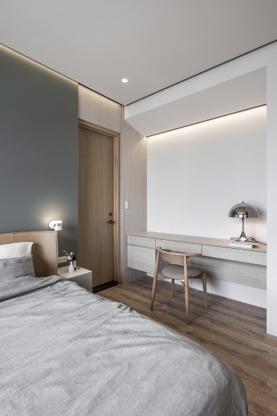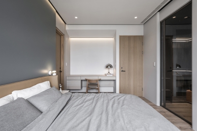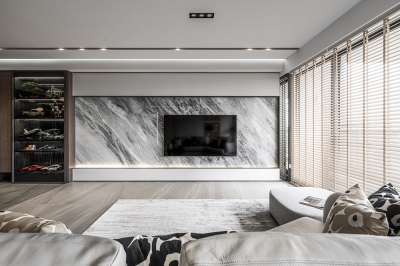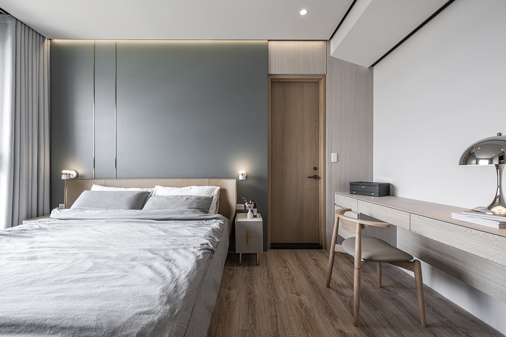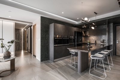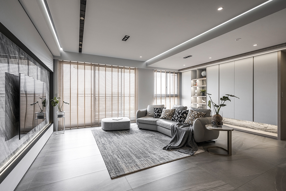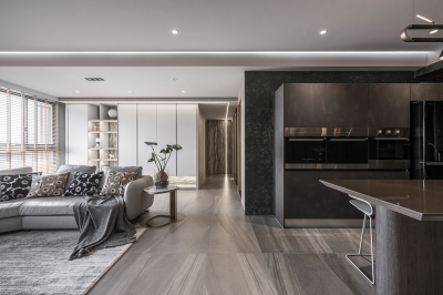 This modern minimalist interior design project perfectly blends aesthetics and functionality. The overall space is dominated by shades of gray, paired with dark wooden elements, creating a stylish yet comfortable atmosphere. The clever balance between dark and light tones runs through the entire public area, creating rich visual layers.