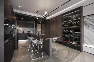 The color scheme demonstrates superb balancing skills. The dark wood elements contrast sharply with the light-colored walls and ceiling, yet coexist harmoniously. This contrast not only enhances the spatial layering but also creates a rich visual experience. The dark kitchen cabinets and the light-colored living room space reflect each other, distinguishing functional areas while maintaining overall harmony.