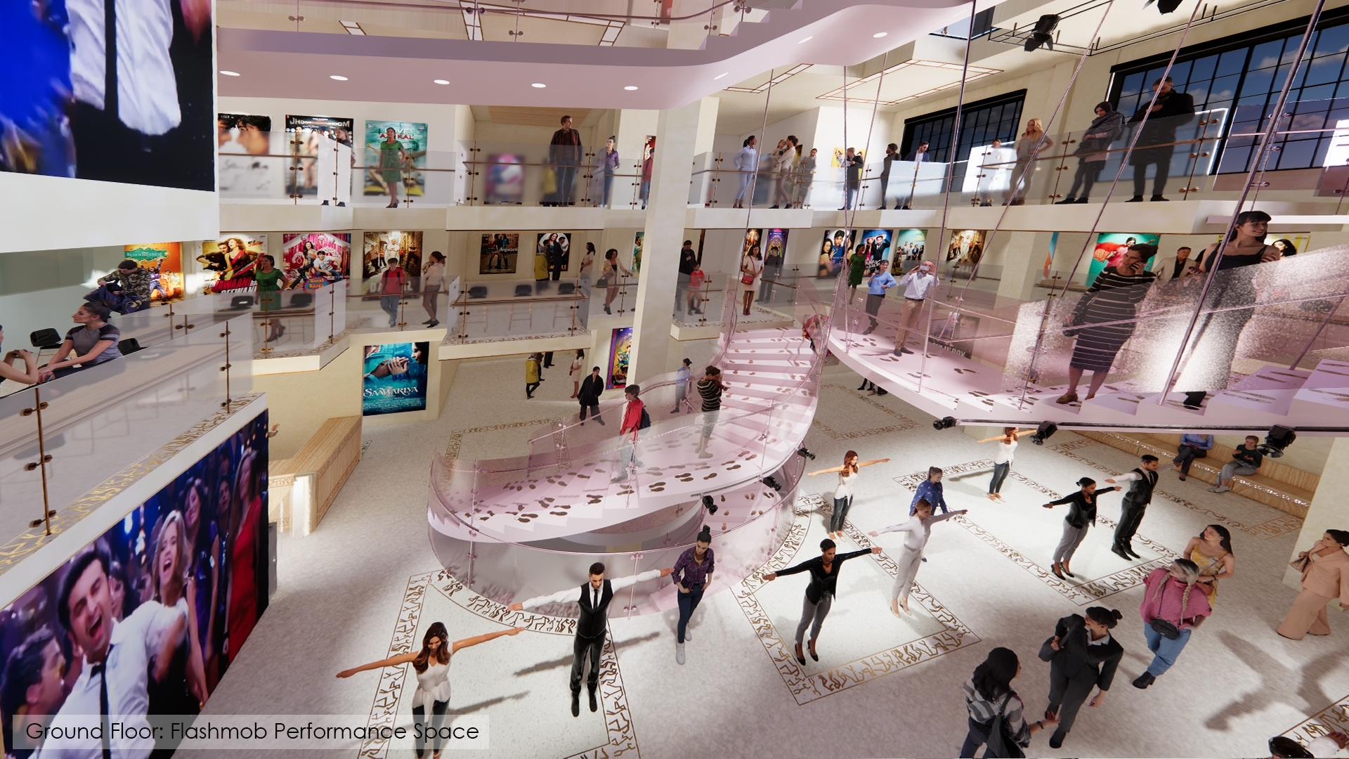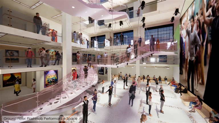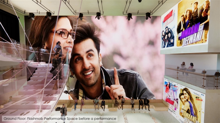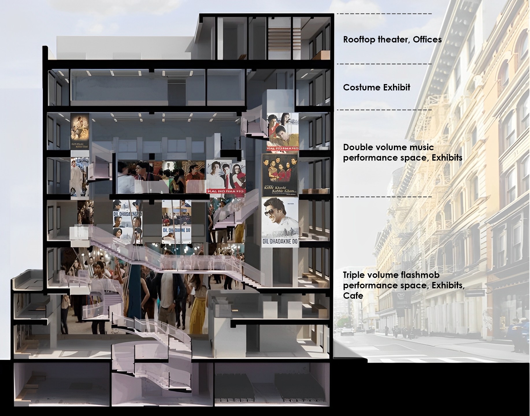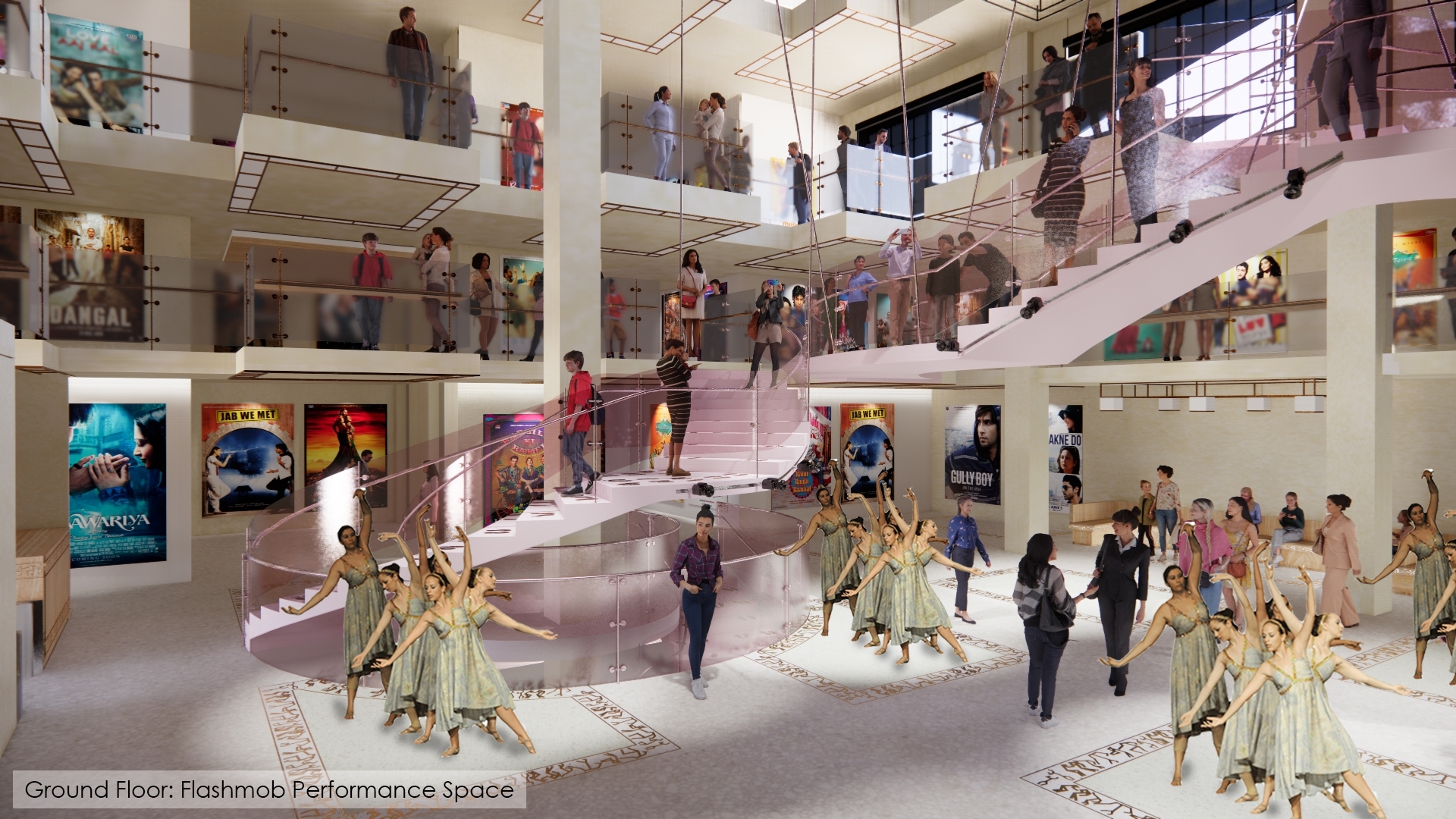 The Museum of Bollywood Musicals is the Manhattan branch of the Museum of the Moving Image in Queens. It is a celebration of the energy and vibrancy of musical sequences in Hindi cinema- the largest and oldest film industry. The project repurposes a parking garage building in midtown Manhattan, and challenges the "white box" stereotype of exhibition spaces through design and visitor involvement. The focal point of the museum is the dance performance space on the ground floor where flash mobs happen every hour. Visitors can spontaneously dance with the group, following the steps from the music video projected on the big screen. Dramatic, curving staircases cut through the triple volume space with dance steps patterned on their surfaces, which visitors can follow to the rhythm of the music. The museum also has a music performance space on the 4th floor, with live music performances matching the song that visitors would be dancing to on the ground floor. Exhibits include Bollywood through the years, set and costume design, and screening spaces. The programs, colours, and activity create an immersive experience and allows visitors to dive into the spectacular world of Bollywood.