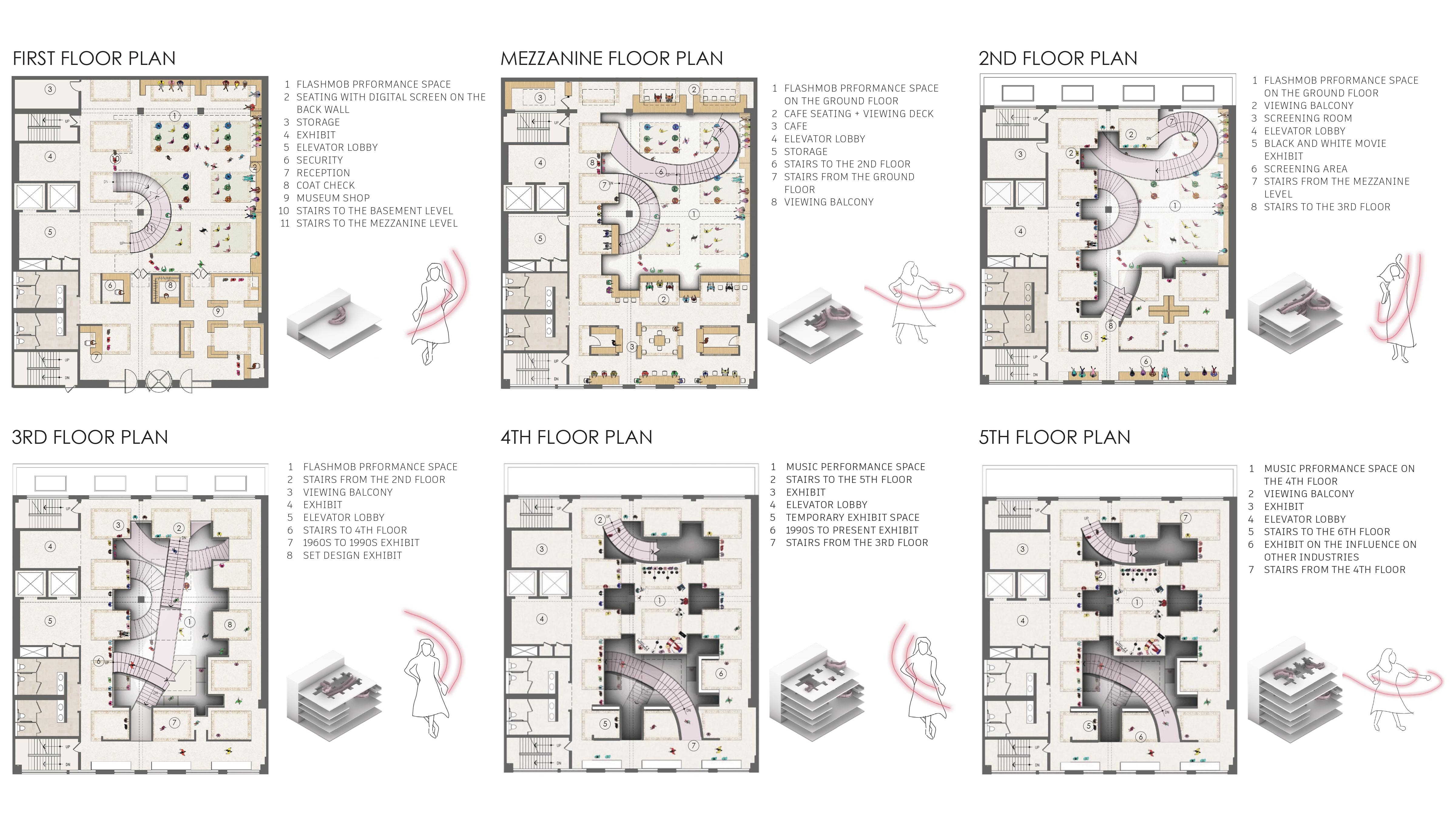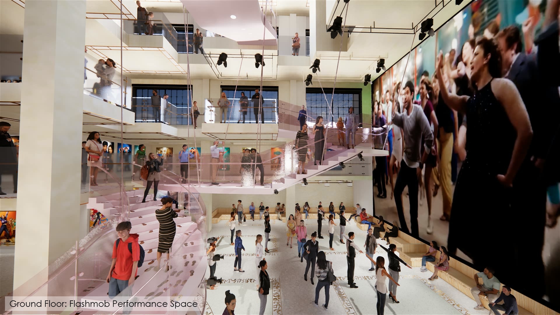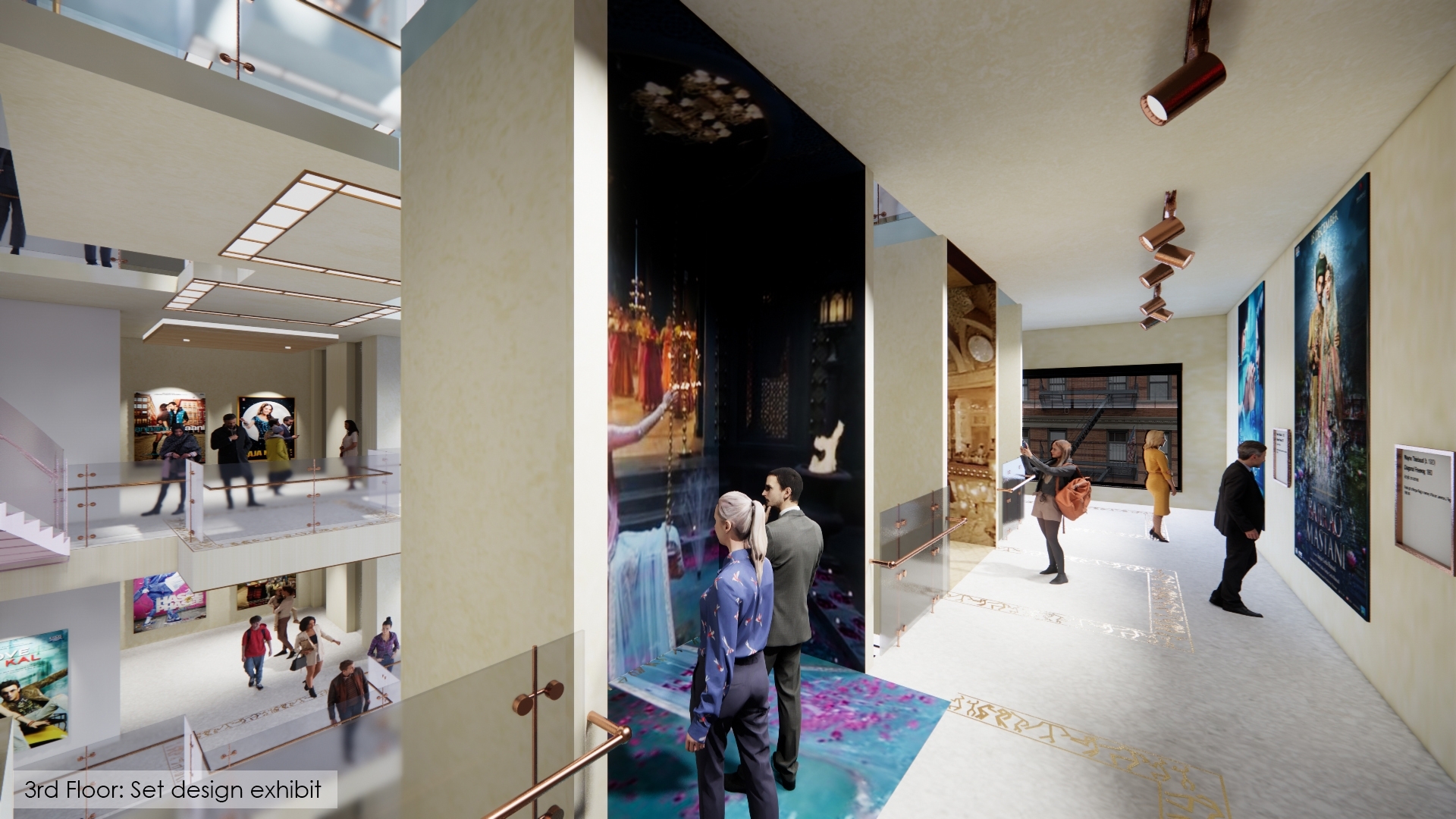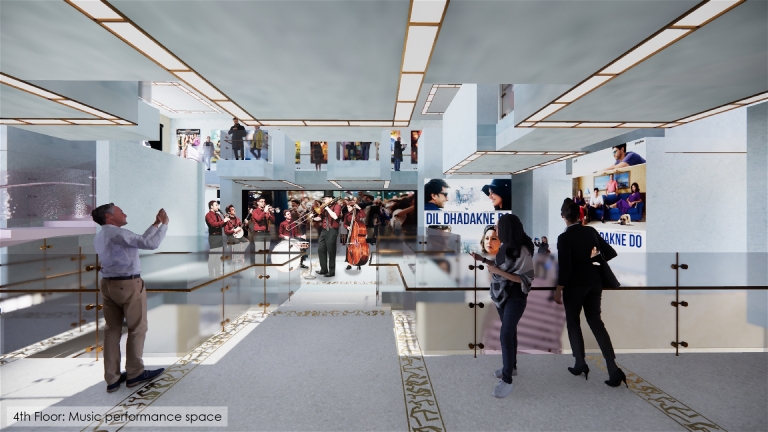 The Museum of Bollywood Musicals is the Manhattan branch of the Museum of the Moving Image in Queens. It is a celebration of the energy and vibrancy of musical sequences in Hindi cinema- the largest and oldest film industry. The project repurposes a parking garage building in midtown Manhattan, and challenges the "white box" stereotype of exhibition spaces through design and visitor involvement. The focal point of the museum is the dance performance space on the ground floor where flash mobs happen every hour. Visitors can spontaneously dance with the group, following the steps from the music video projected on the big screen. Dramatic, curving staircases cut through the triple volume space with dance steps patterned on their surfaces, which visitors can follow to the rhythm of the music. The museum also has a music performance space on the 4th floor, with live music performances matching the song that visitors would be dancing to on the ground floor. Exhibits include Bollywood through the years, set and costume design, and screening spaces. The programs, colours, and activity create an immersive experience and allows visitors to dive into the spectacular world of Bollywood.