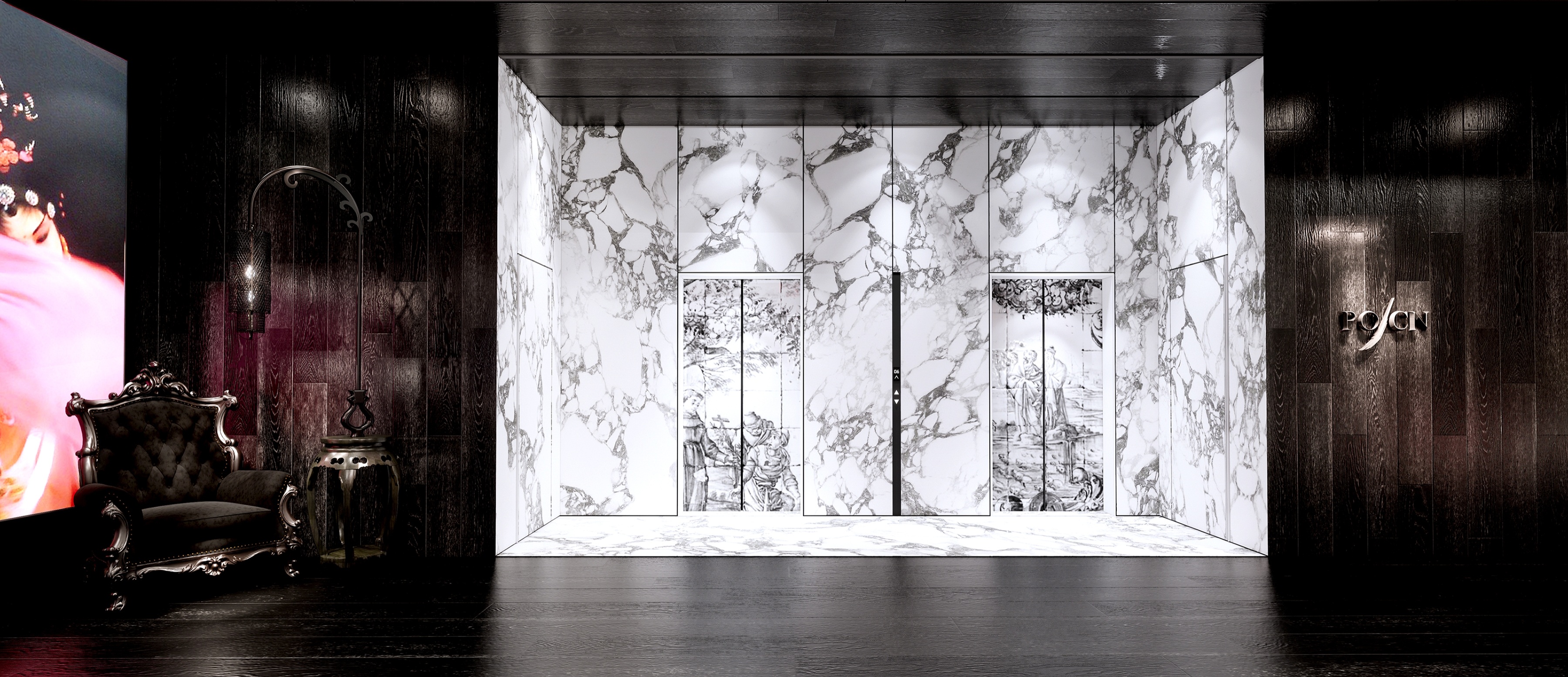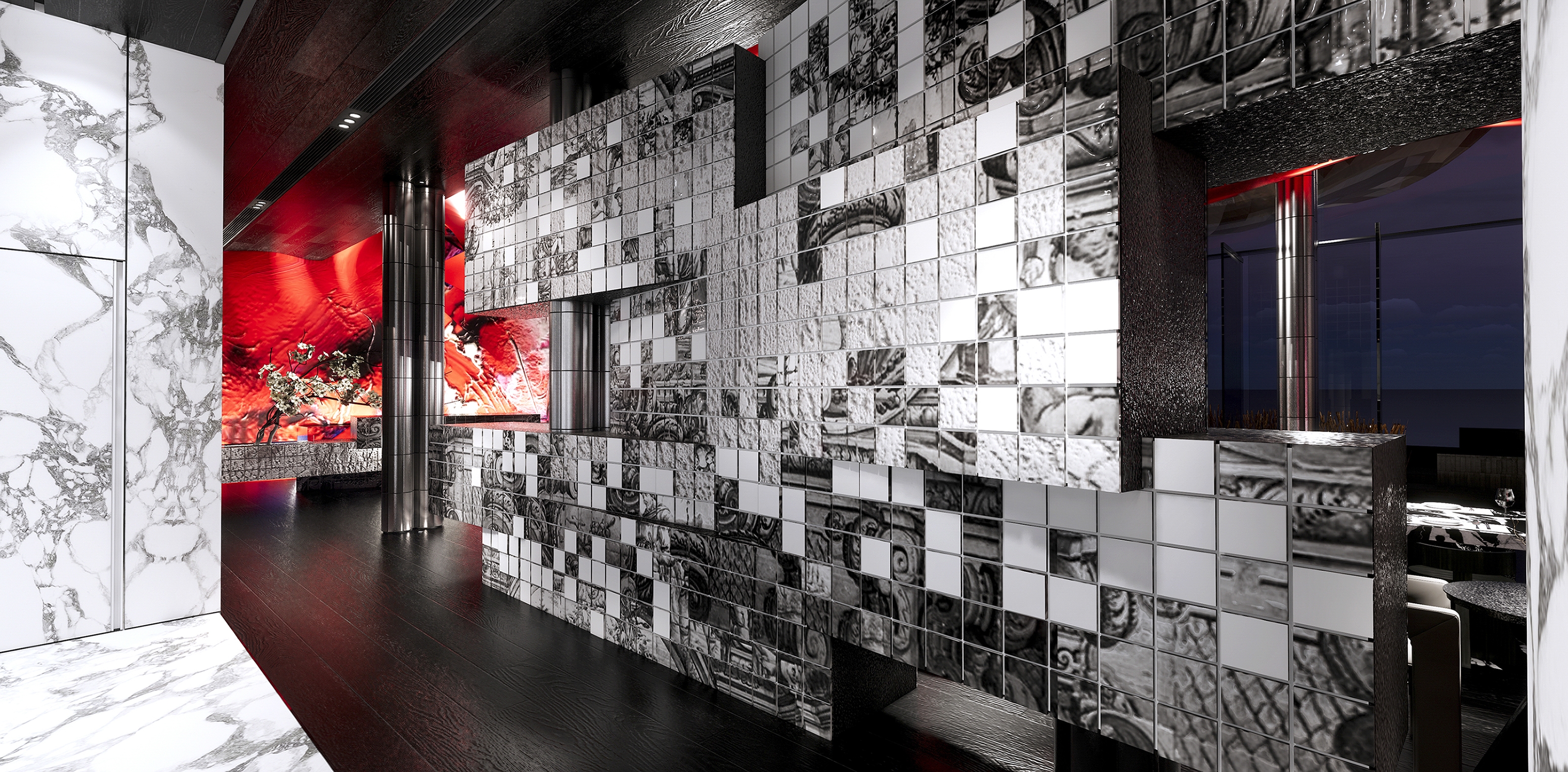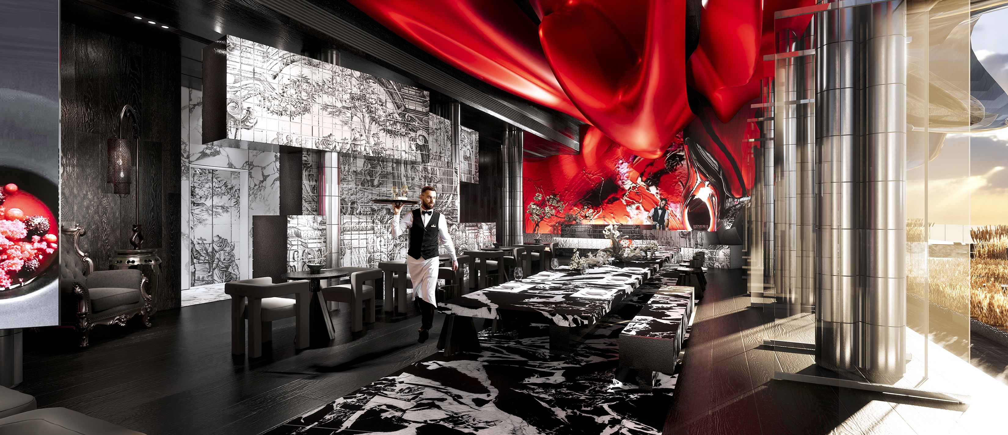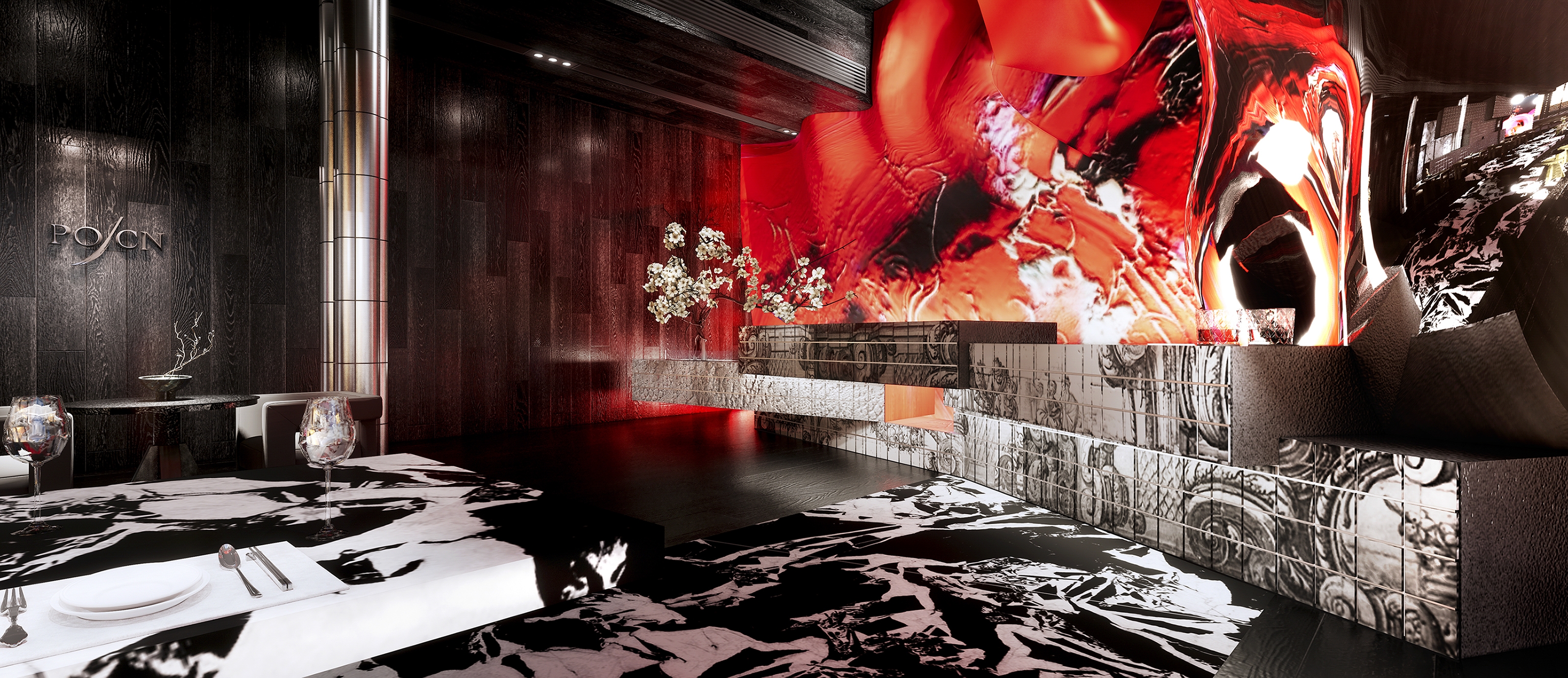 Nestled on the 10th floor in suburban Shanghai lies POCN, a restaurant fusing Guangdong and Porto flavors. Upon entering the polished marble foyer lined with azulejos tileworks dancing in abstract patterns. Beyond lies a crimson universe beckoning guests into a captivating theatrical stage, with bold red drapes like costumes from Guangdong opera daringly crossing the high ceiling with acoustic panels cleverly concealed behind, bridging tradition and culture with futuristic contours.