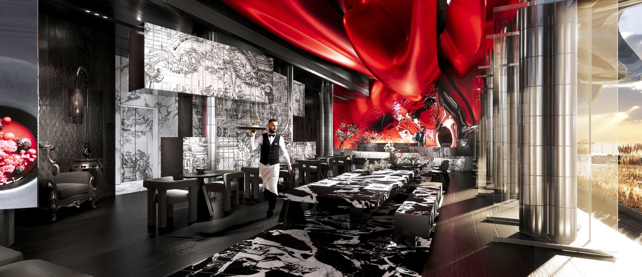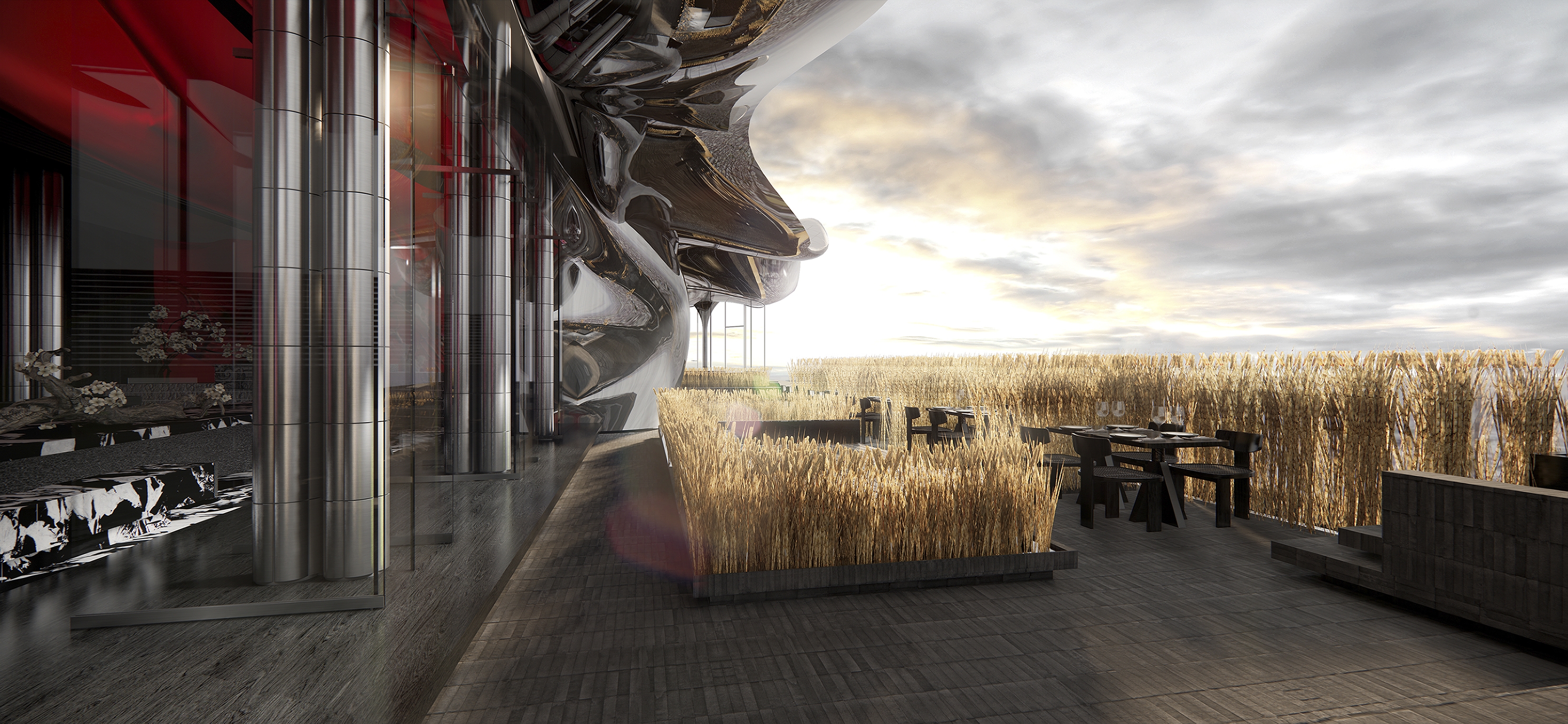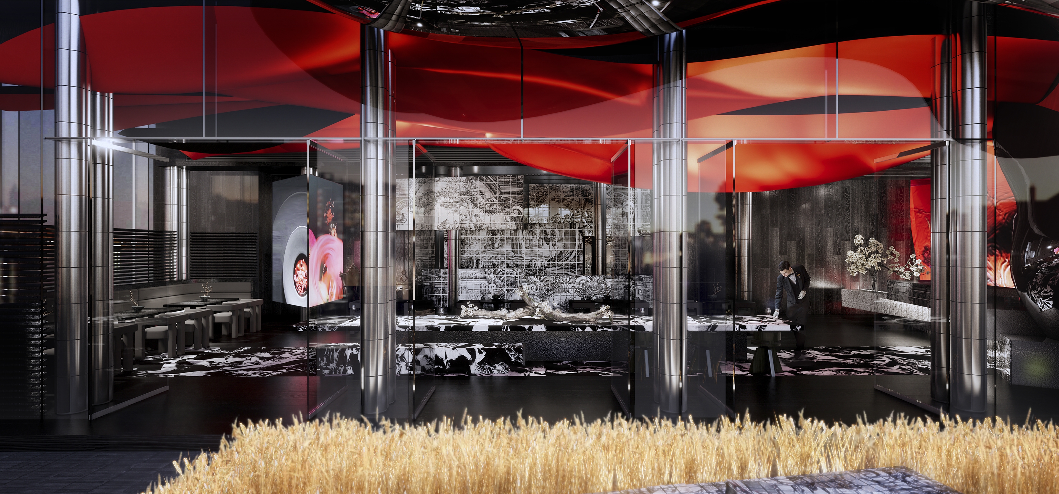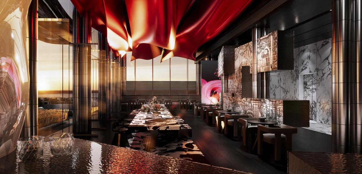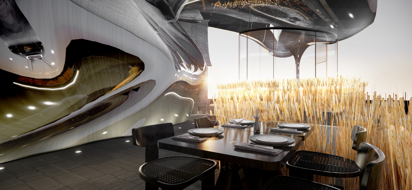 Stepping outside, guests find themselves transported to an outdoor stage of undulating golden wheat and blending of Chinese brickwork and sleek metal shades offering contrasting textures. At POCN, all senses awaken to new dimensions where tradition inspires futurism and boundaries between art, architecture and dining dissolve into singular multi-sensory journey.