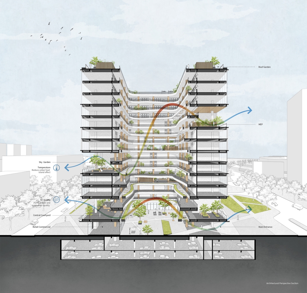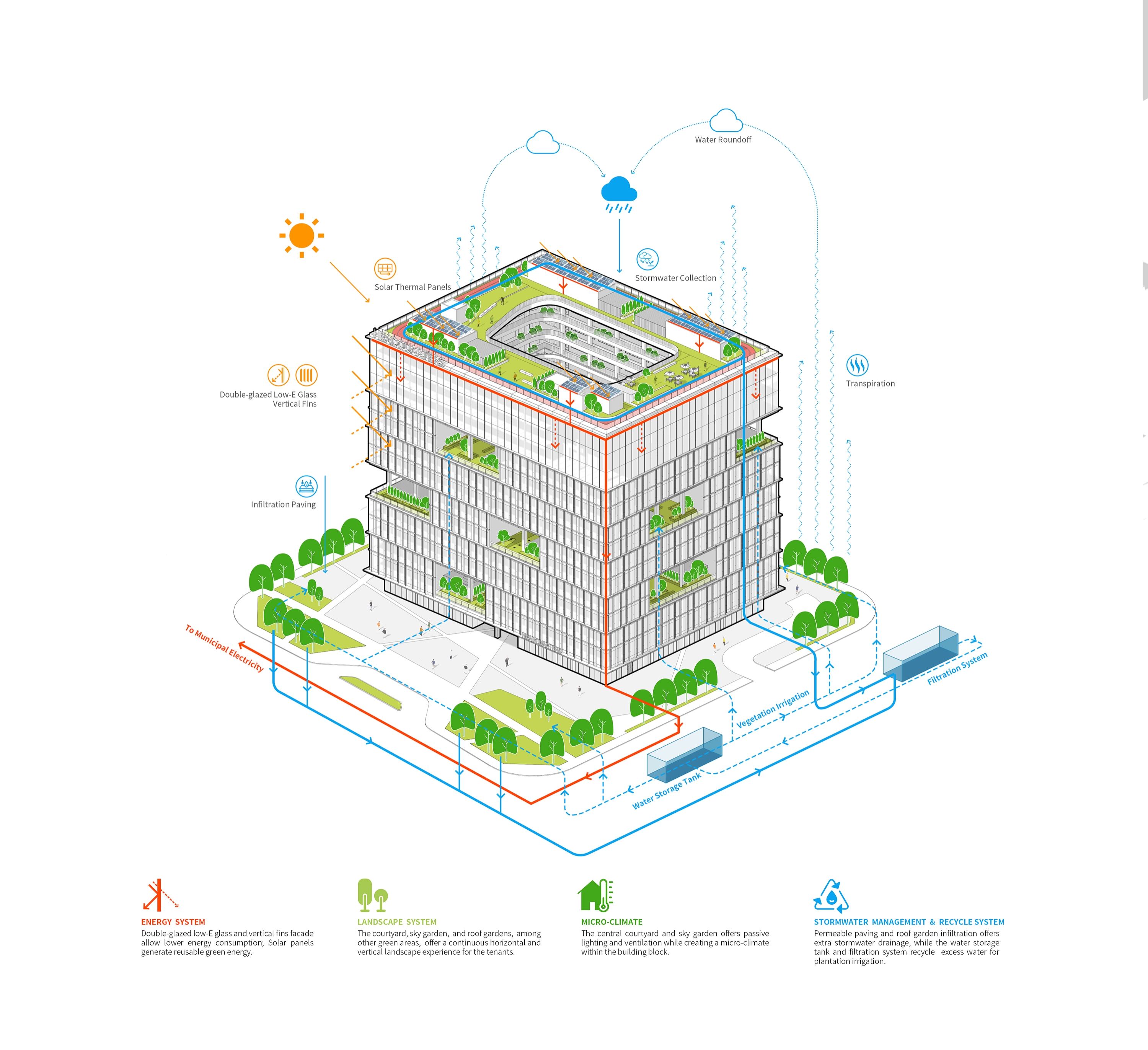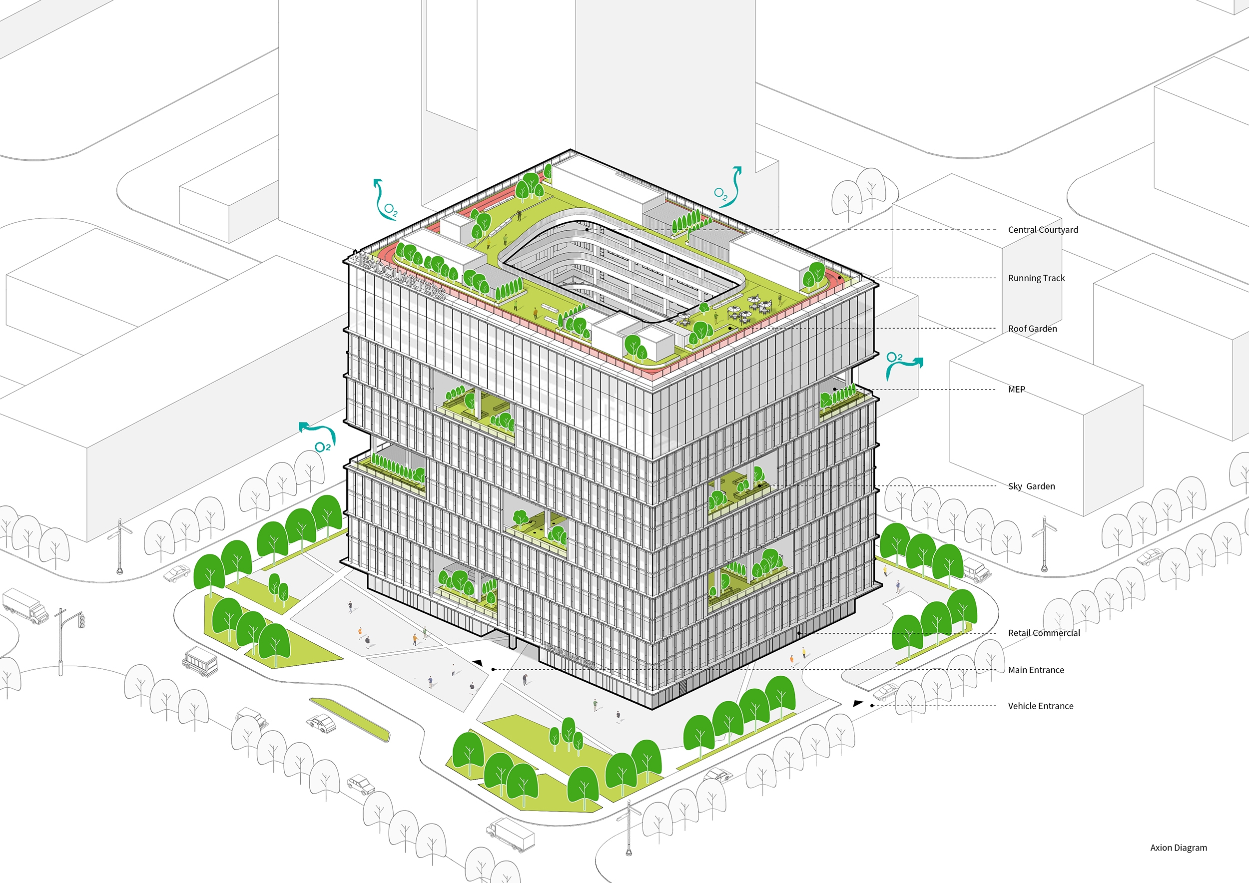 The building takes "ecology" and "agriculture" as its core, creating a green and comfortable office environment through the concept of an "ecological garden." The design increases the potential for communication in public areas and breaking the closedness and monotony of traditional office buildings. The fourteen-story structure is a hollow rectangle, featuring a green public area—a sky garden on each floor.Connected to an atrium that reduces the building's energy consumption. This design provides a diverse spatial experience and an open communication environment while improving natural ventilation and lighting, thereby reducing electricity consumption. Using crops for atrium greening not only fulfills experimental functions but also creates an eco-agricultural atmosphere. The indoor stacked platform curves resemble green terraces, with plants extending from the ground to the roof, forming a complete ecosystem that elevates the visual experience and air quality. The external double-layer curtain wall, paired with aluminum blinds, ensures heat insulation and shading, further reducing energy consumption and carbon emissions.